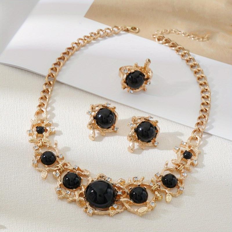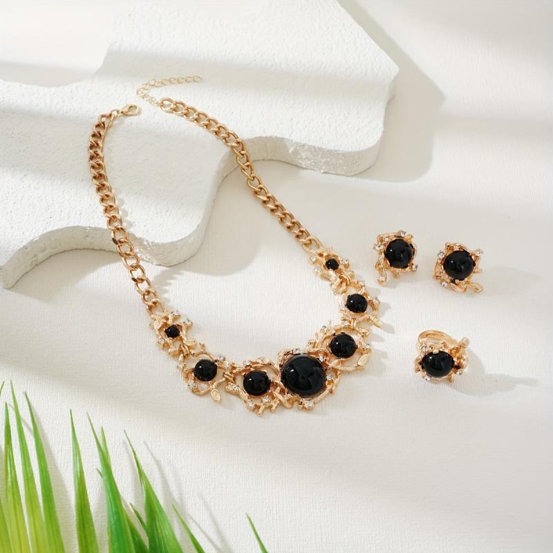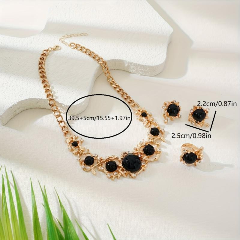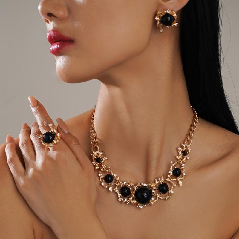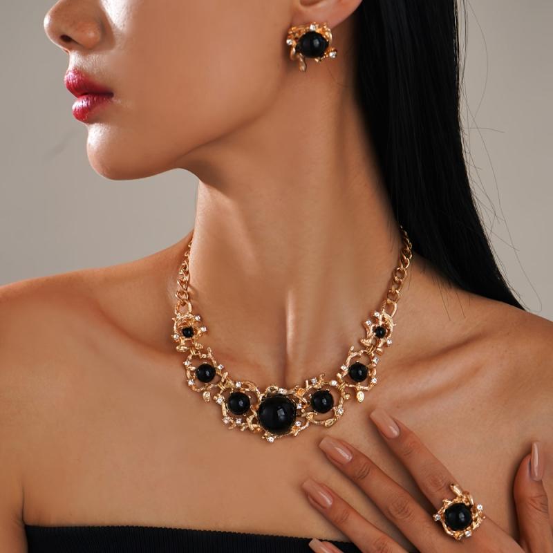 This stunning women's jewelry set features a rhinestone embellished metal vine with a gradient stone arrangement. The set includes a necklace, earrings, and chain.