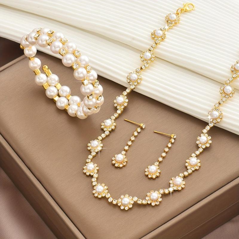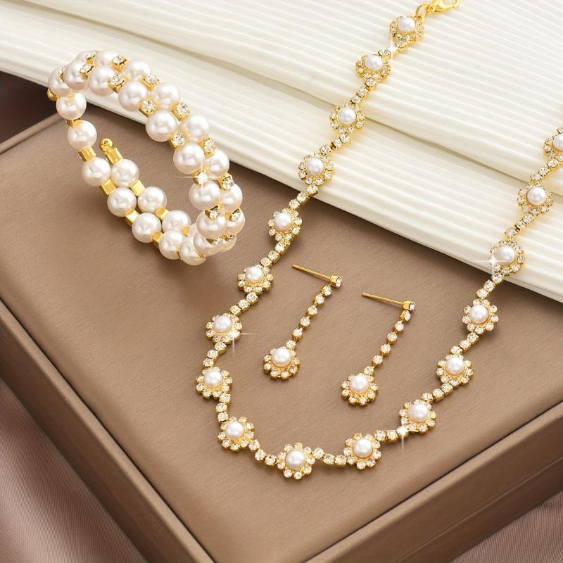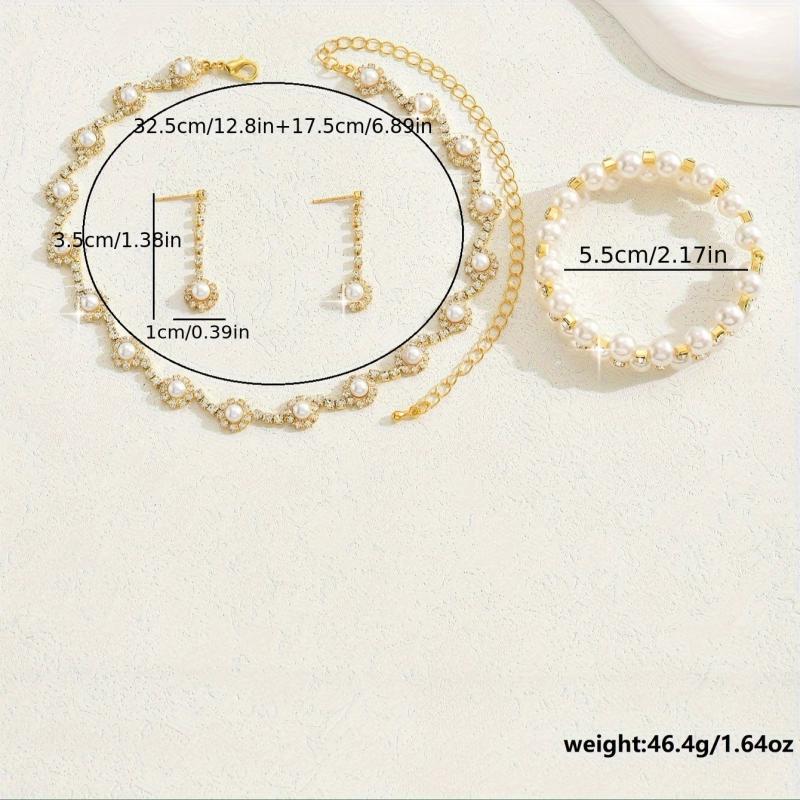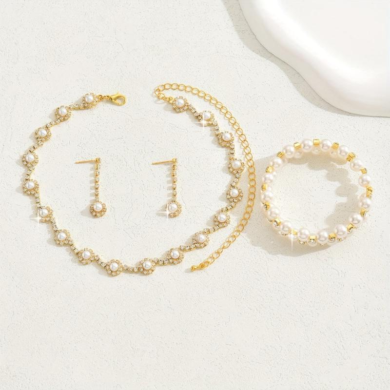 Complete your look with this elegant three-piece set featuring a necklace, earrings, and bracelet. The silver-plated design with rhinestone inlay adds a touch of glamour to both party and casual outfits. This versatile set is perfect for all seasons.