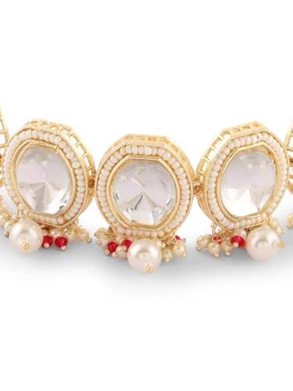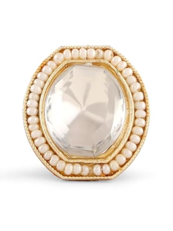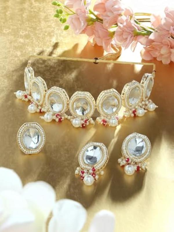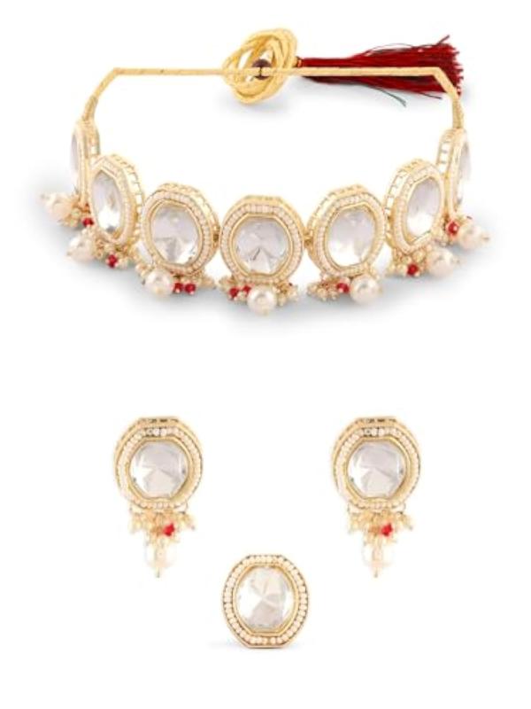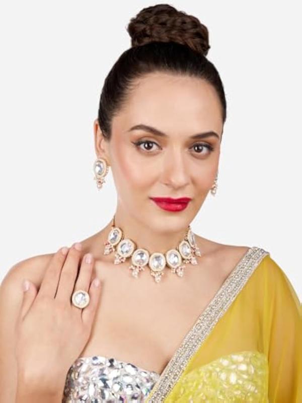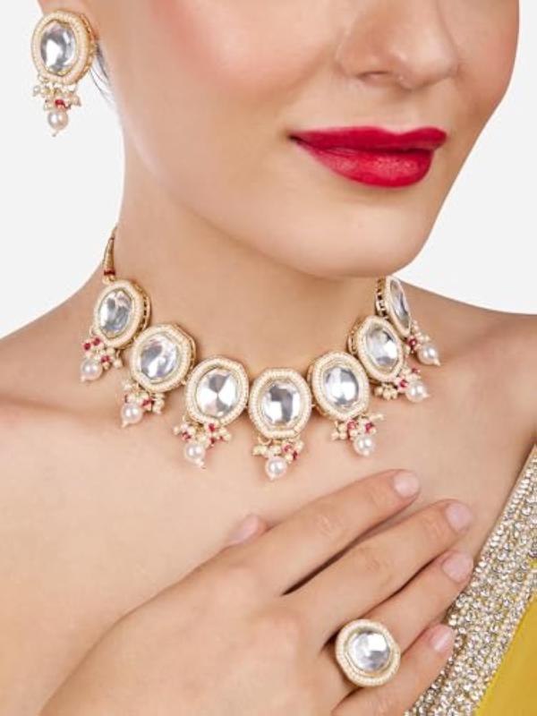Elegant necklace, earring, and ring set crafted with artificial stones and beads for a sophisticated look.