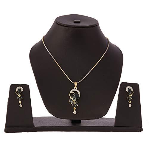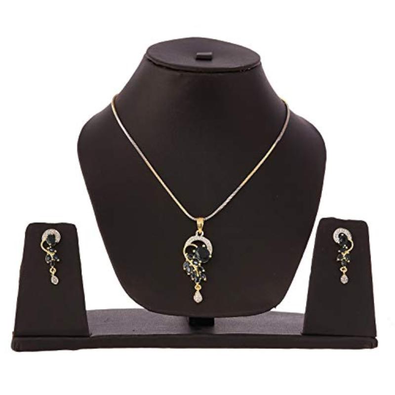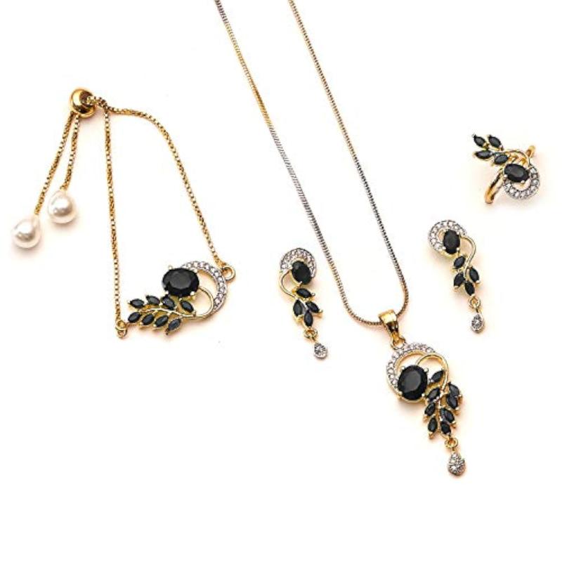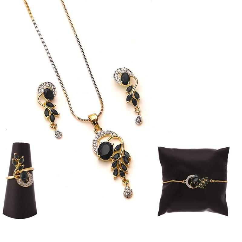 Complete your traditional look with this exquisite AD jewellery set that includes a necklace, pendant, ring, bracelet, and earrings.