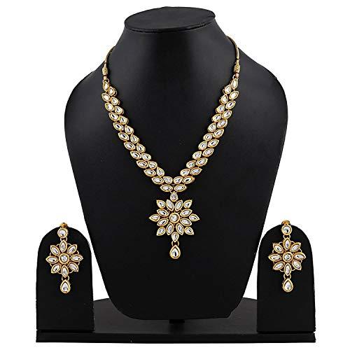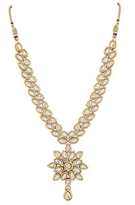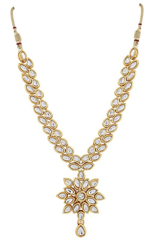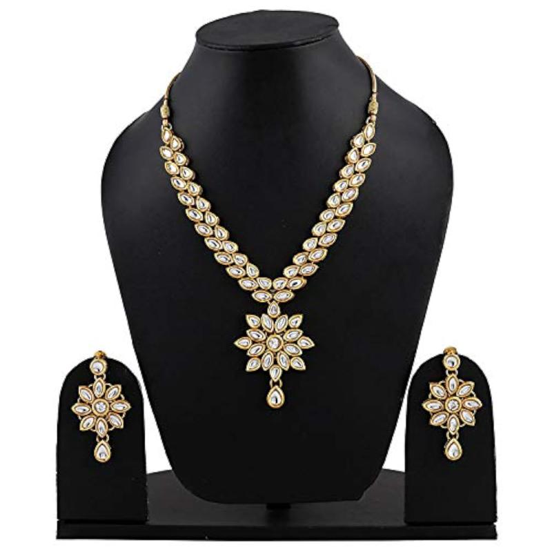 Enhance your ethnic look with this stunning jewelry set featuring intricate kundan work. Perfect for special occasions.