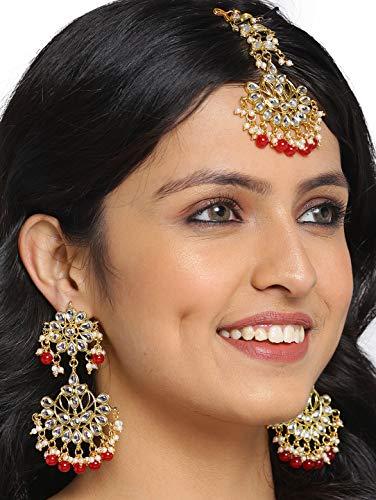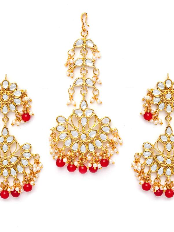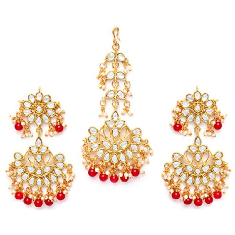 Elegant set featuring a maang tikka and earrings adorned with traditional kundan stones. Perfect for adding a touch of traditional charm to your ensemble.