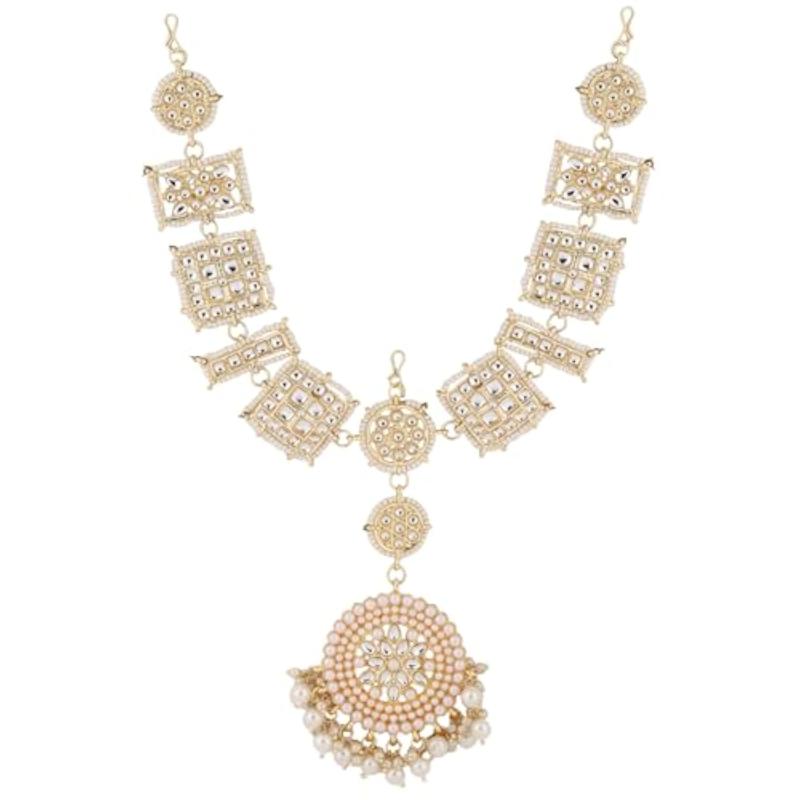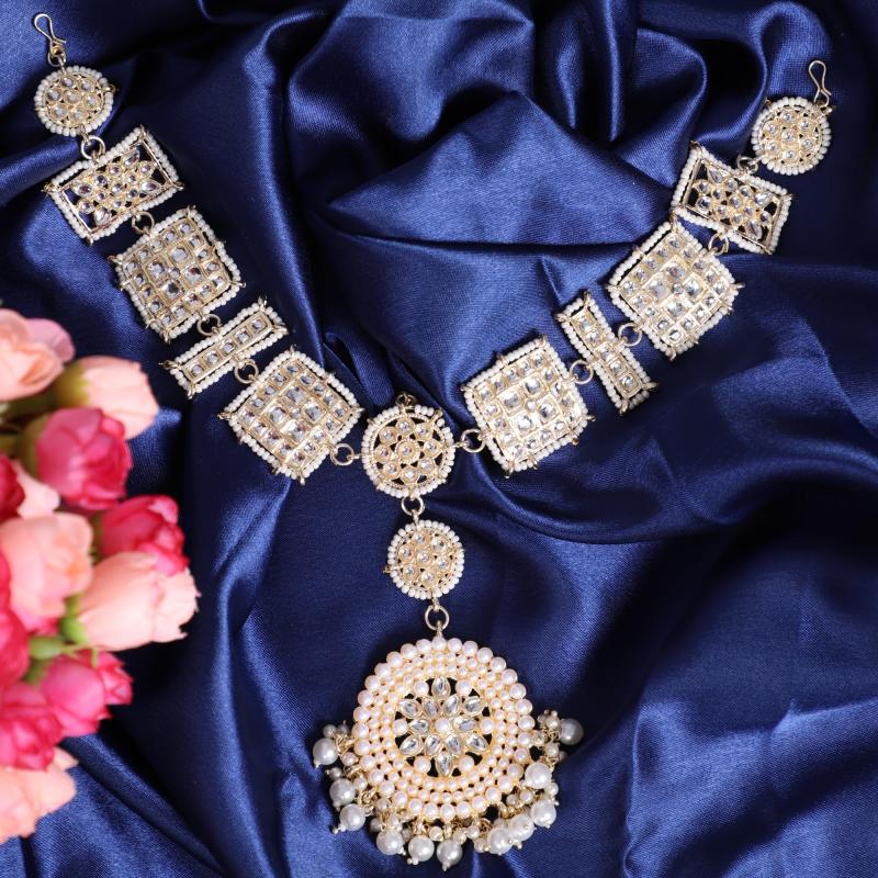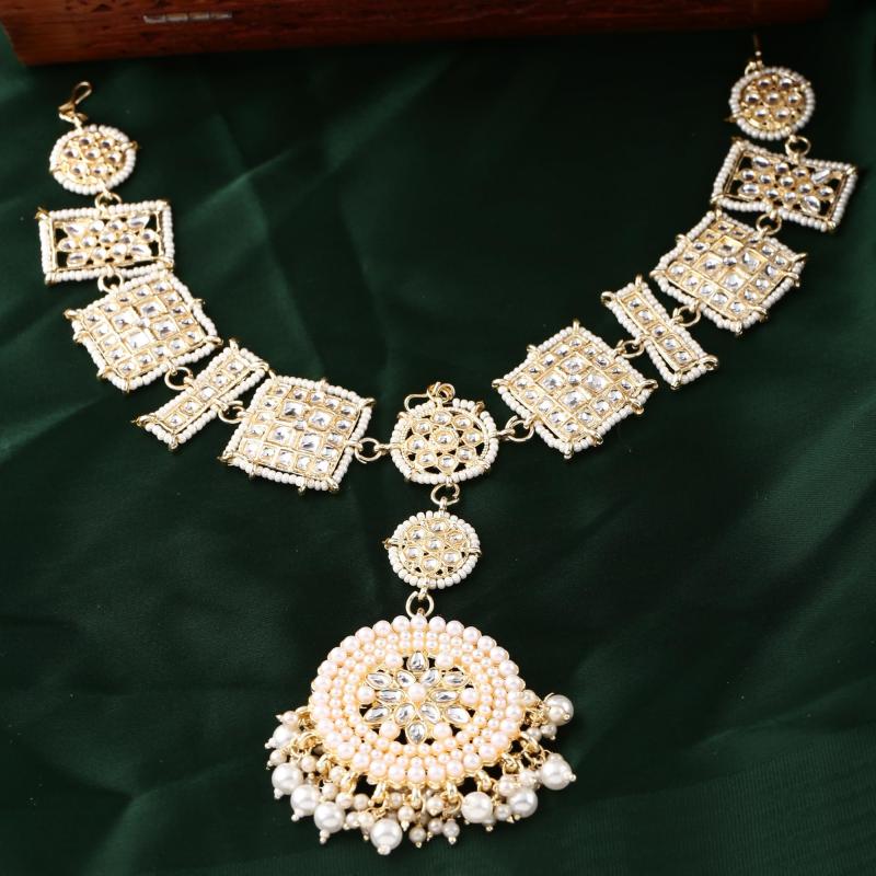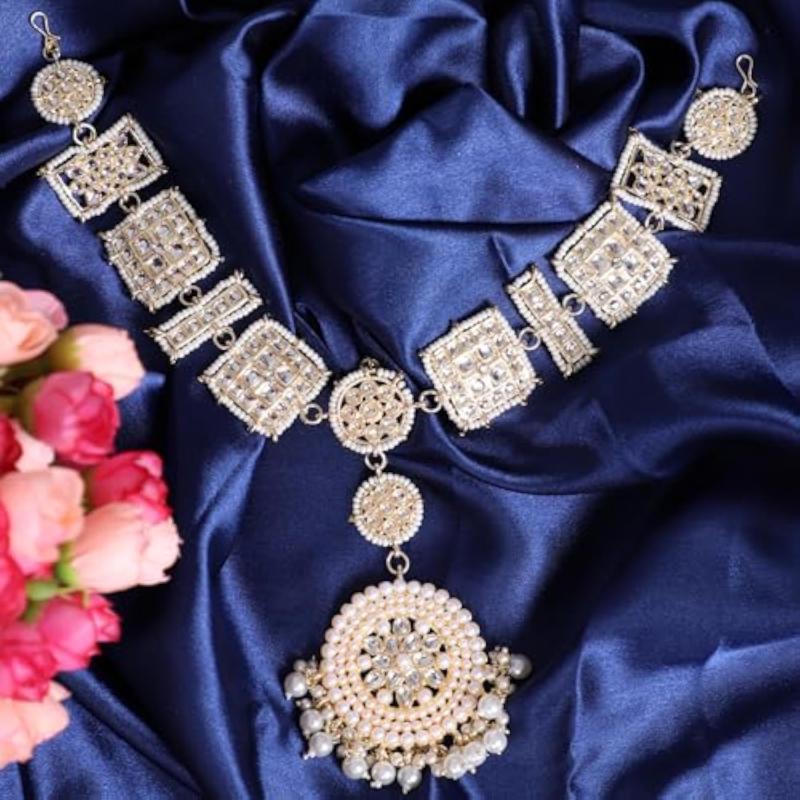 Elevate your ethnic look with this stunning Kundan Sheeshphool Maang Tikka Matha Patti. Perfect for weddings, parties, and special occasions.
