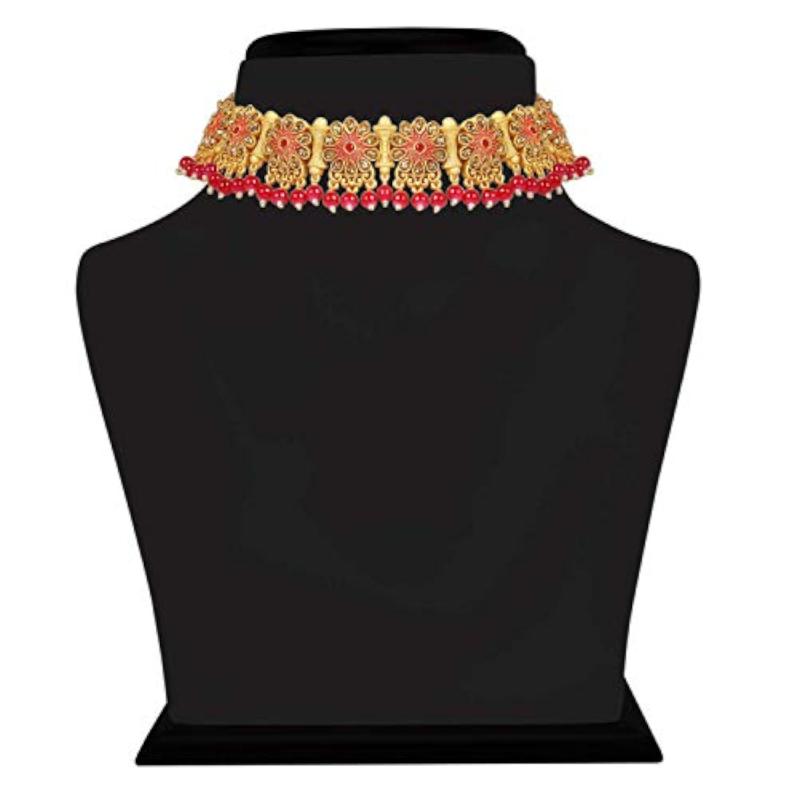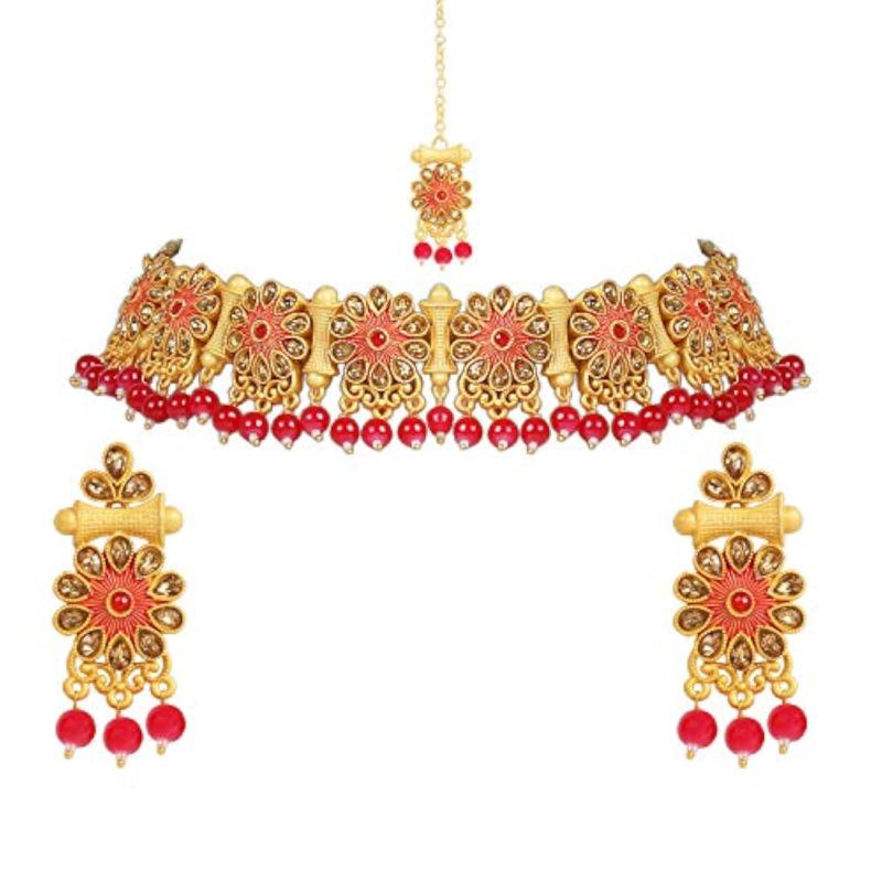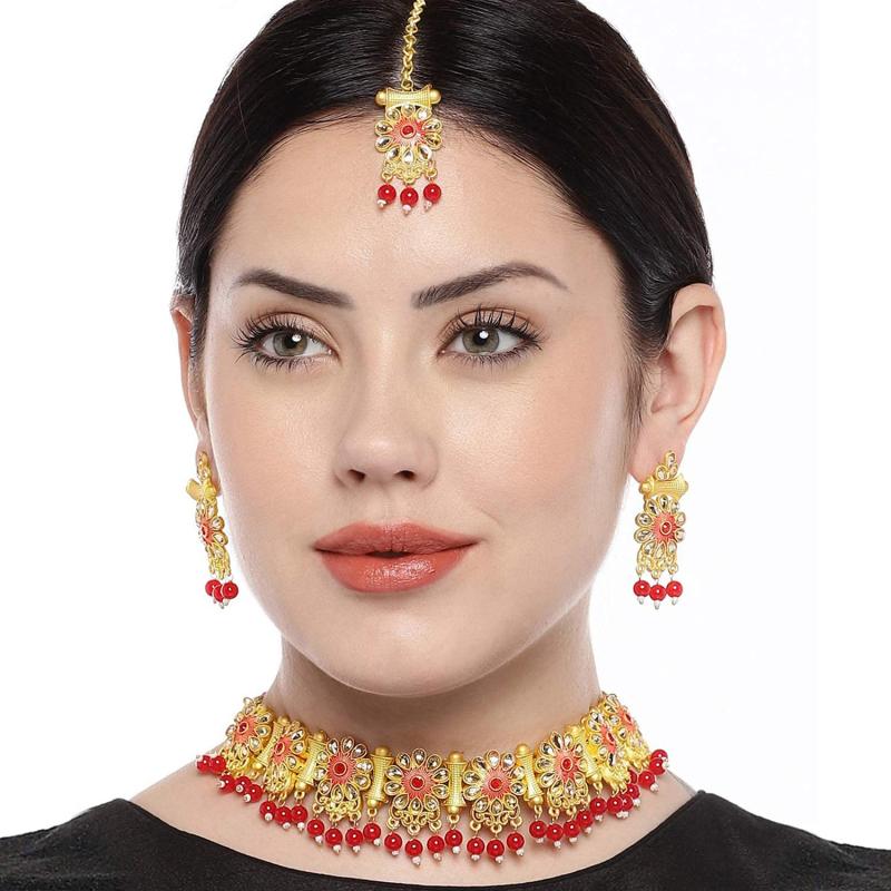 Elegant jewelry set featuring a kunzite pearl necklace, matching earrings, and a maang tikka. Perfect for traditional occasions.