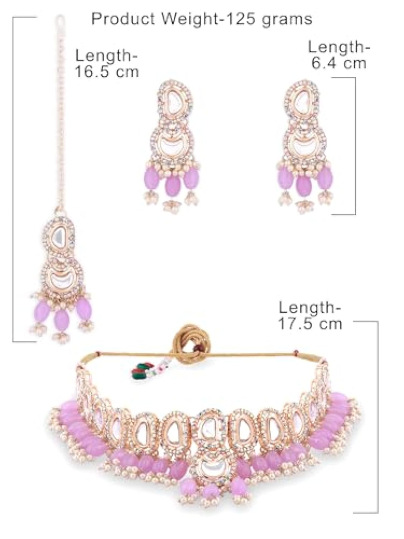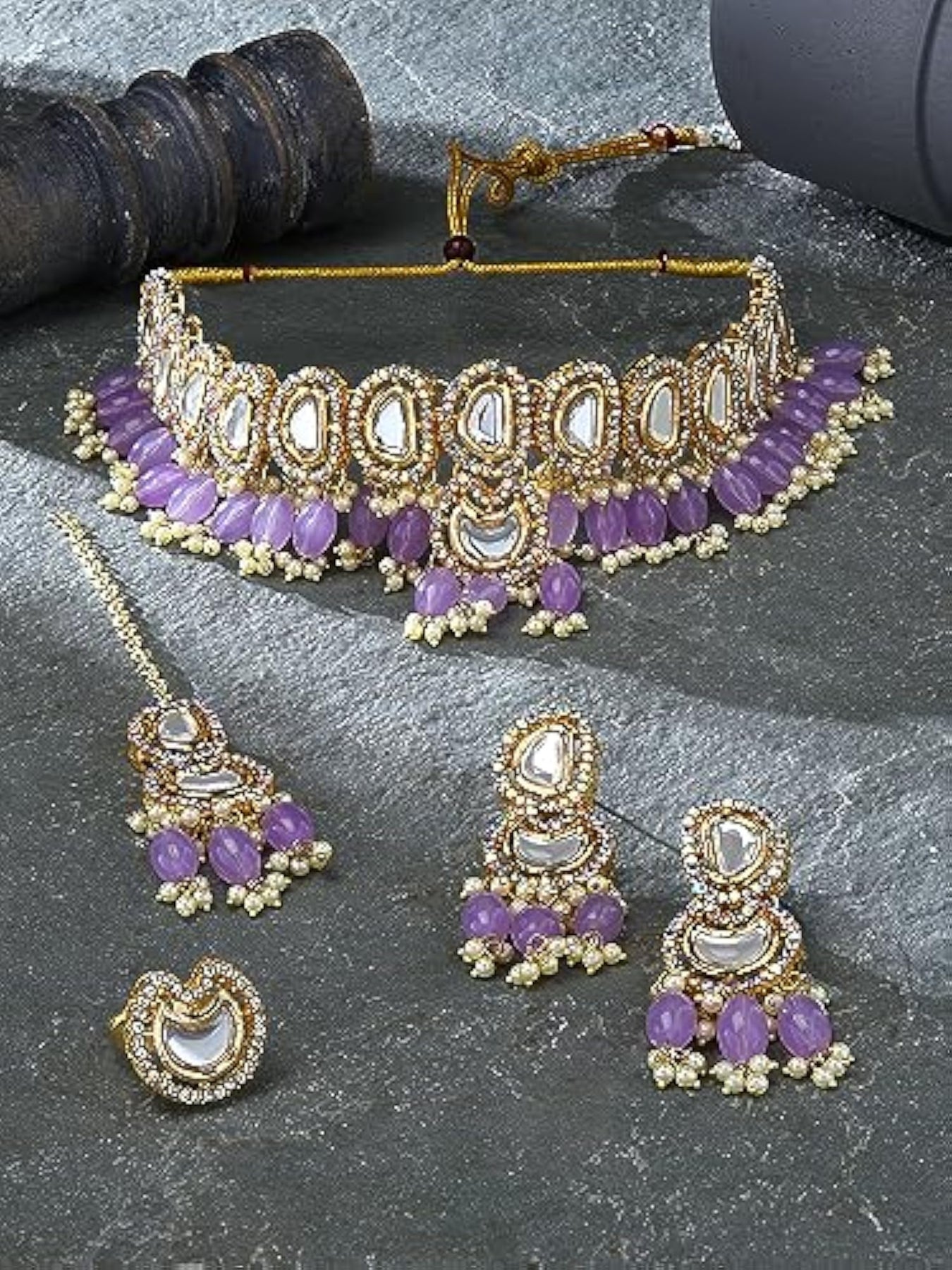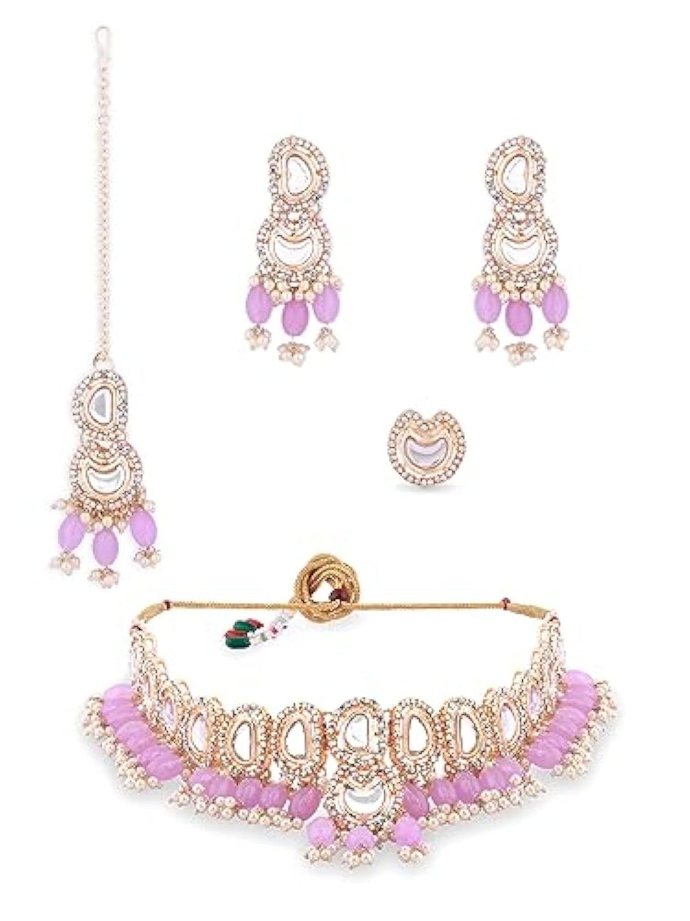 Elegant unicorn stones and beads choker necklace set with maangtikka and ring for women.