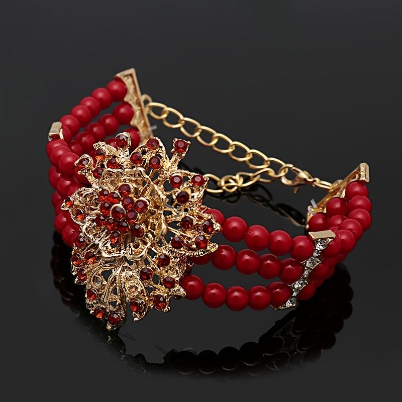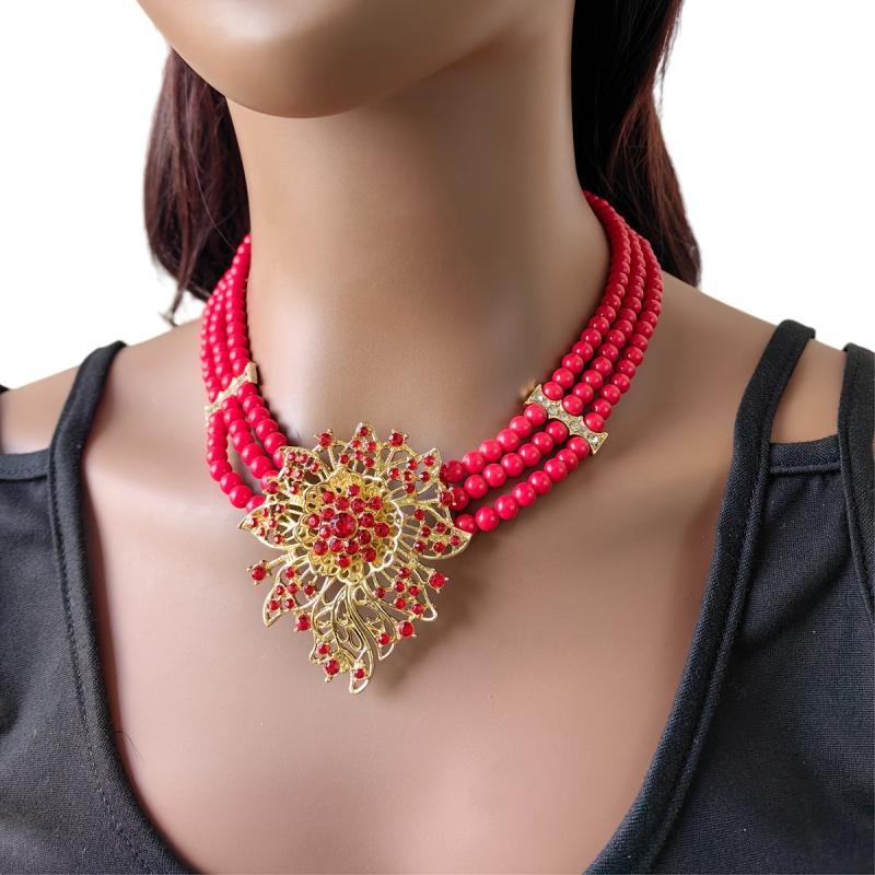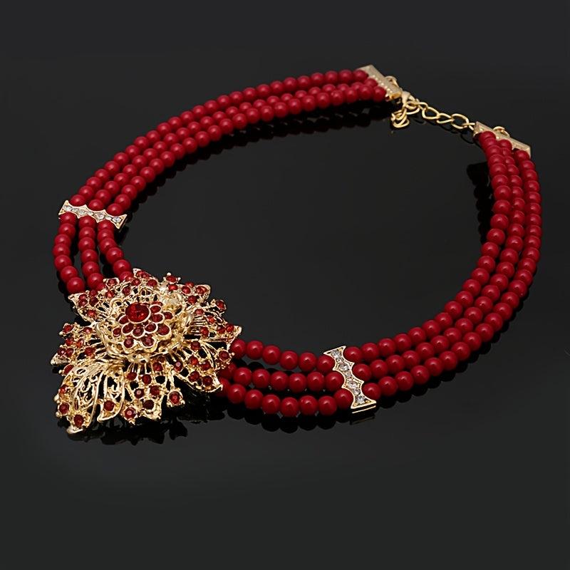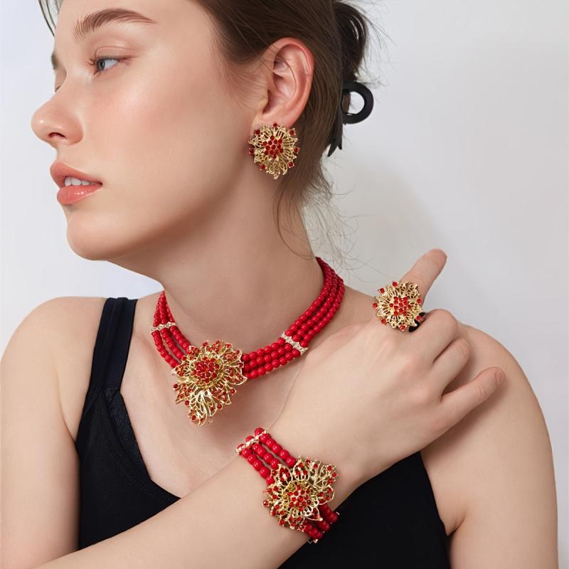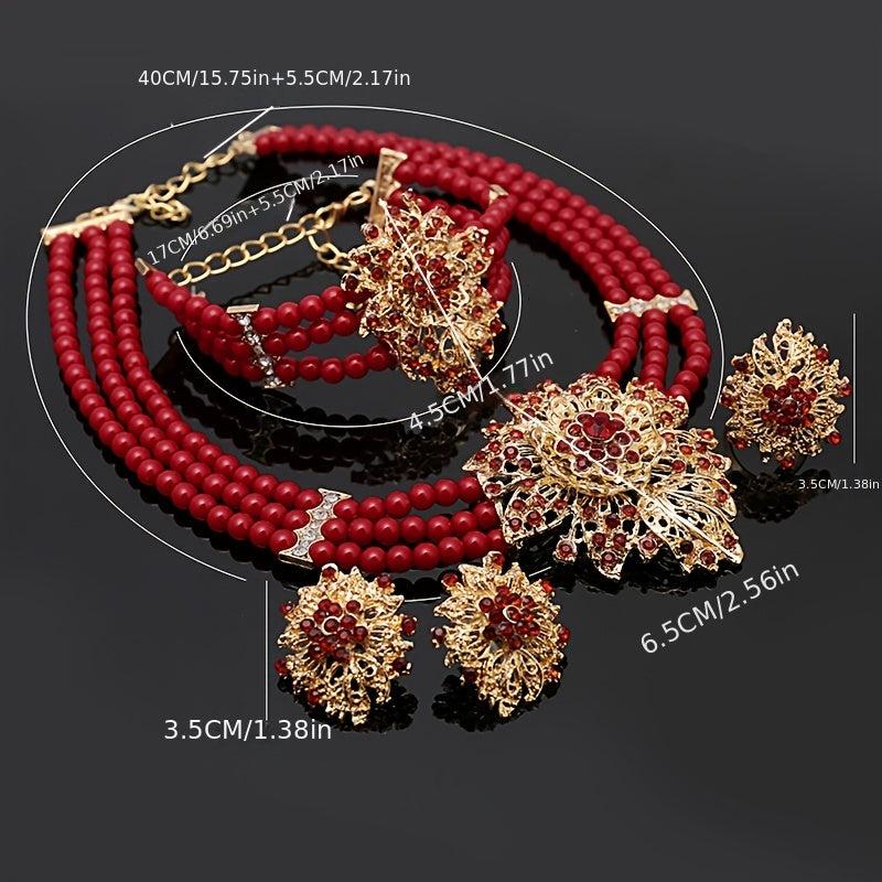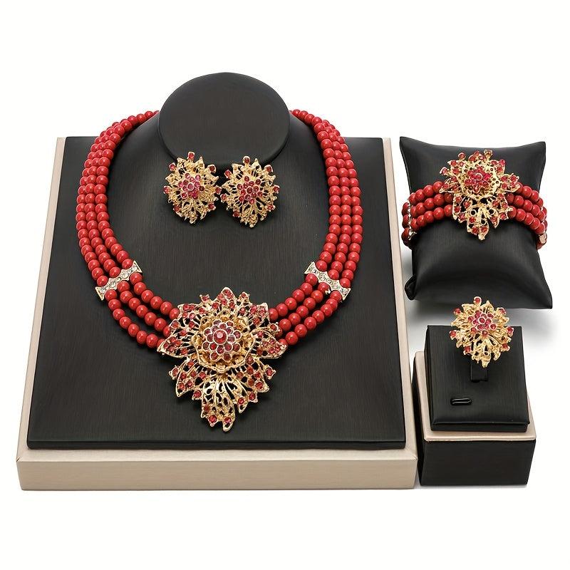 Complete your look with this stunning Vintage Red Bead Jewelry Set featuring a necklace, earrings, bracelet, and ring with rhinestone accents. Perfect for women who love African-inspired accessories.