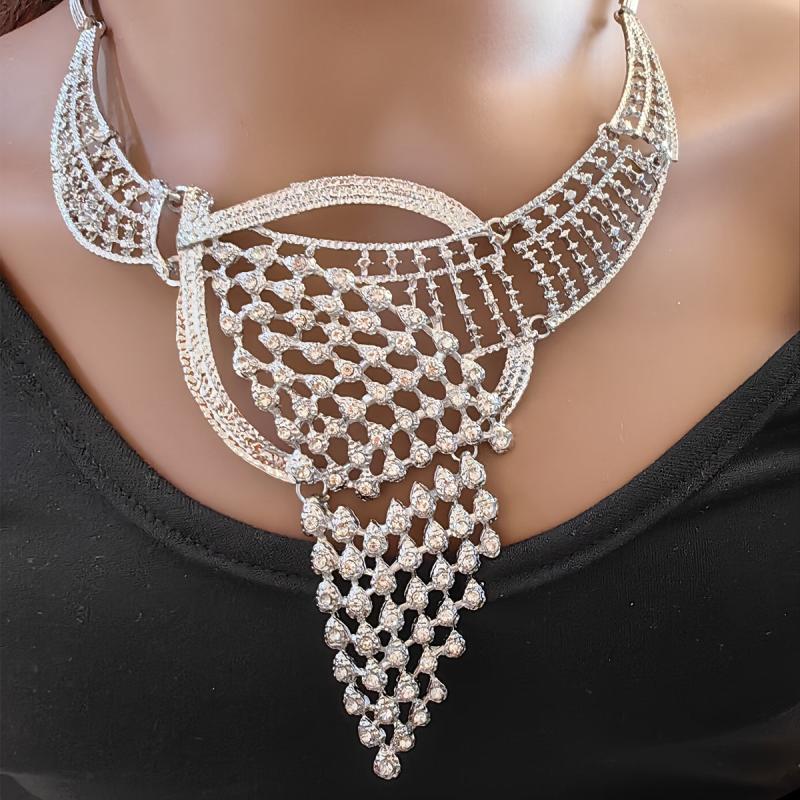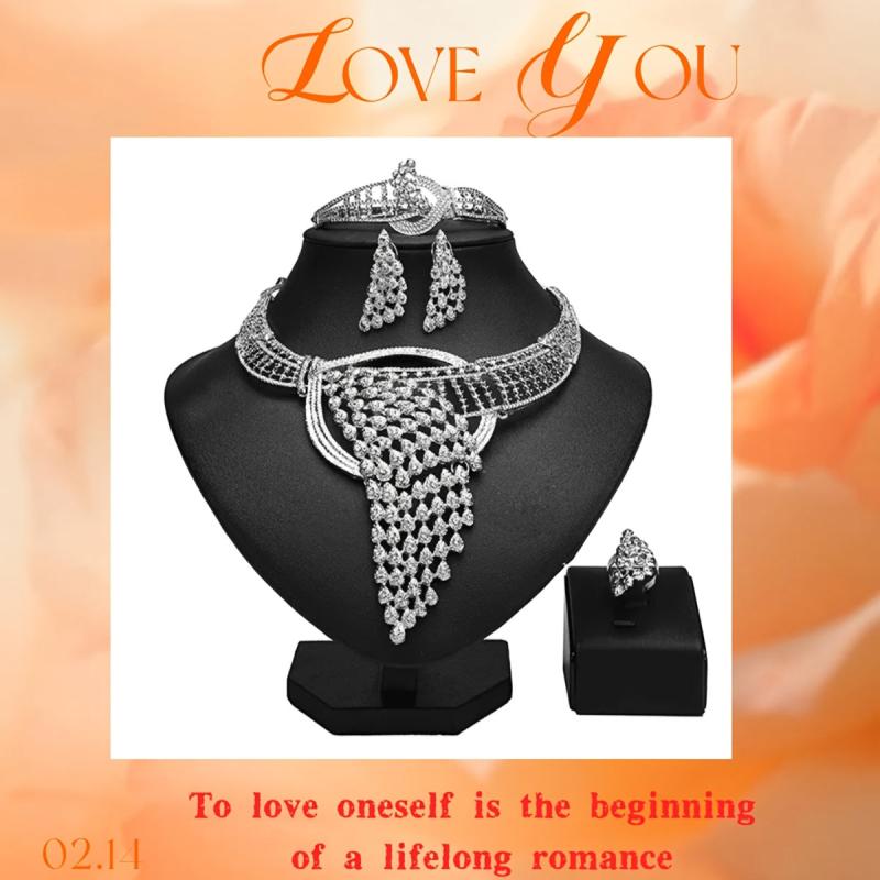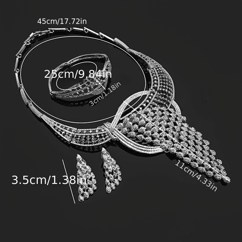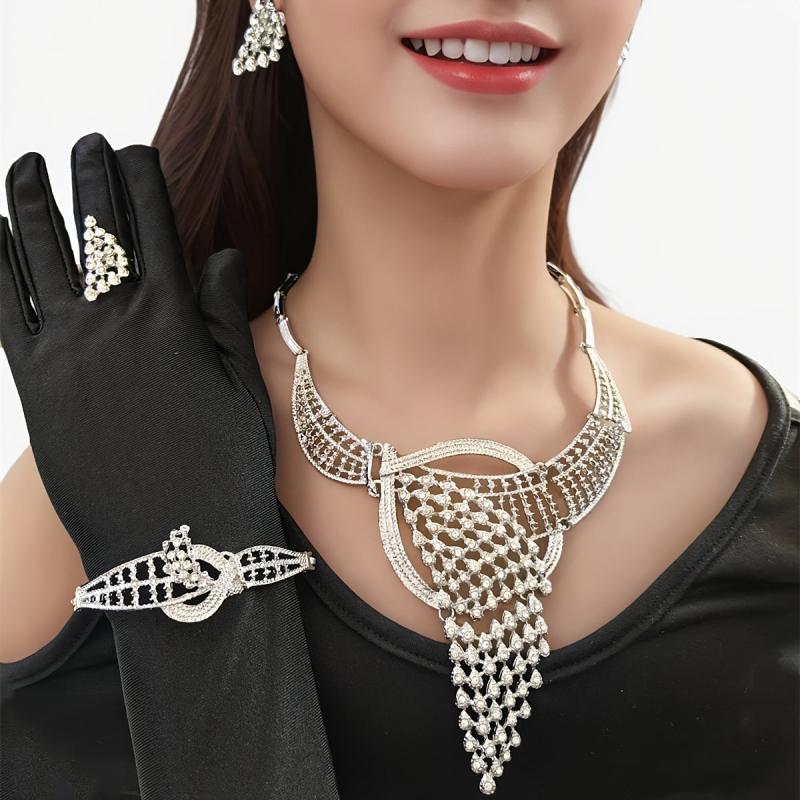 Complete your bridal look with this stunning jewelry set featuring a necklace, earrings, ring, and bracelet. Perfect for weddings and special occasions.