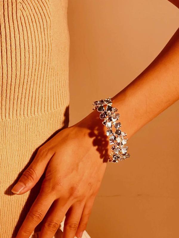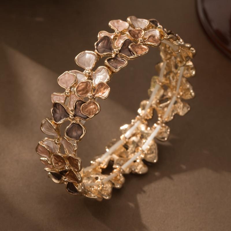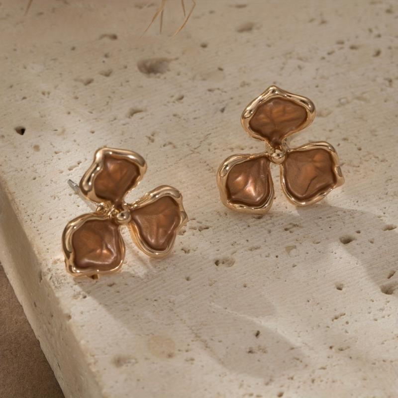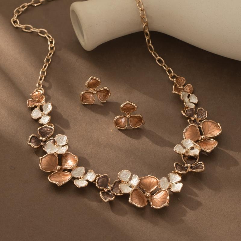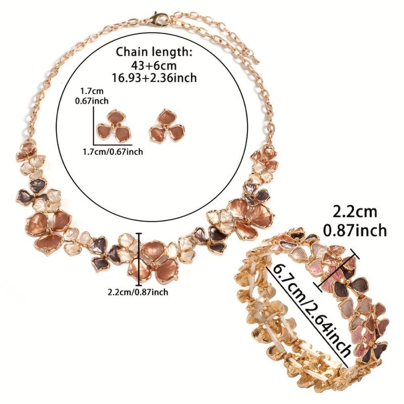 Elegant and stylish 3-piece jewelry set including a bracelet, necklace, and earrings featuring a large khaki enamel flower design. Perfect for a French holiday accent.