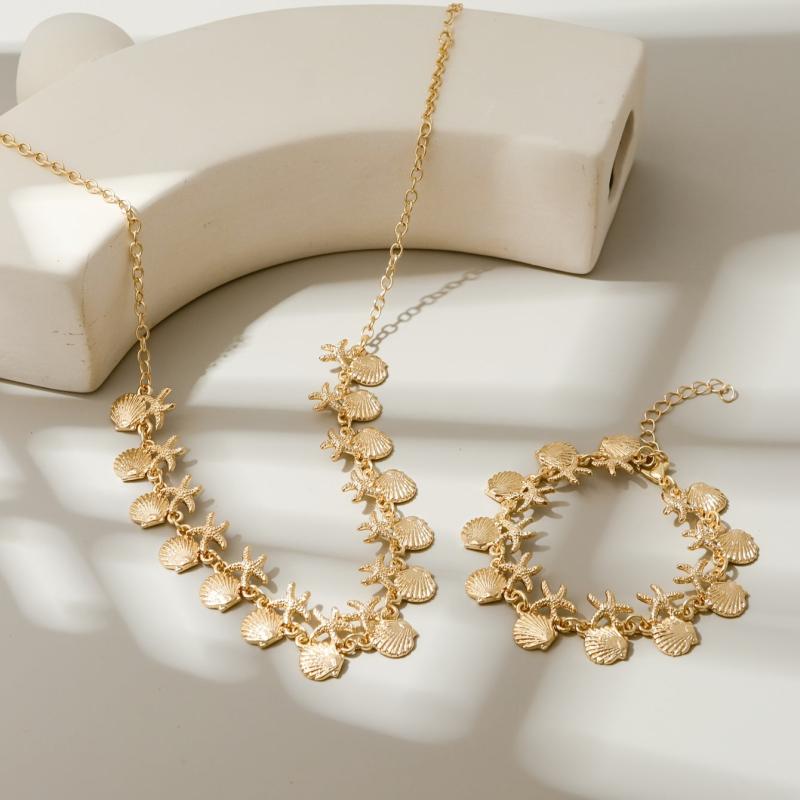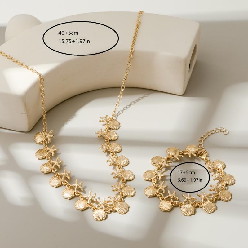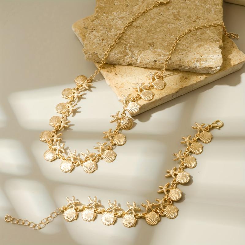 This two-piece jewelry set features a fan-shaped and metal starfish combination arrangement. The close-fitting necklace and bracelet are perfect for a beach or ocean-inspired look.