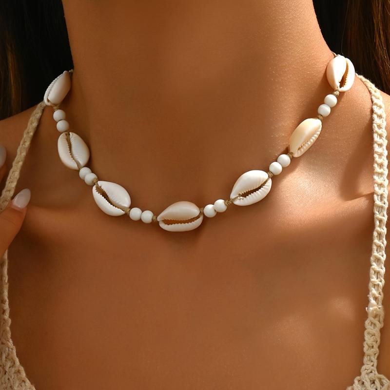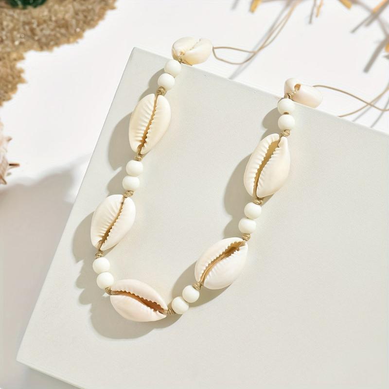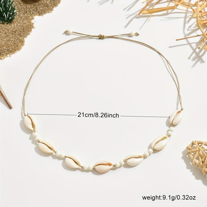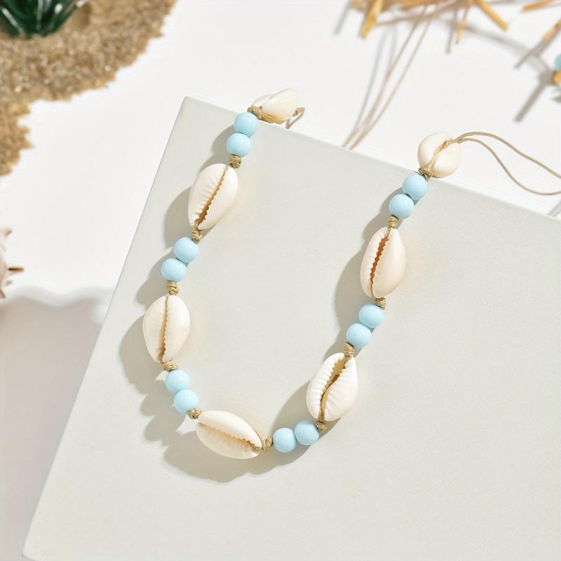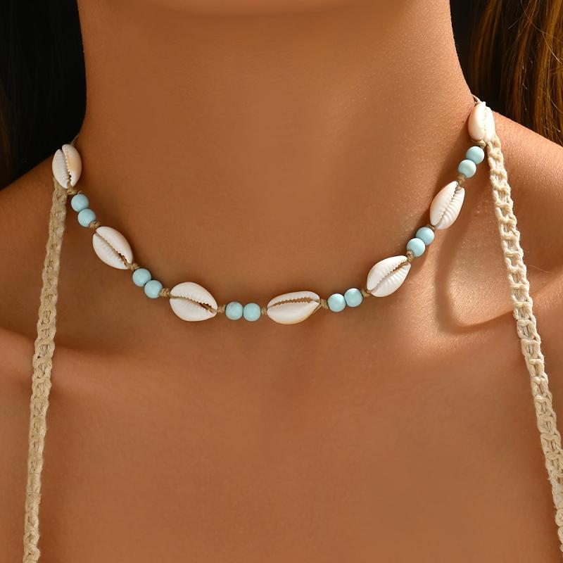 This bohemian necklace features a combination of braided seashell beads and light shell beads with turquoise accents. The natural fiber woven texture gives it a perfect summer beach vibe.