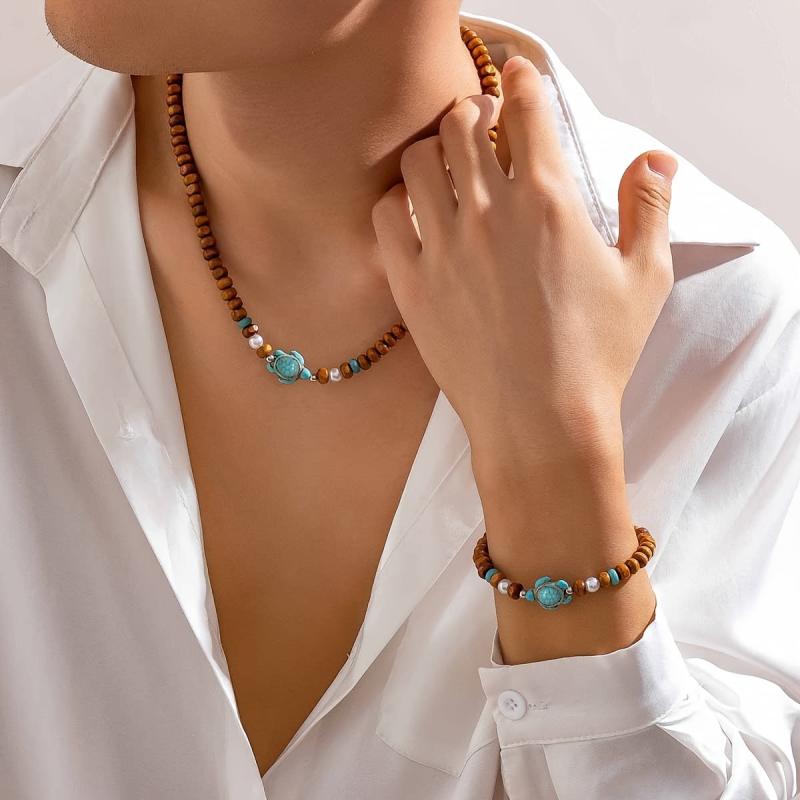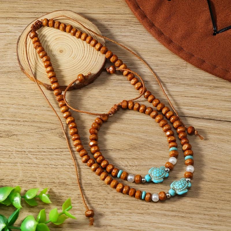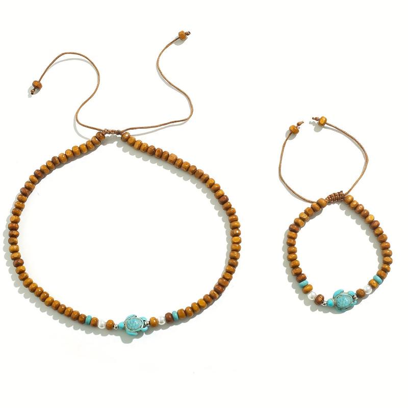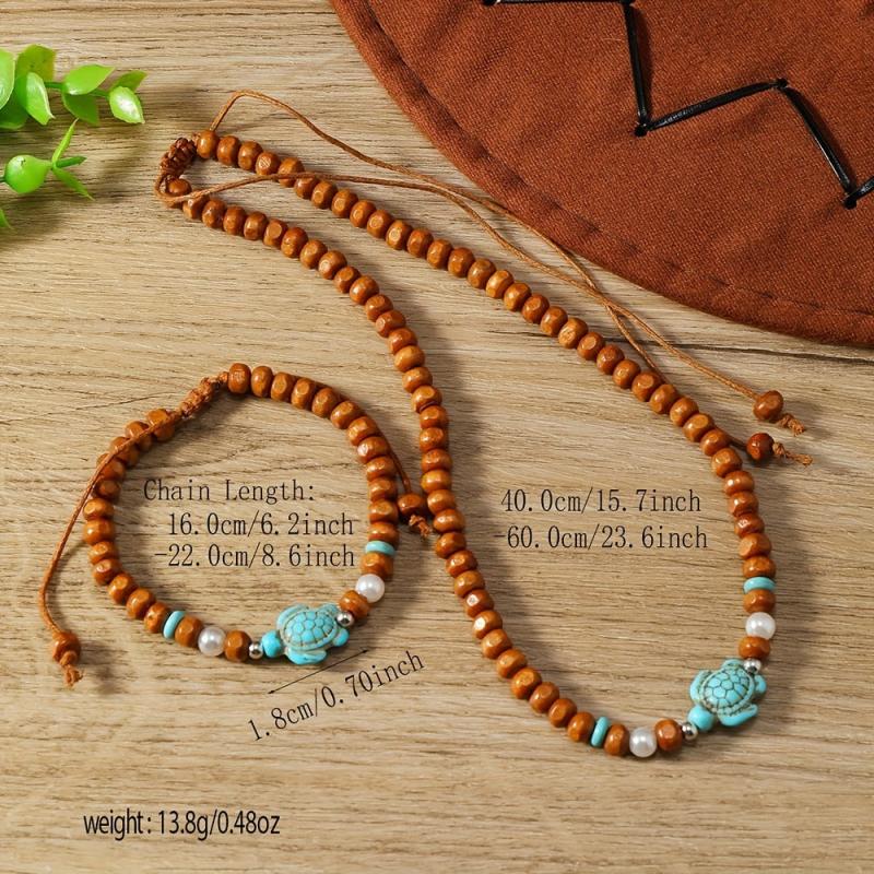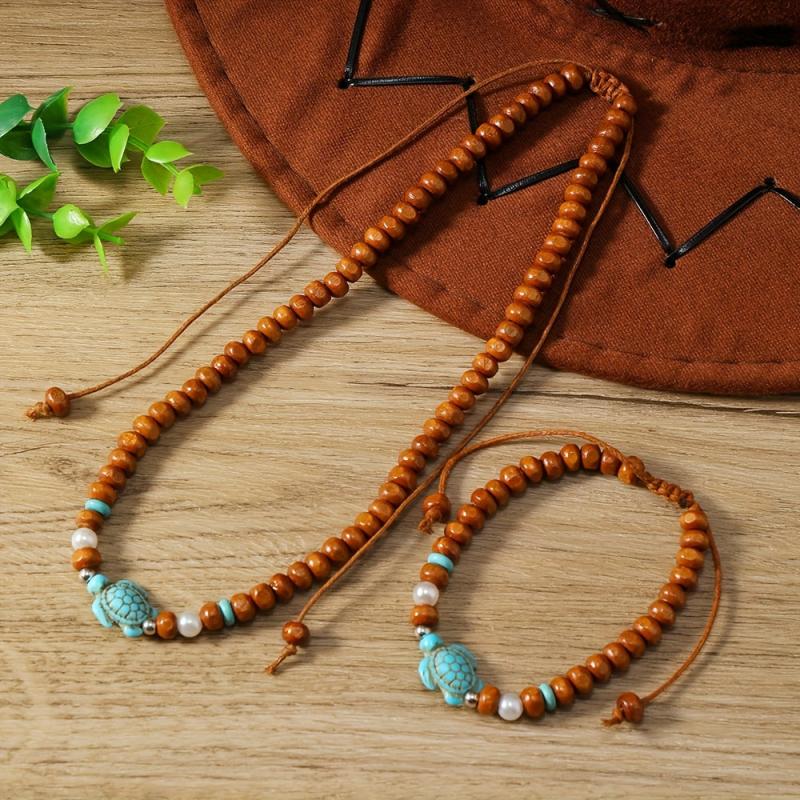 Upgrade your style with this trendy wooden bead turtle bracelet and necklace set. Perfect for adding a hip hop touch to your outfits.