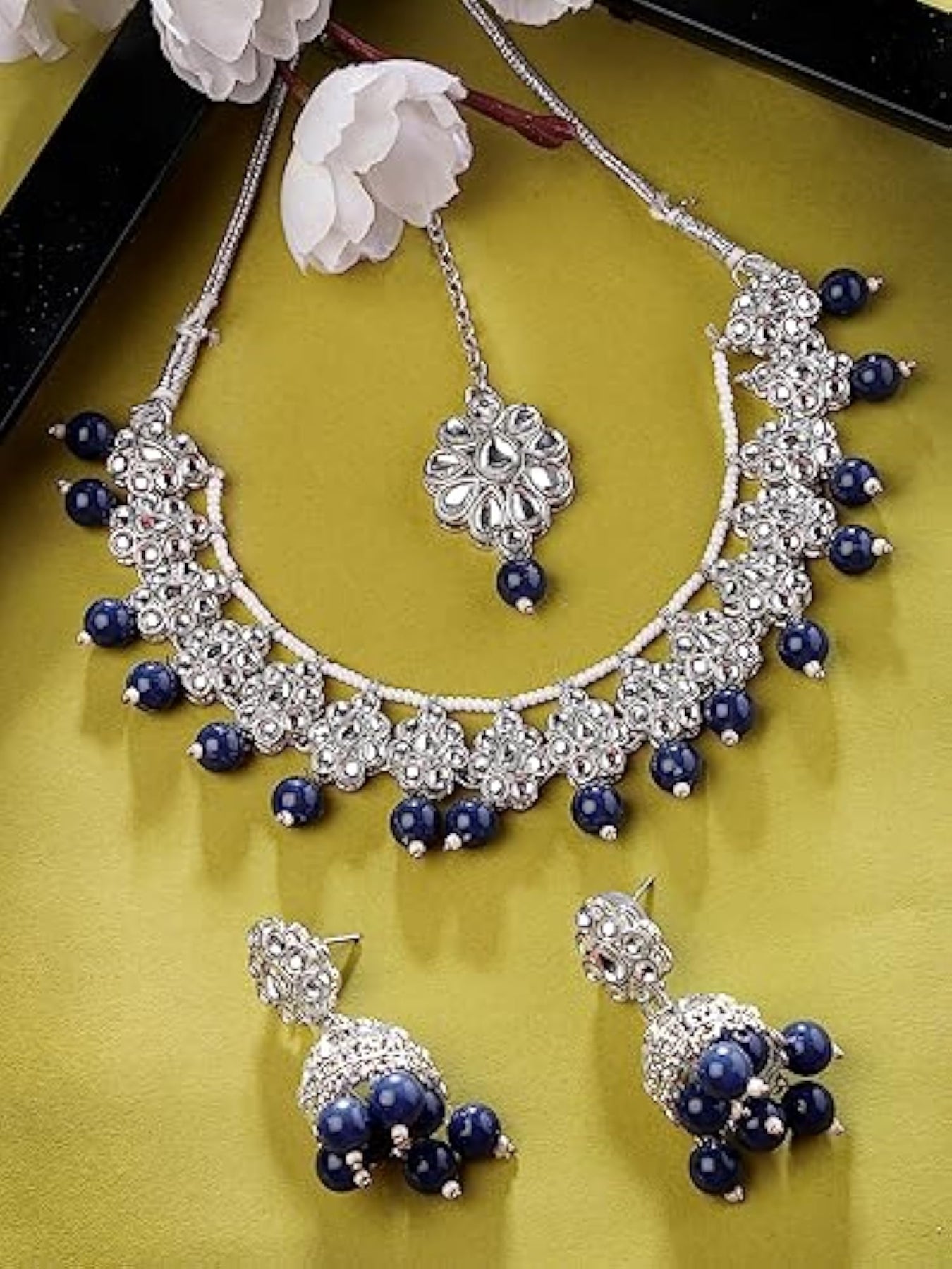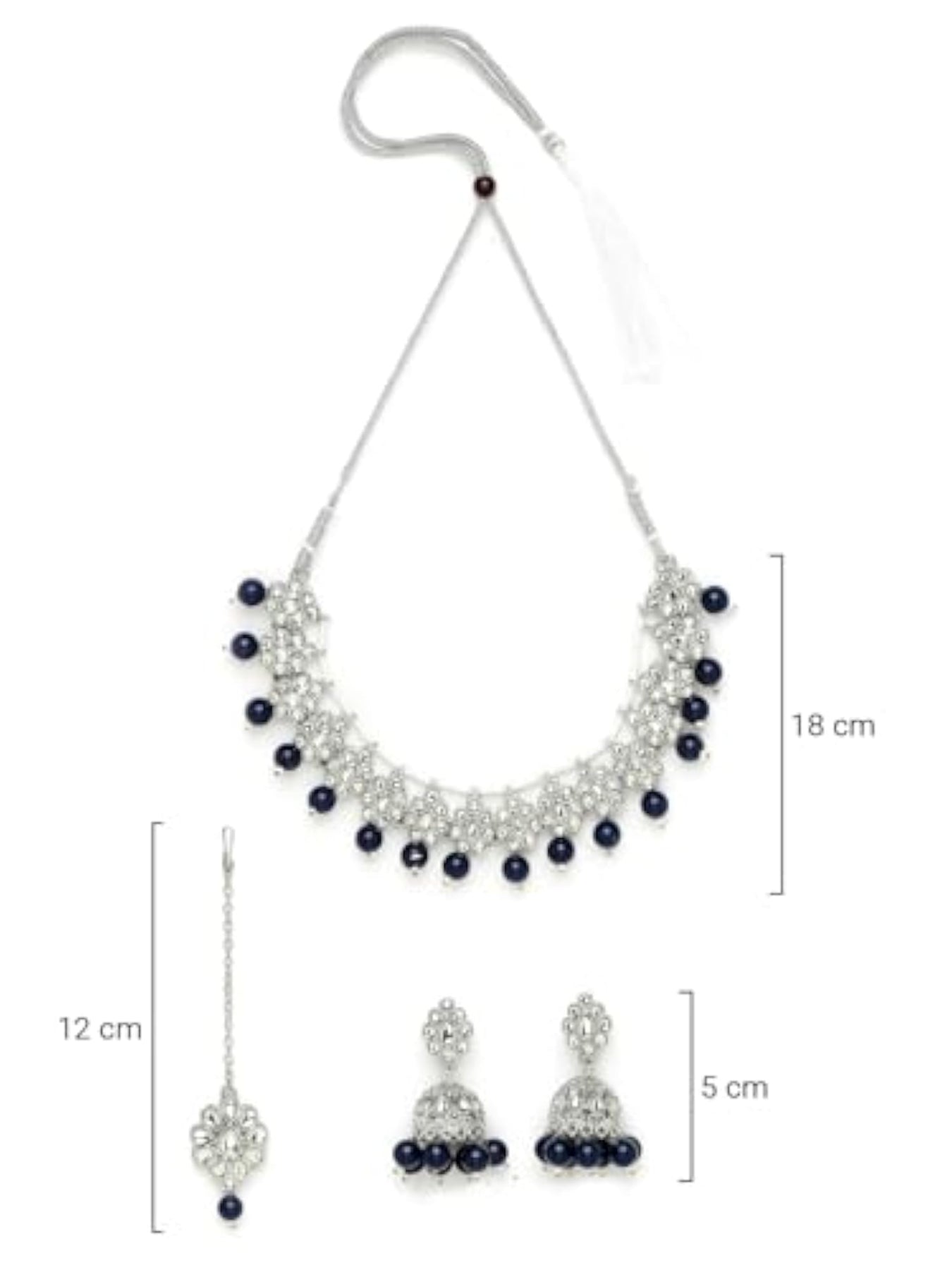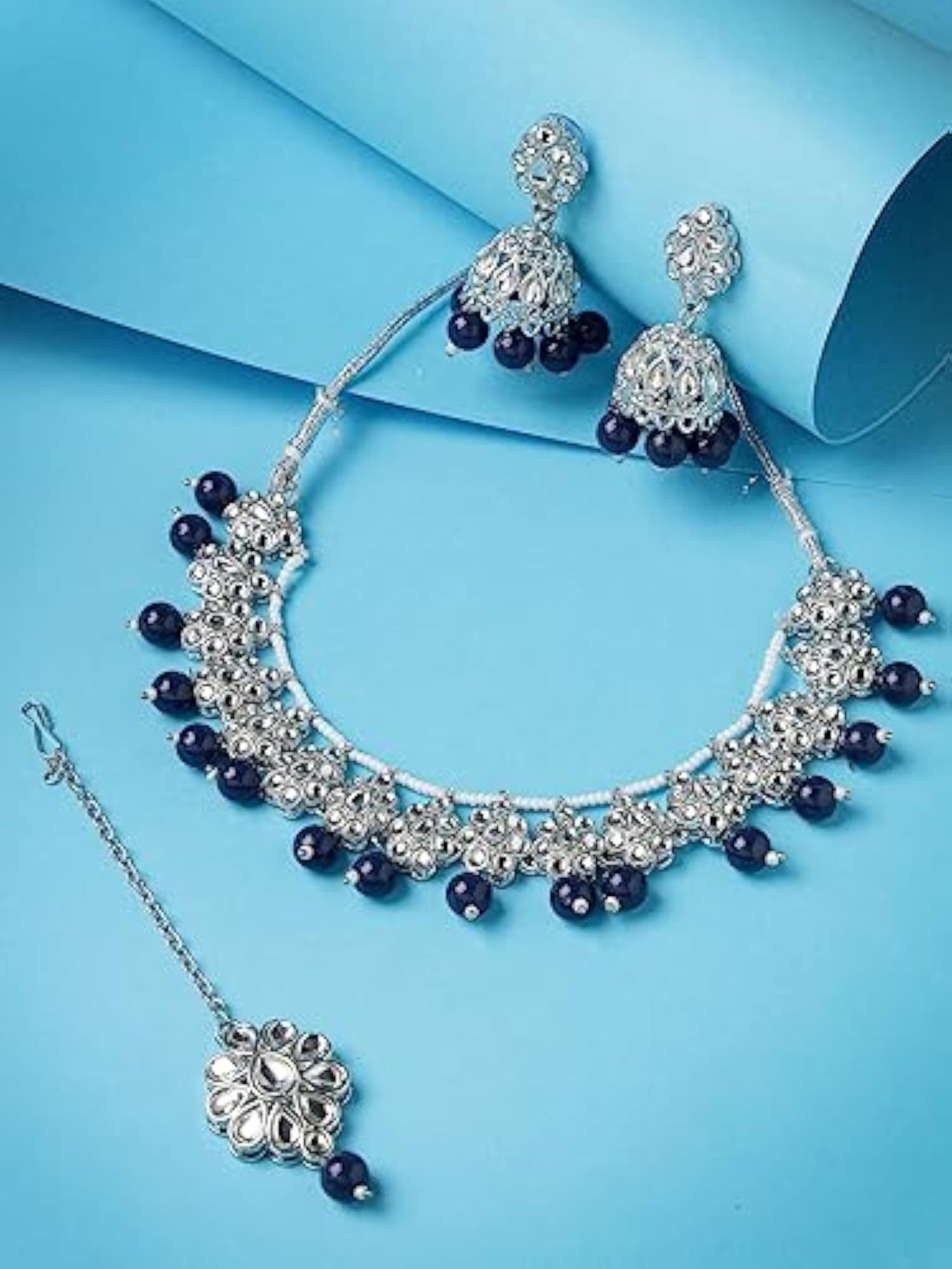 This elegant collar bone necklace set features a youthful floral design with rhodium plating, AD stones, and beads. Complete with matching earrings and maangtika.