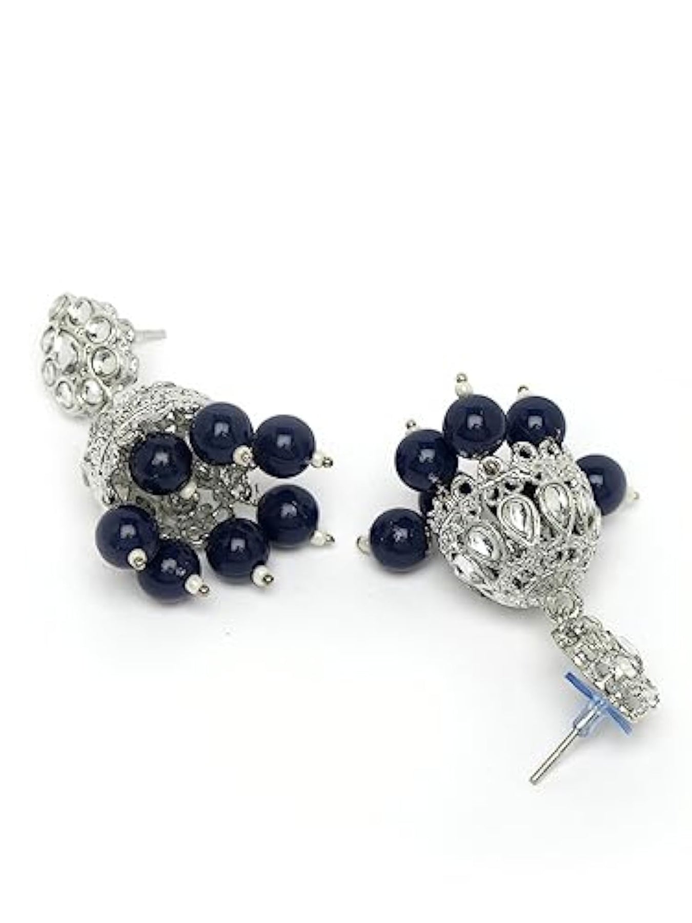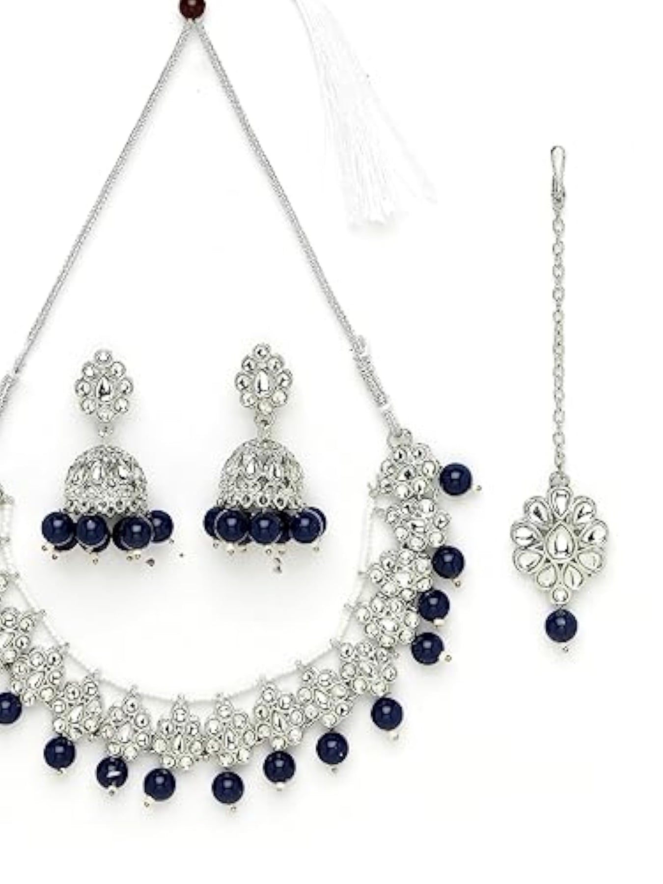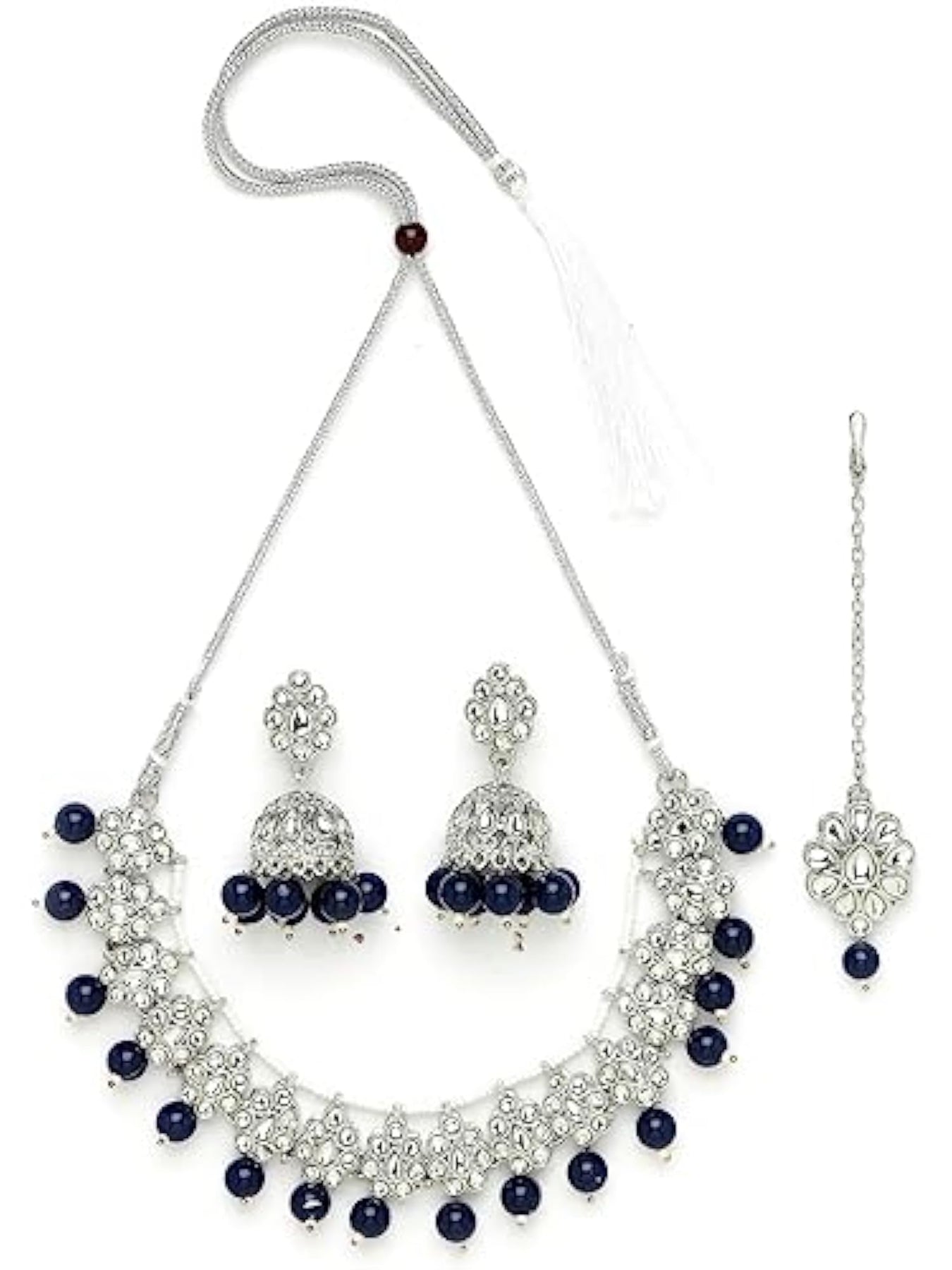 This elegant collar bone necklace set features a youthful floral design with rhodium plating, AD stones, and beads. Complete with matching earrings and maangtika.