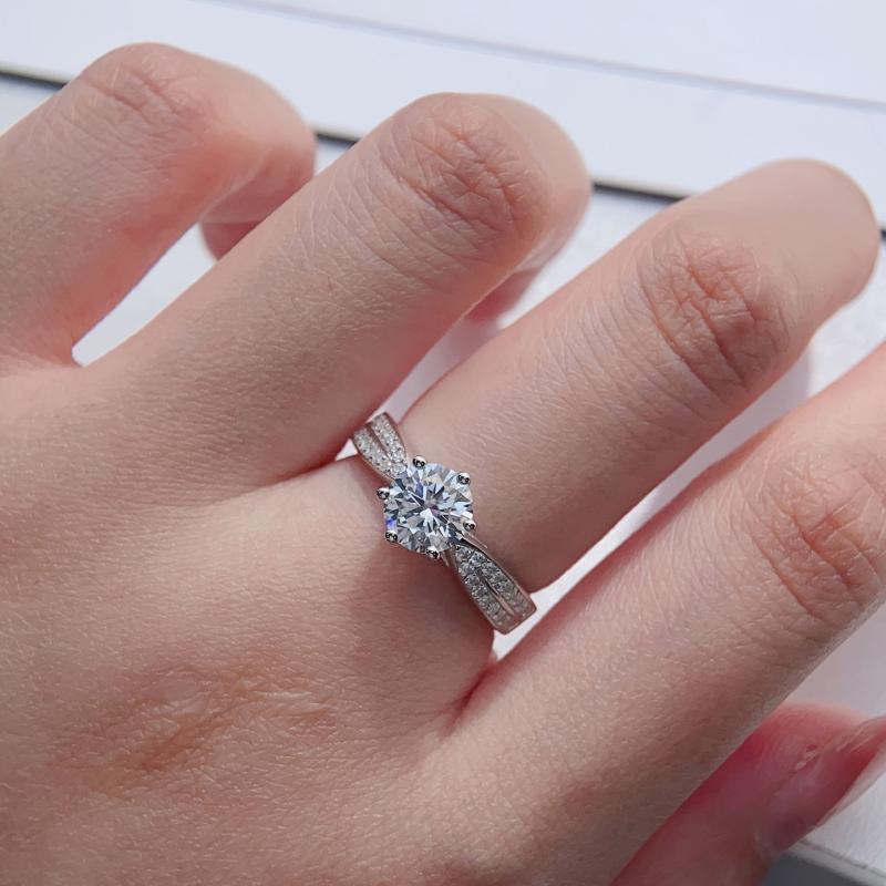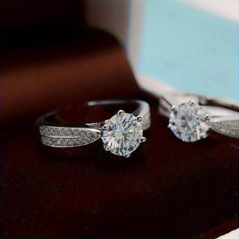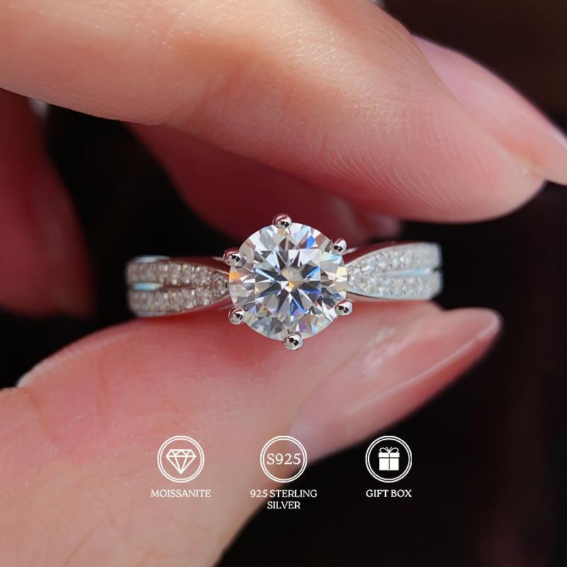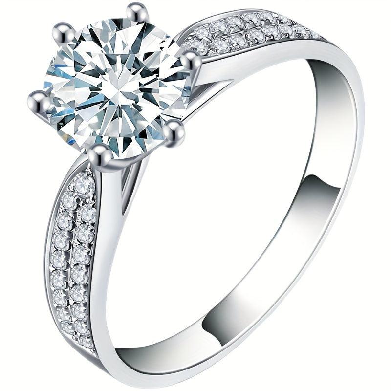 This classic ring features a circular cut moissanite stone, perfect for engagement and wedding rings. It is timeless and elegant, suitable for any occasion.