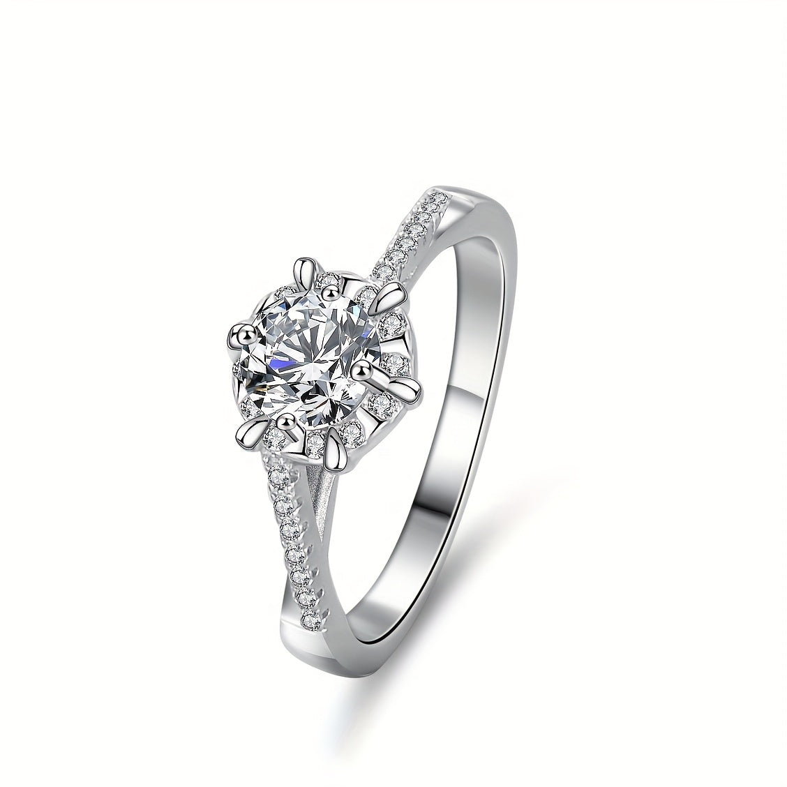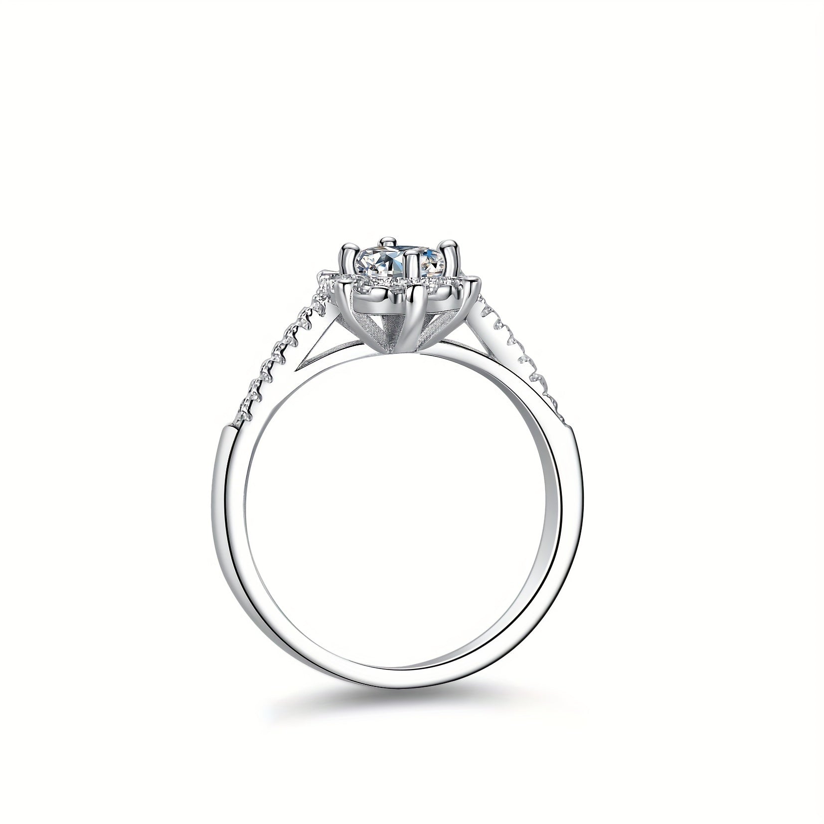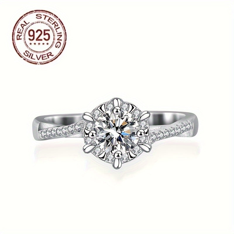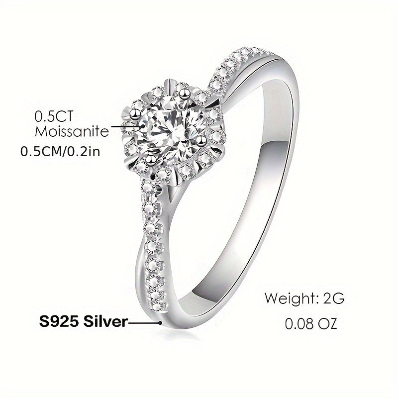 This exquisite engagement ring features a 0.5CT round moissanite gemstone set in a platinum 4-prong setting. The perfect choice for a proposal or special occasion.