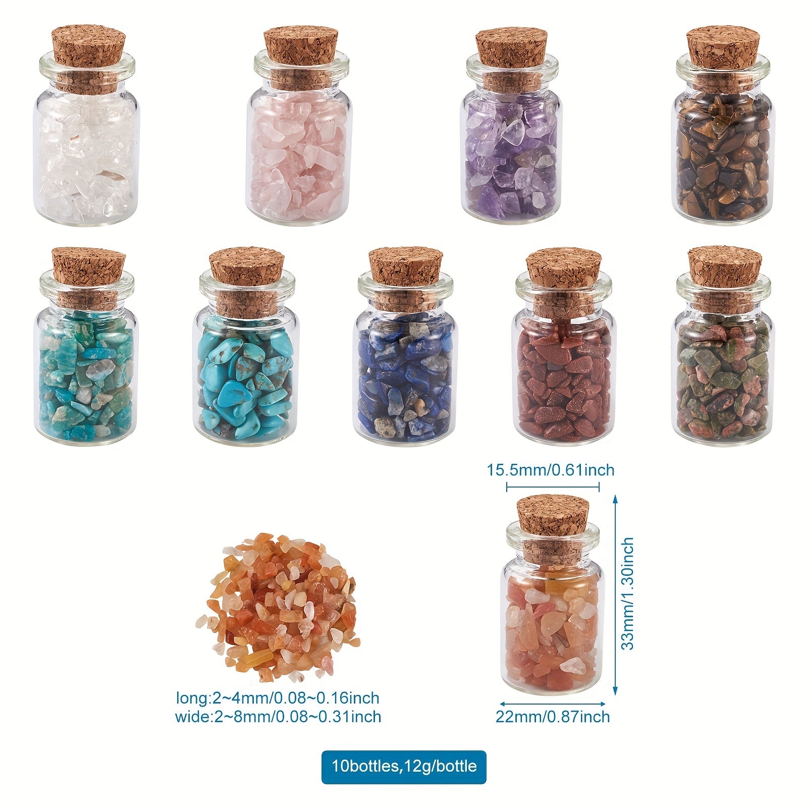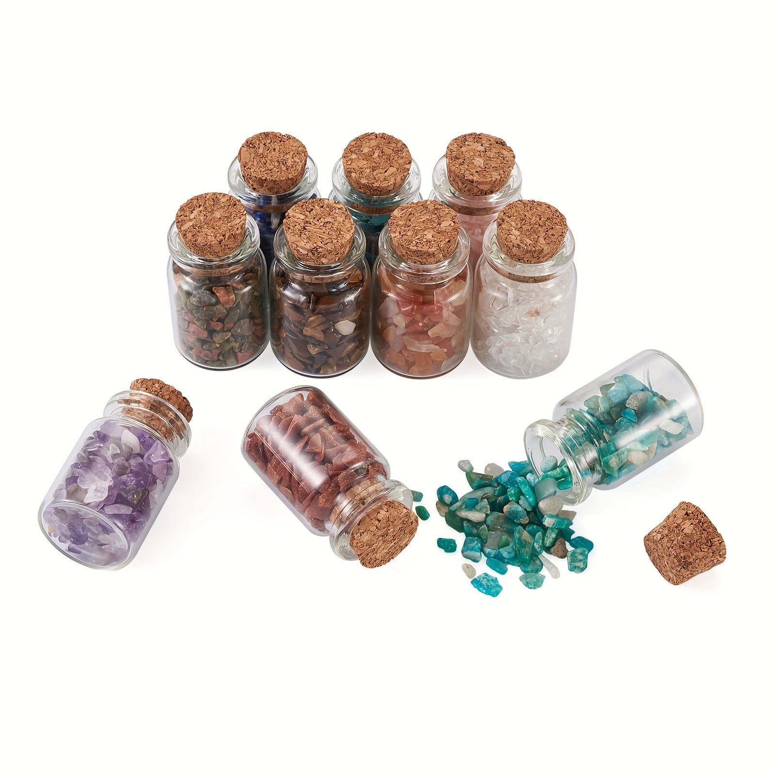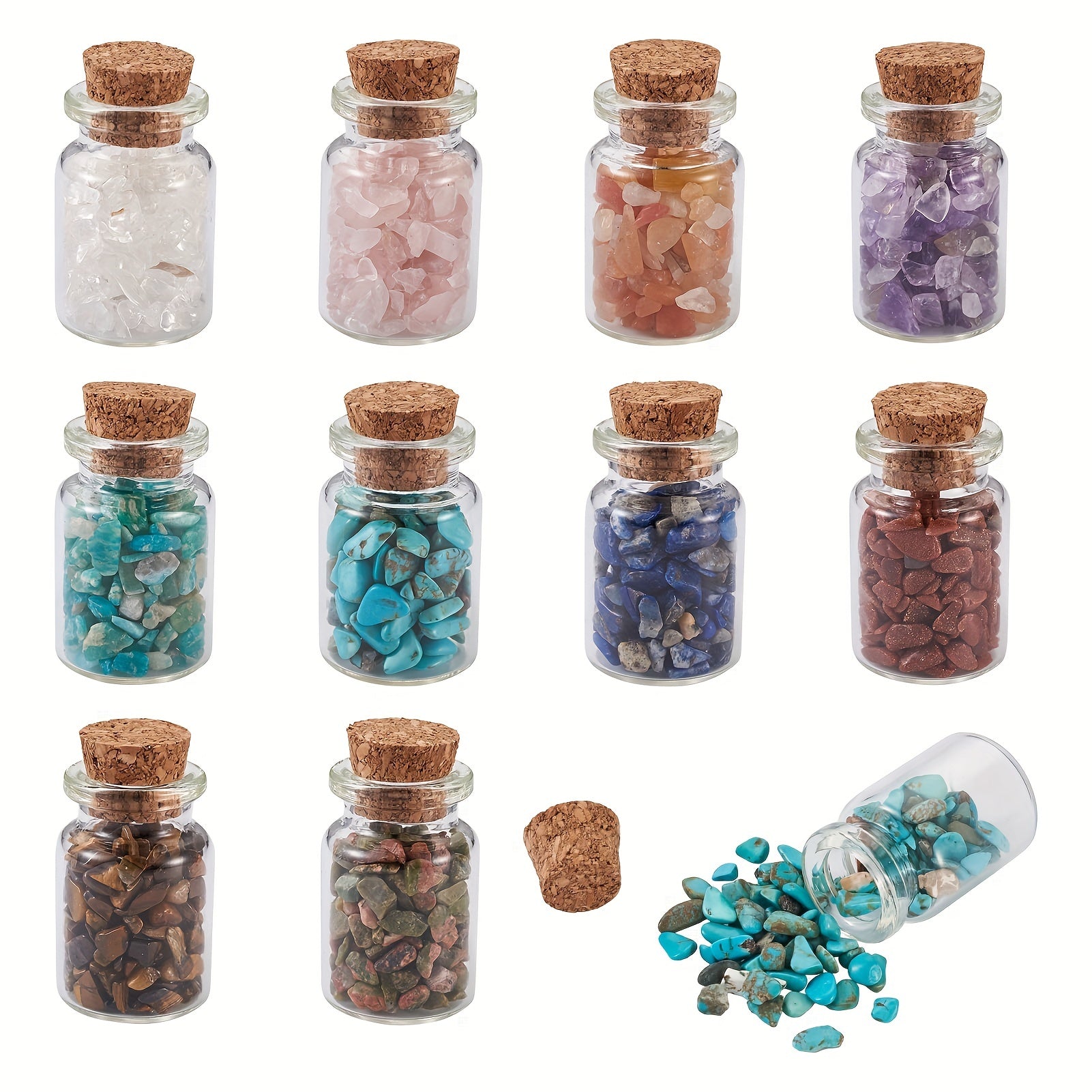 Create your own unique jewelry with this set of 10 glass bottles filled with natural and synthetic gemstone chips. Perfect for making necklaces, bracelets, and earrings.
