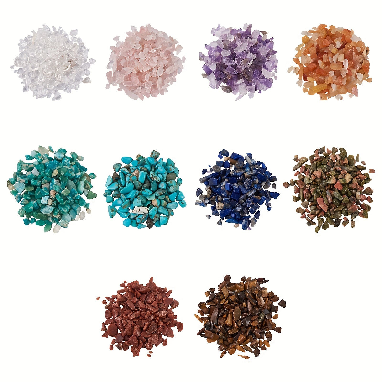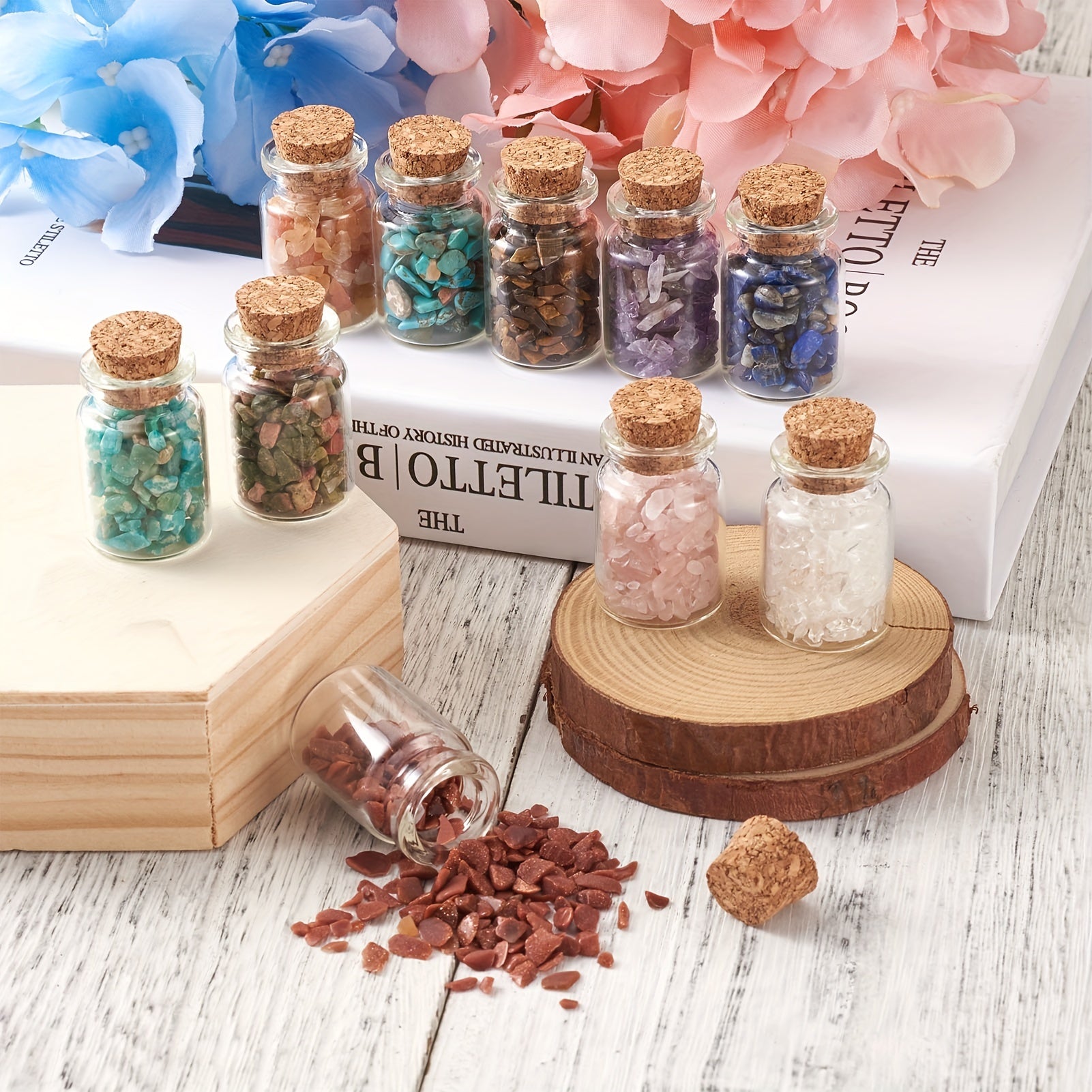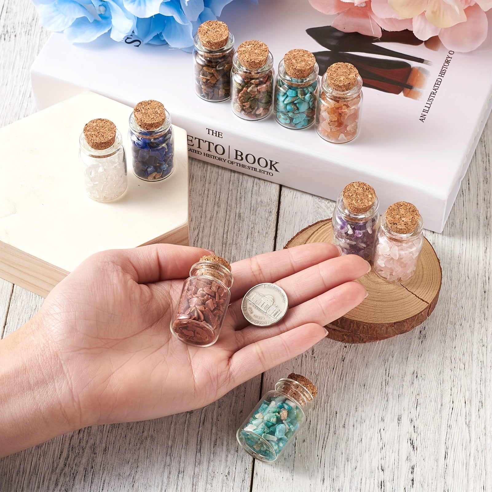 Create your own unique jewelry with this set of 10 glass bottles filled with natural and synthetic gemstone chips. Perfect for making necklaces, bracelets, and earrings.