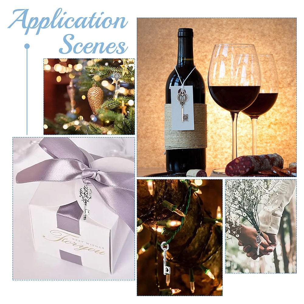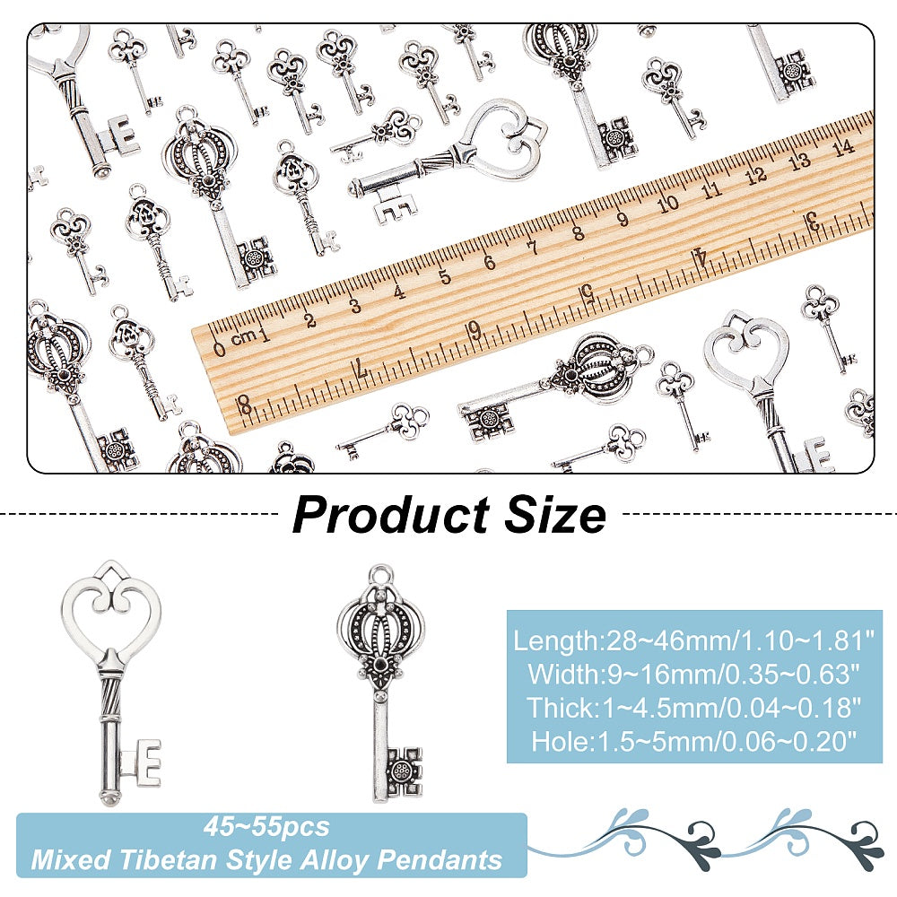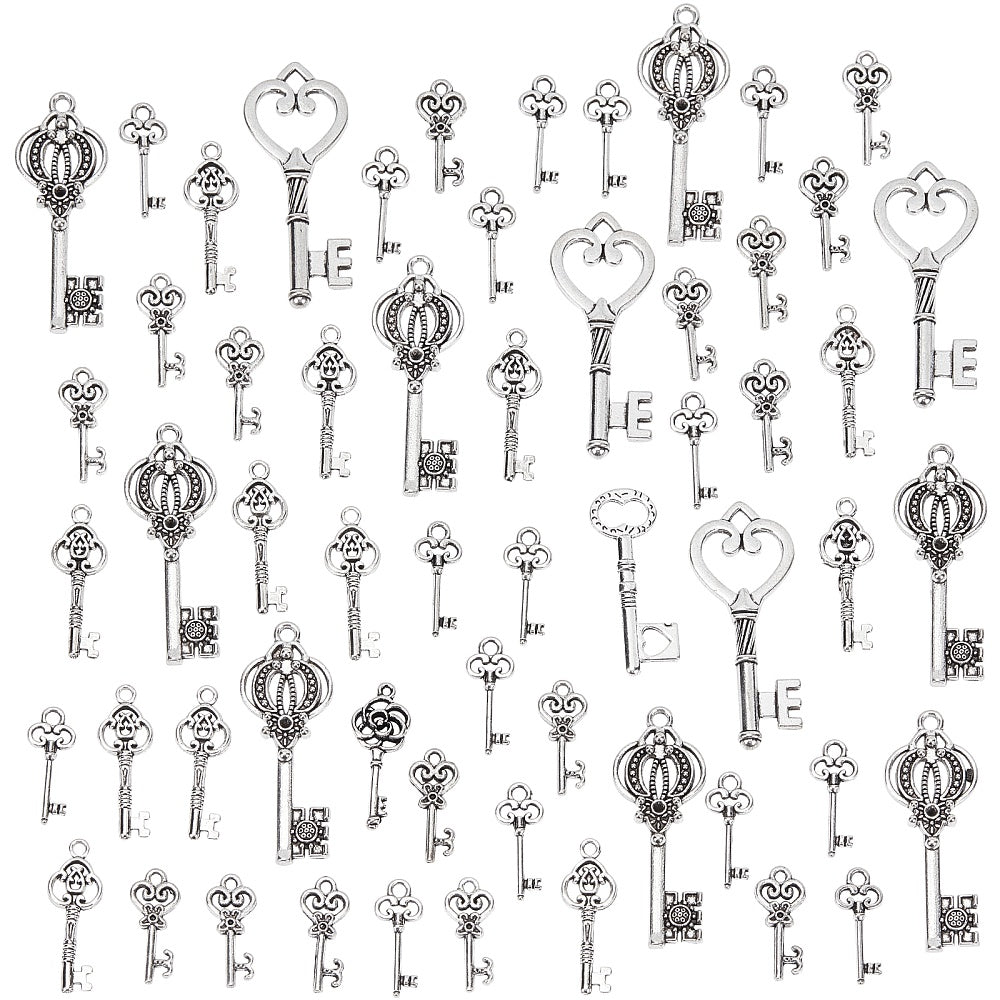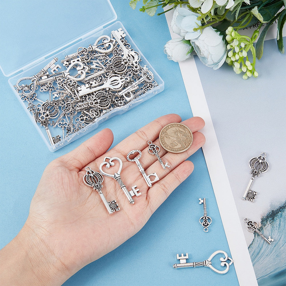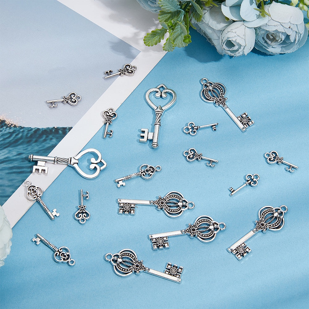Create unique jewelry pieces with this set of antique silvery key pendants. Perfect for making earrings, bracelets, and more.