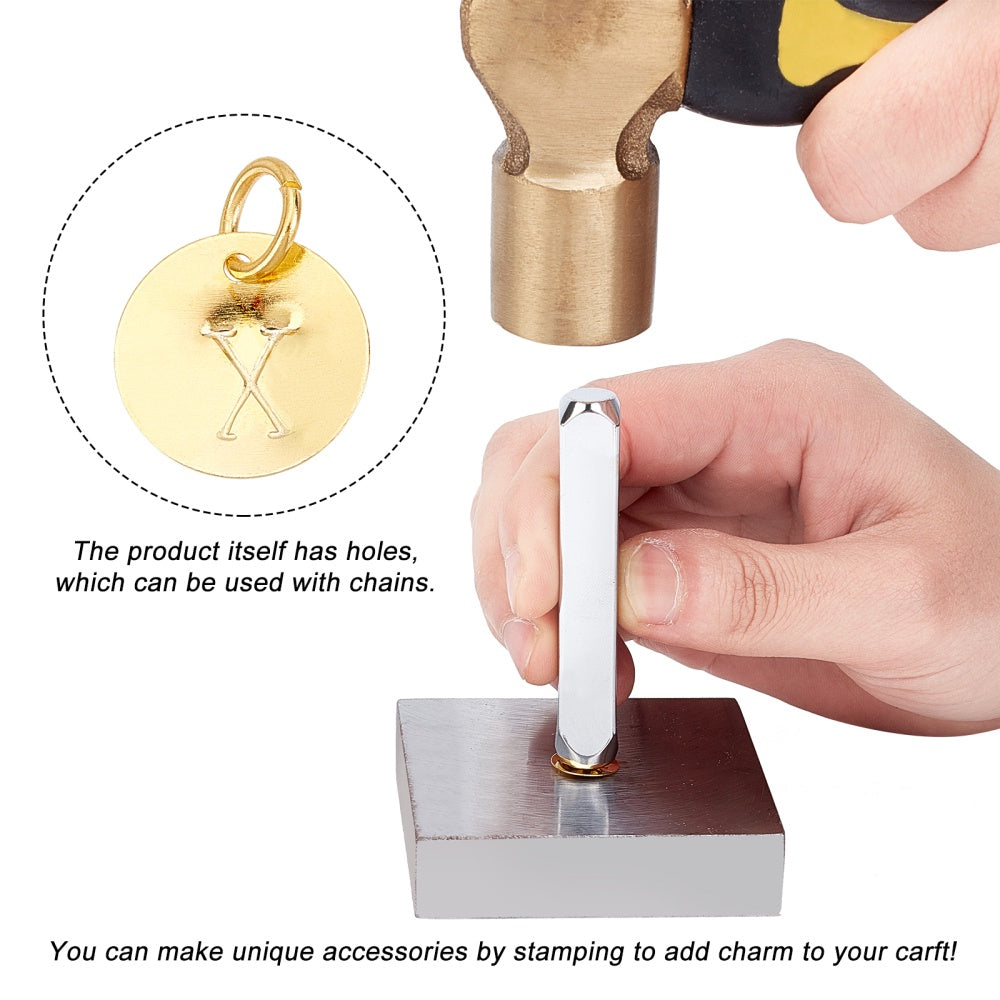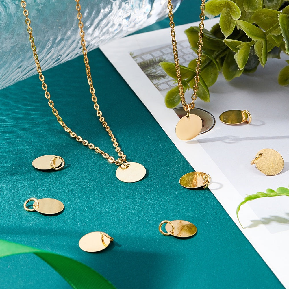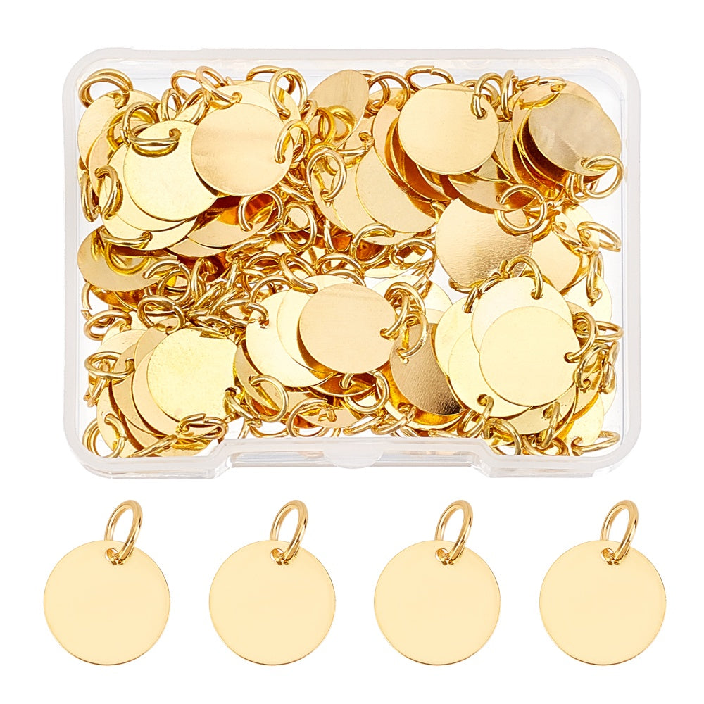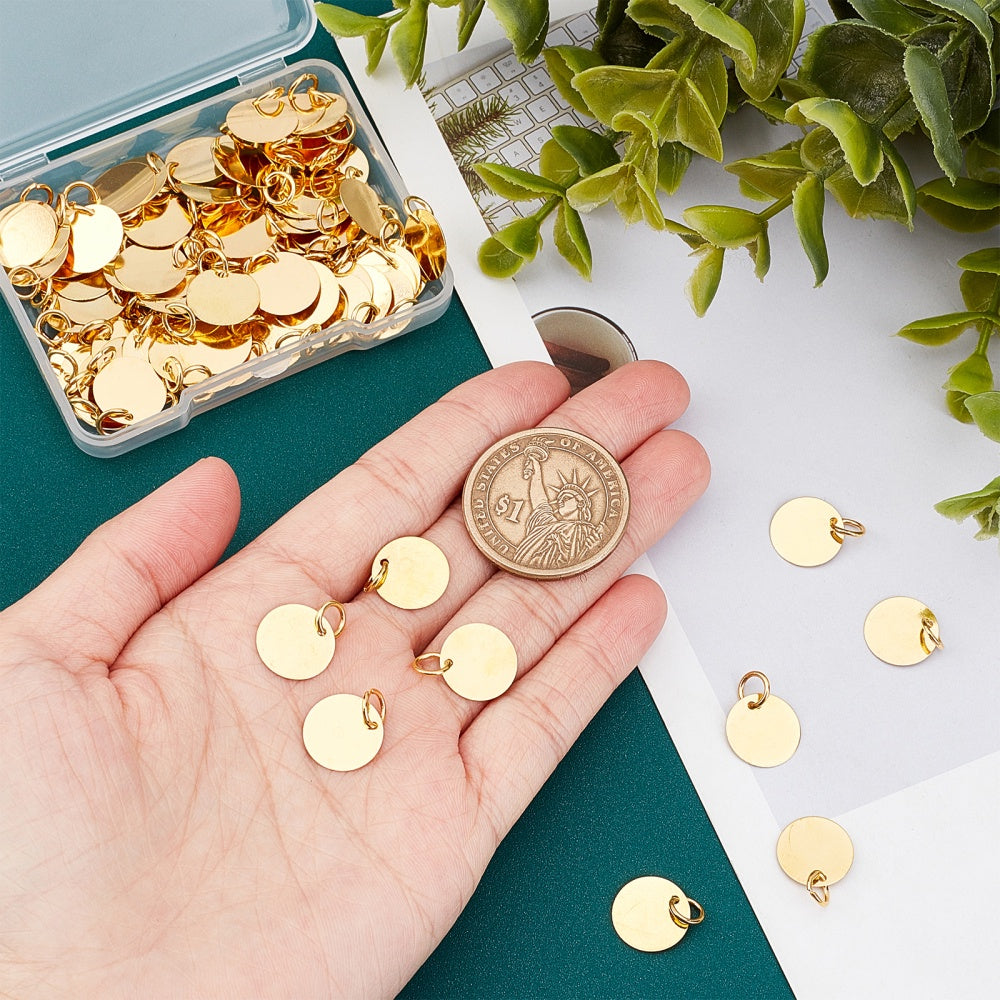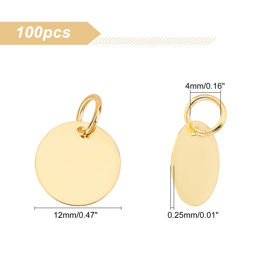 This pack includes 100 pieces of 12mm flat round brass stamping blank tag charms in a golden color. Perfect for jewelry making and crafts.