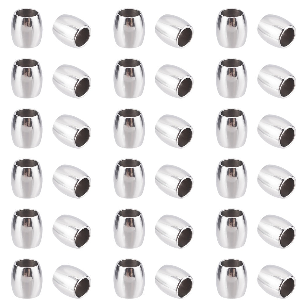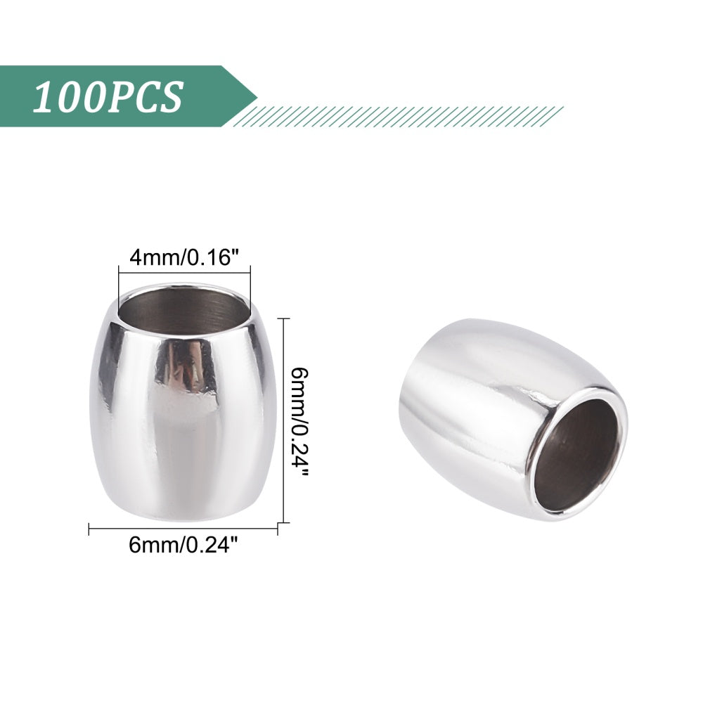 Get this pack of 100 6mm Barrel Pattern Spacer Beads made of stainless steel with a small hole. Use them to create unique bracelets. These beads have a smooth surface and are great for DIY projects.