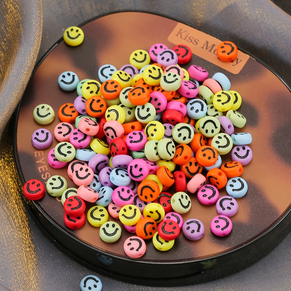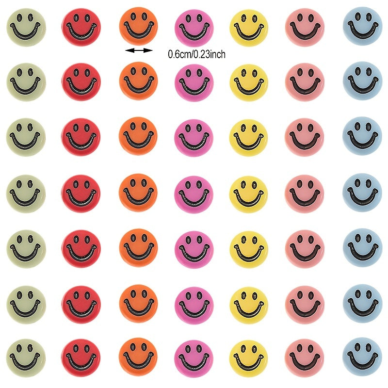 Add a touch of cheer to your DIY jewelry projects with these 6mm multicolor acrylic happy face beads. These plastic flat round smiling beads are perfect for creating fun and vibrant bracelets and other accessories.