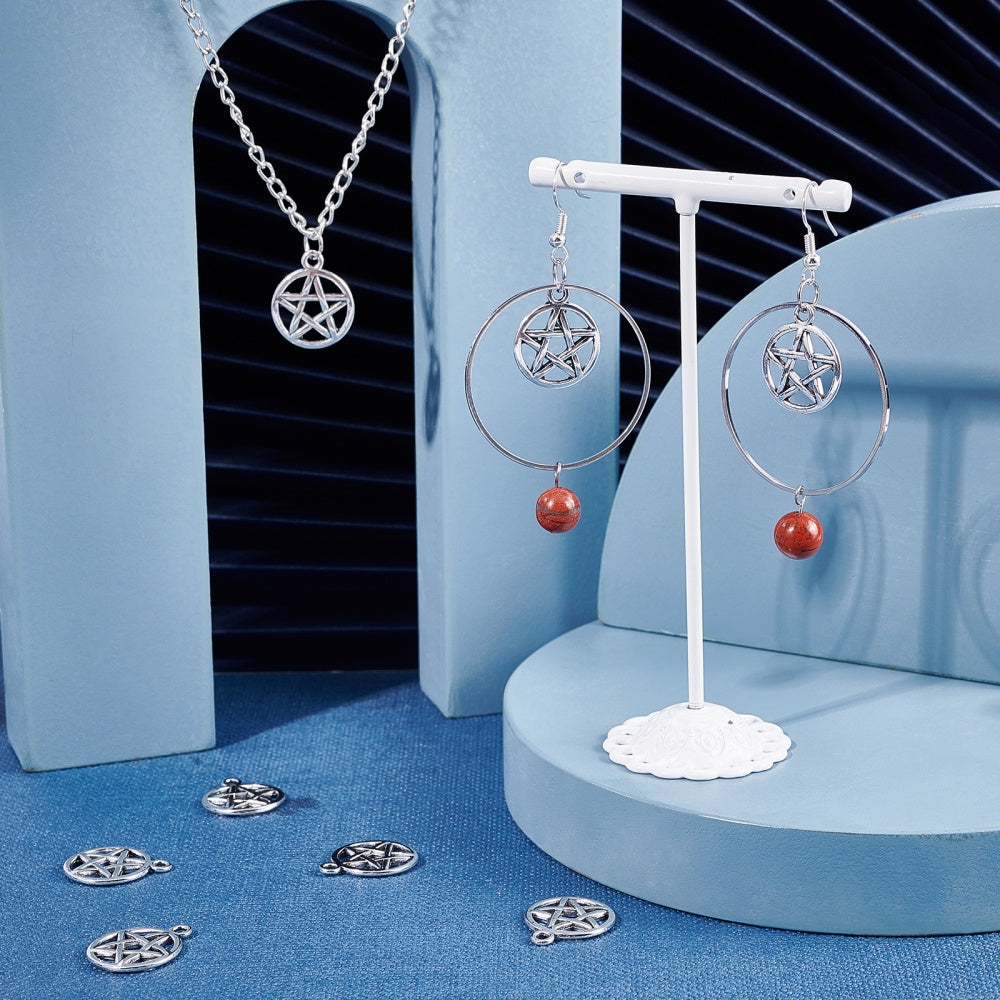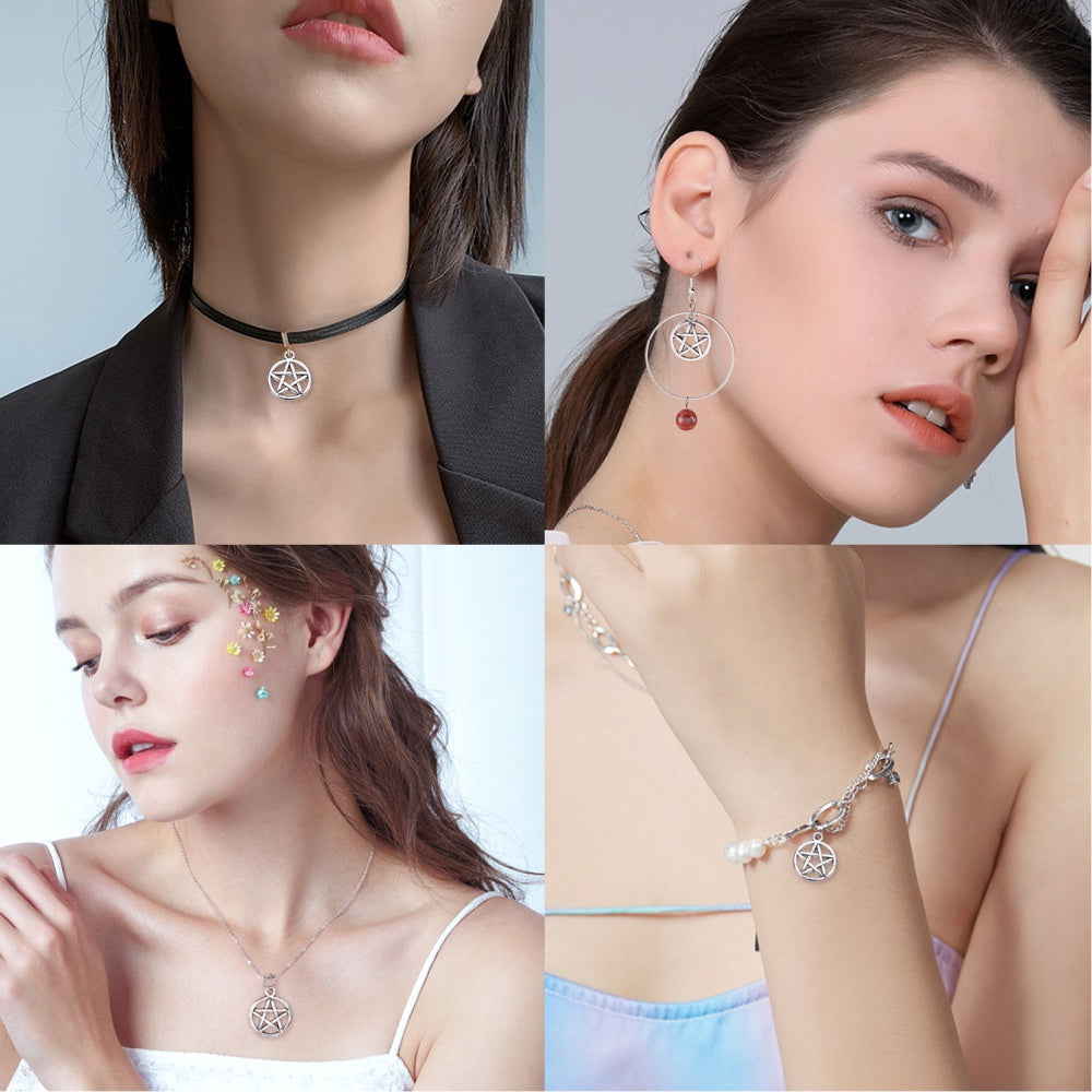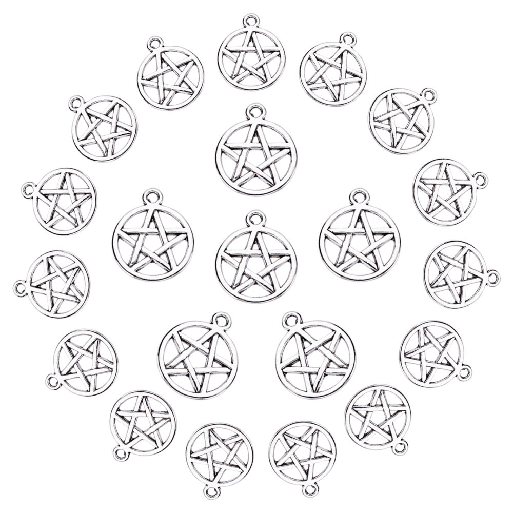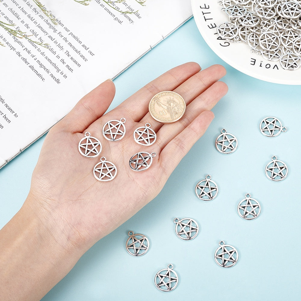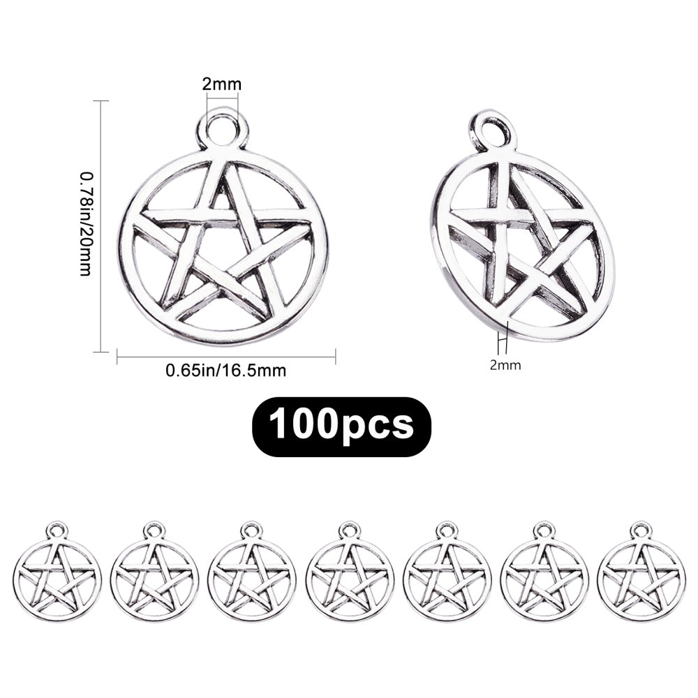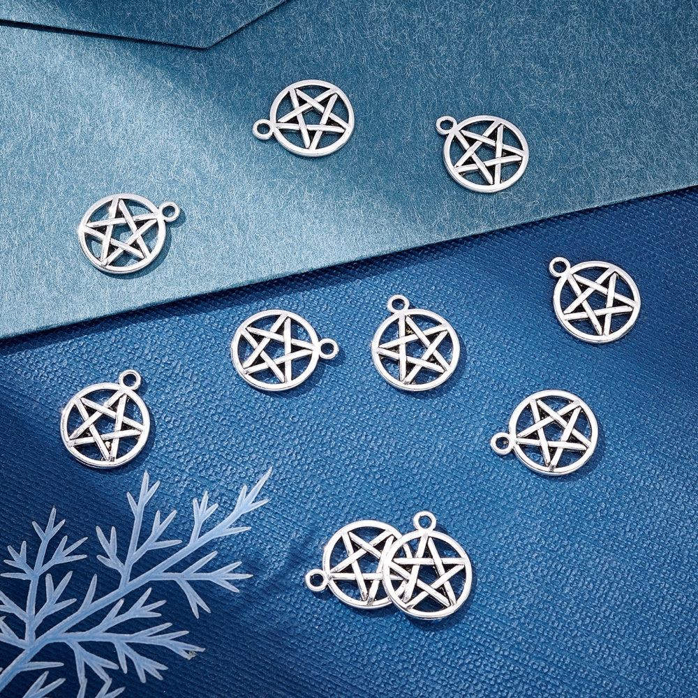Get creative with these 100pcs of antique silver hollow pentacle star alloy pendants perfect for making earrings, necklaces, and bracelets.