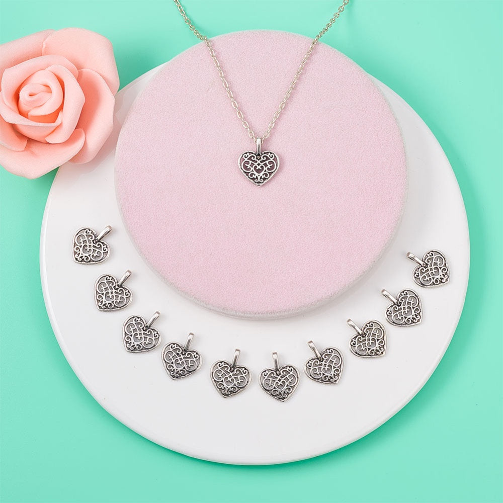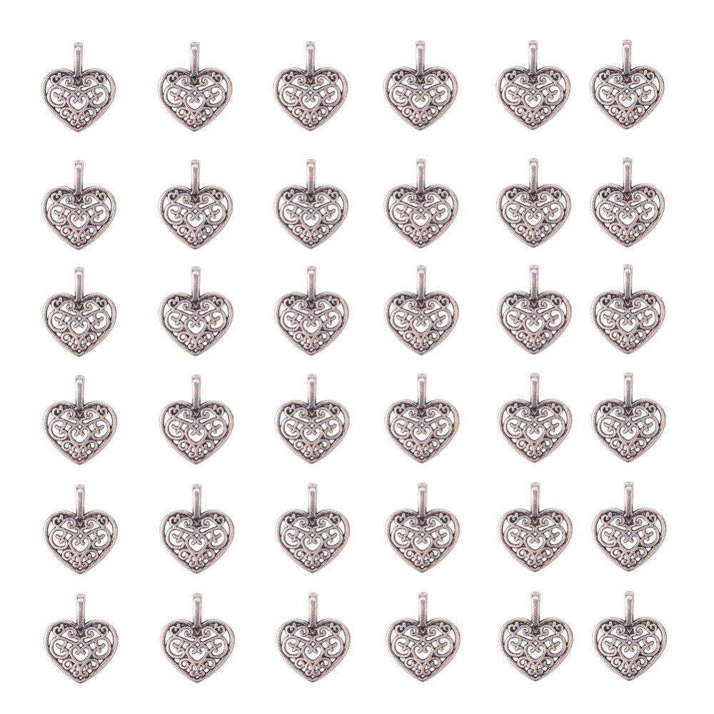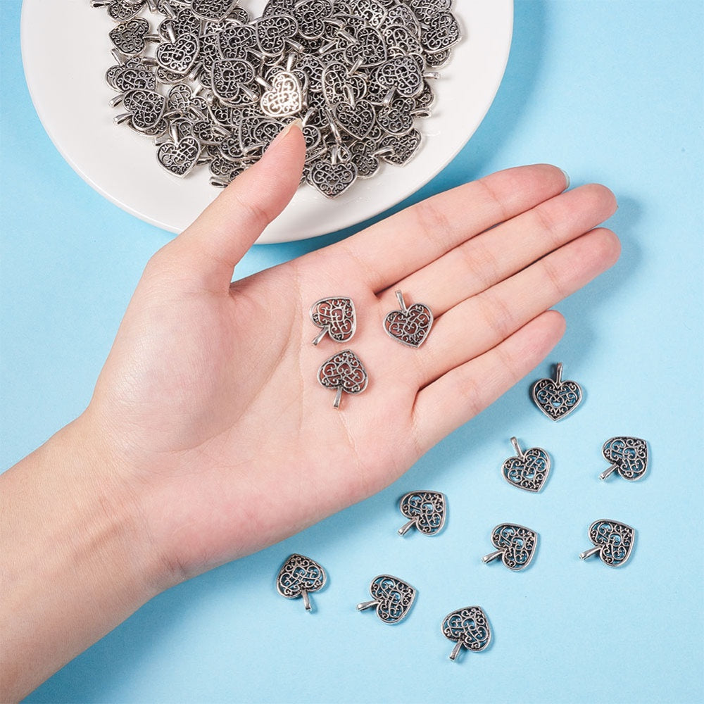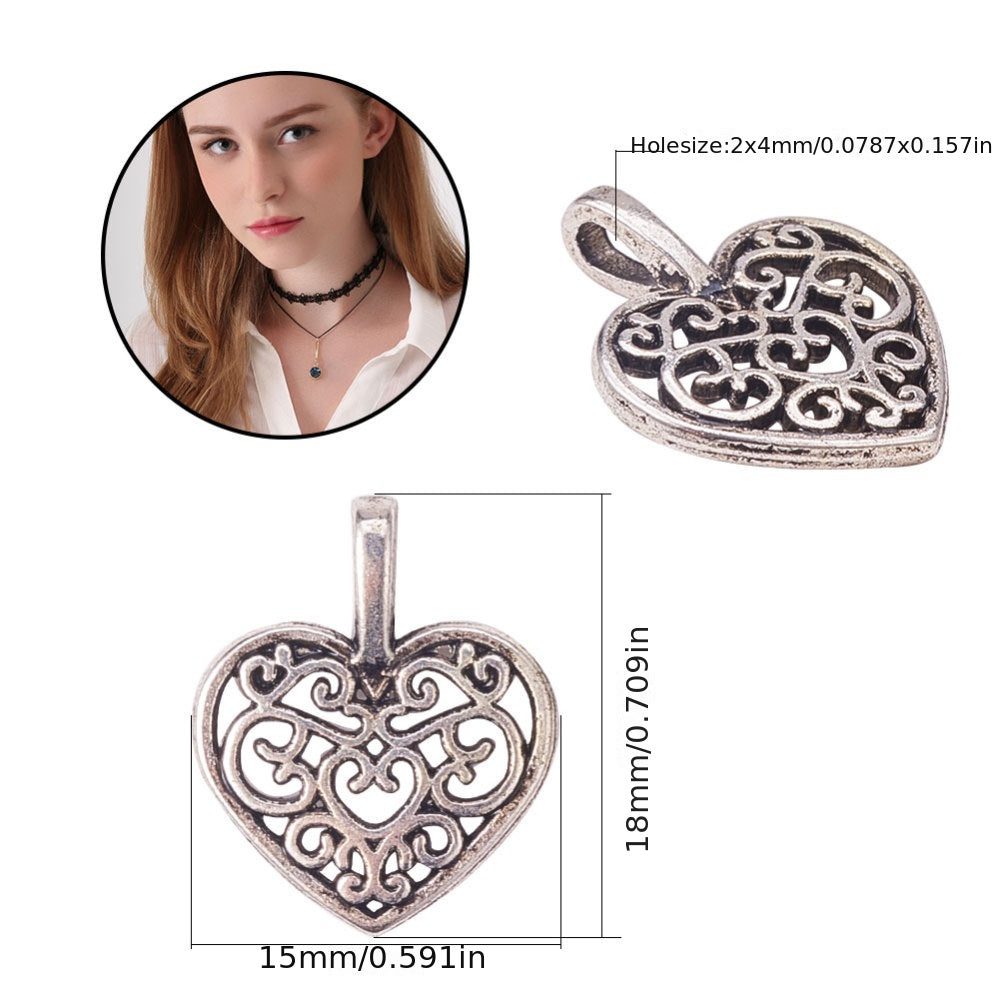 Get a pack of 100 antique silvery leaf heart alloy pendants for your DIY jewelry projects. Each pendant measures 18x15x2mm.