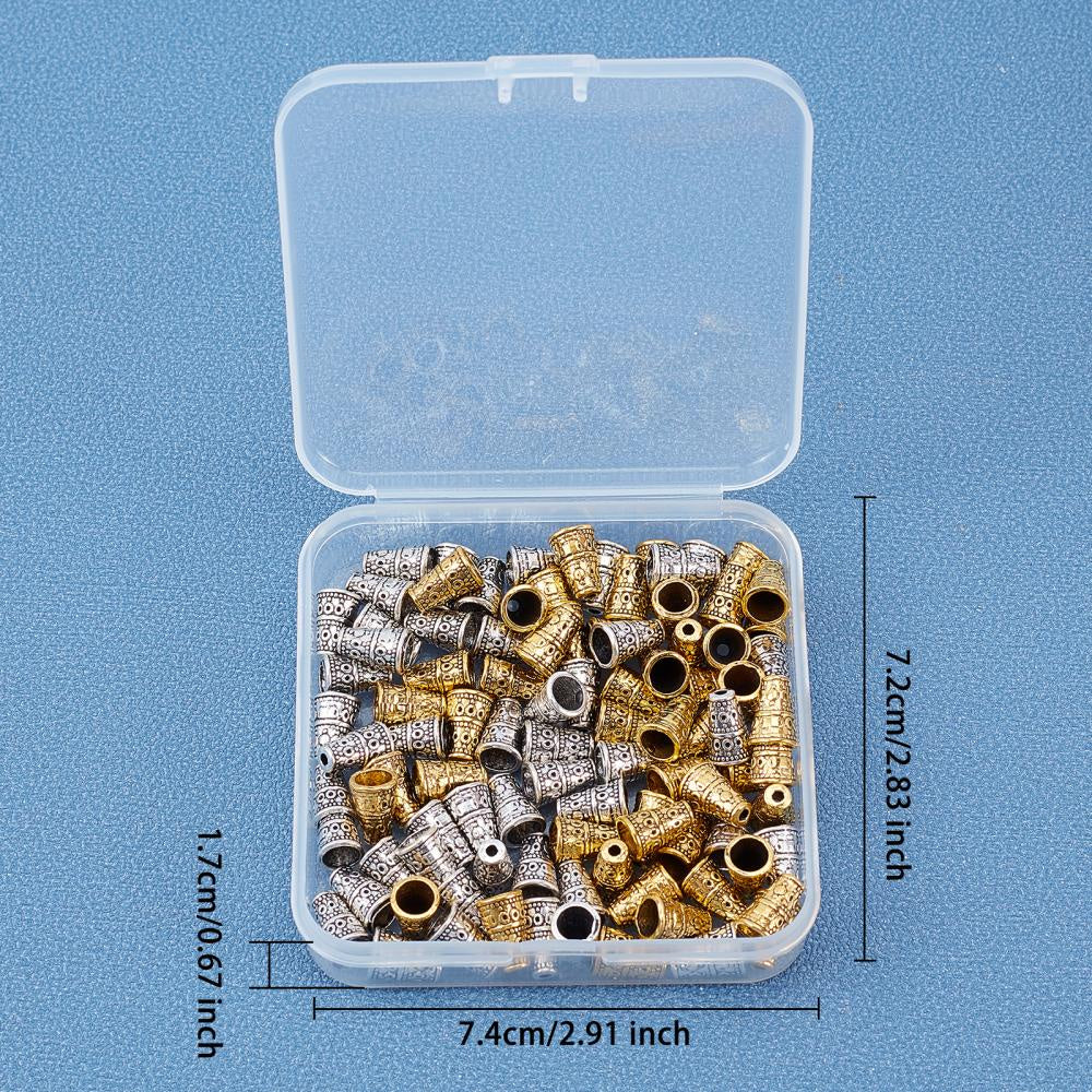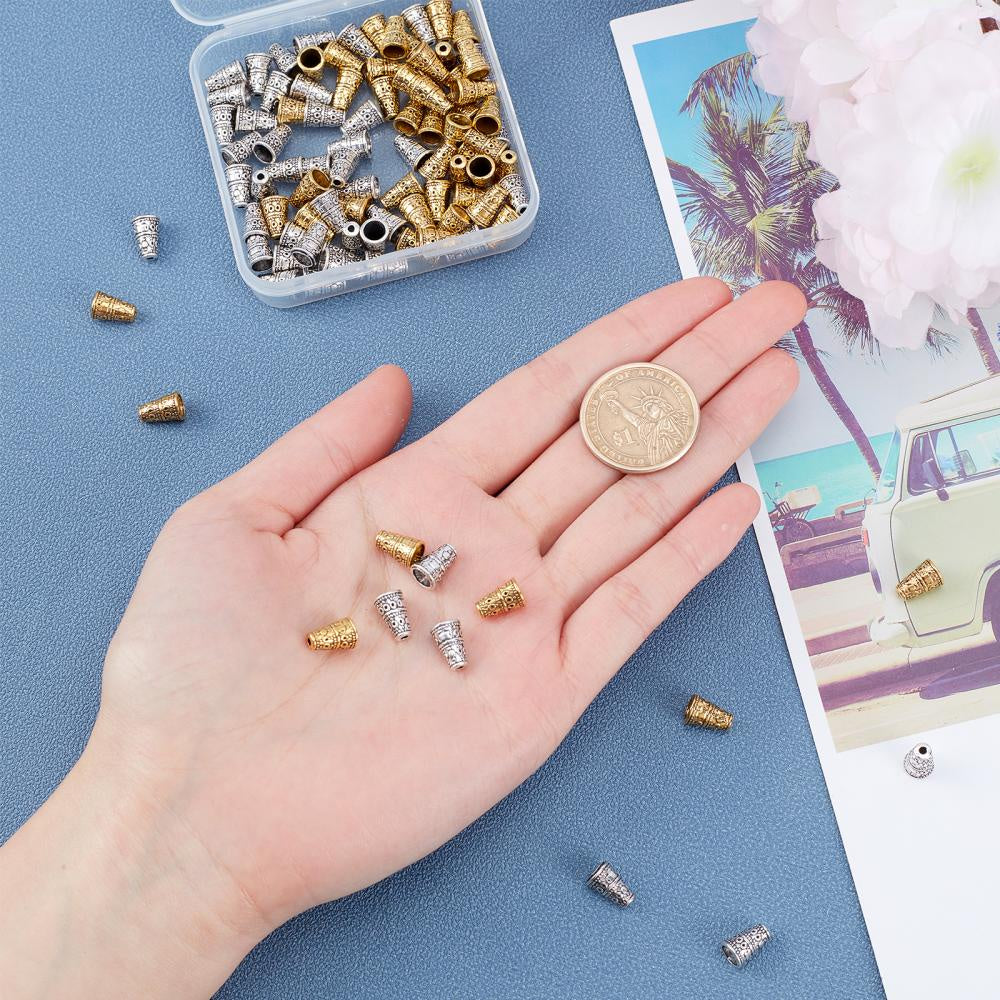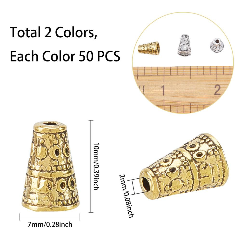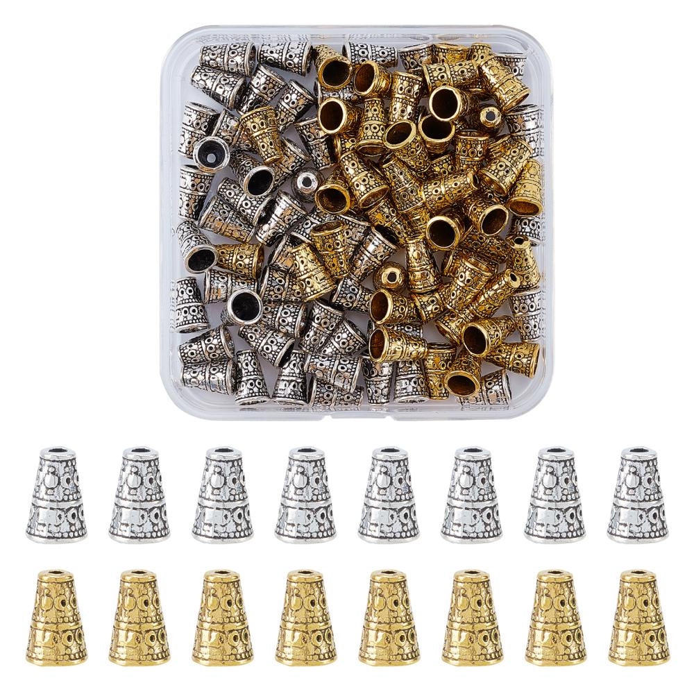 Get this set of 100 cone alloy beads end cap in 2 antique colors for your jewelry making projects. Each cap measures 10x7mm with a 2mm hole.
