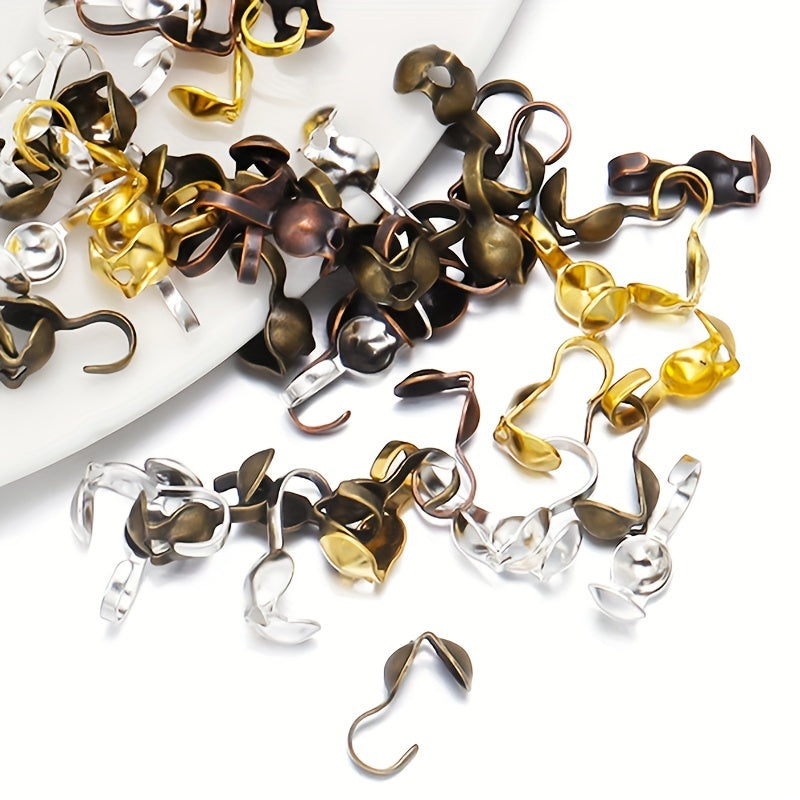This set includes 100 alloy crimp beads with hook cord end caps for various crafting projects. Perfect for creating jewelry, stringing ribbon, or connecting ball chains.