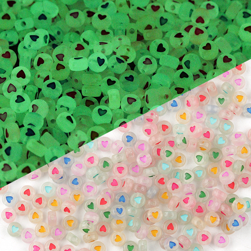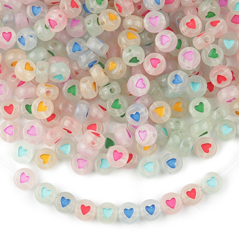 This 100pcs pack of acrylic beads includes colorful letter beads, heart beads, and number beads that glow in the dark. Ideal for creating unique jewelry pieces.