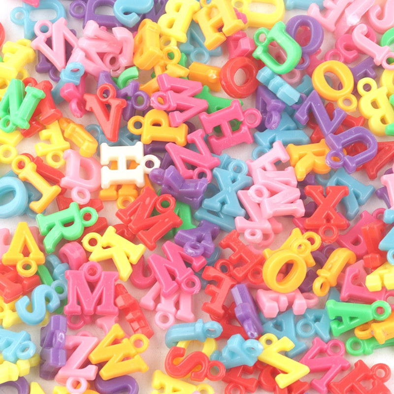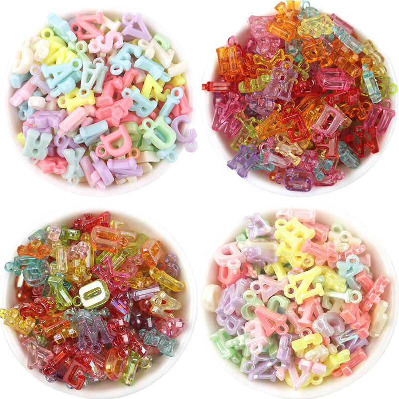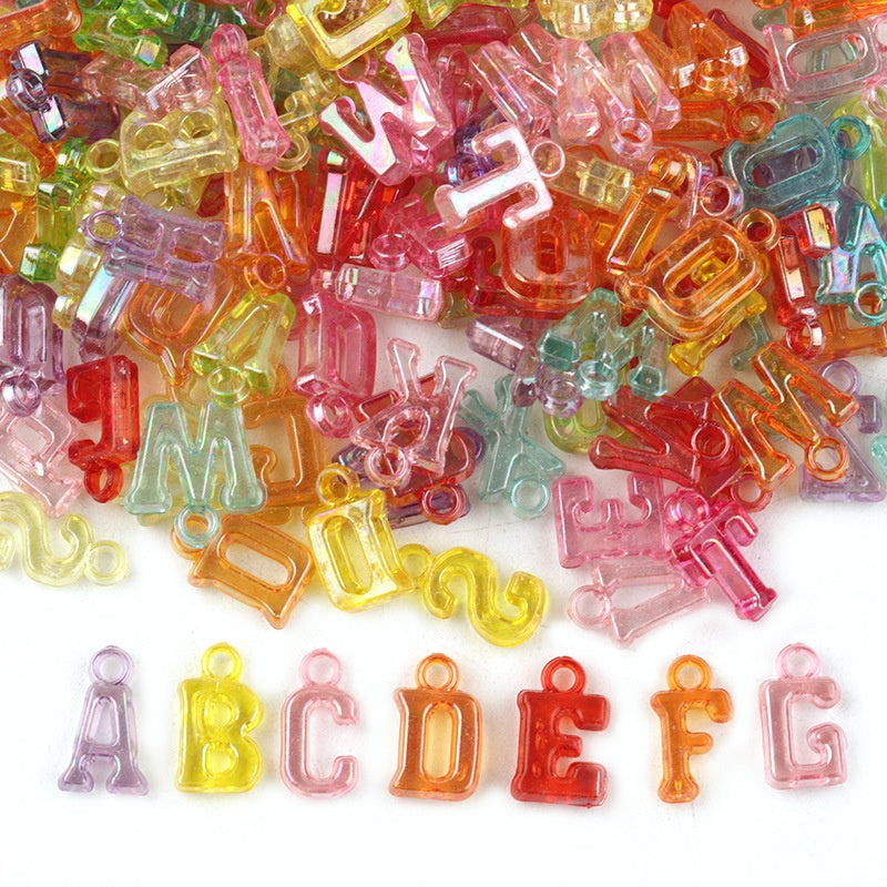 Get this set of 100 plastic letter beads with suspended 3D English letter pendants to create unique jewelry pieces. Perfect for DIY projects and crafting.