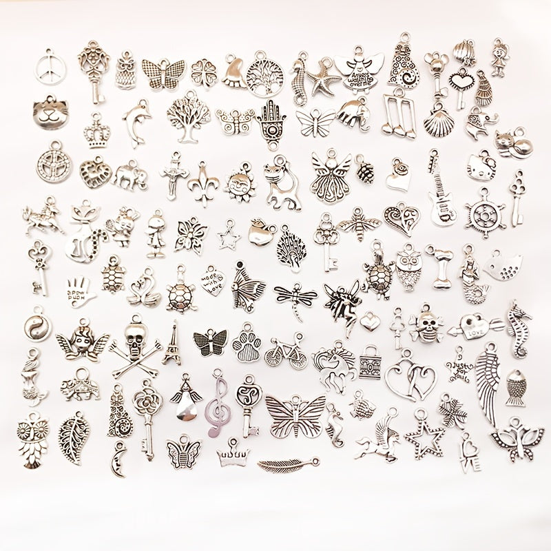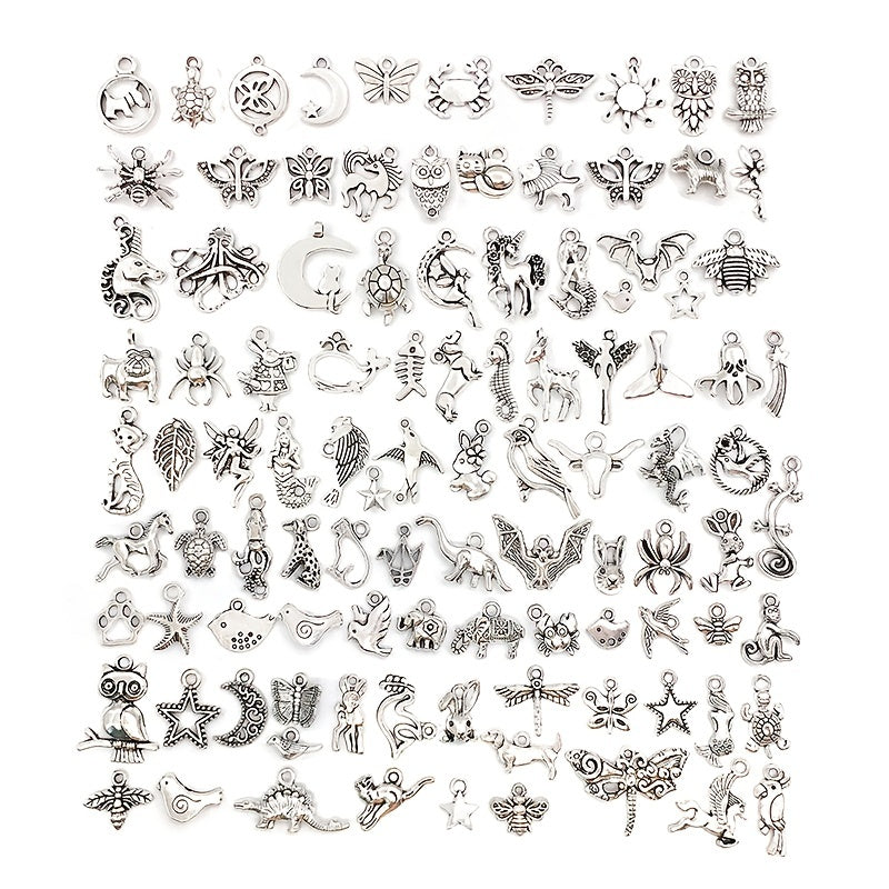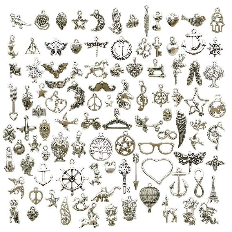 Enhance your jewelry-making projects with this set of 100 mixed silver alloy metal pendants. Perfect for creating bracelets, necklaces, and earrings.