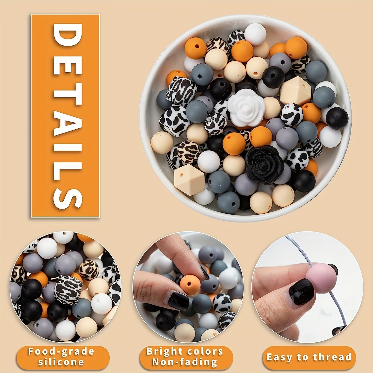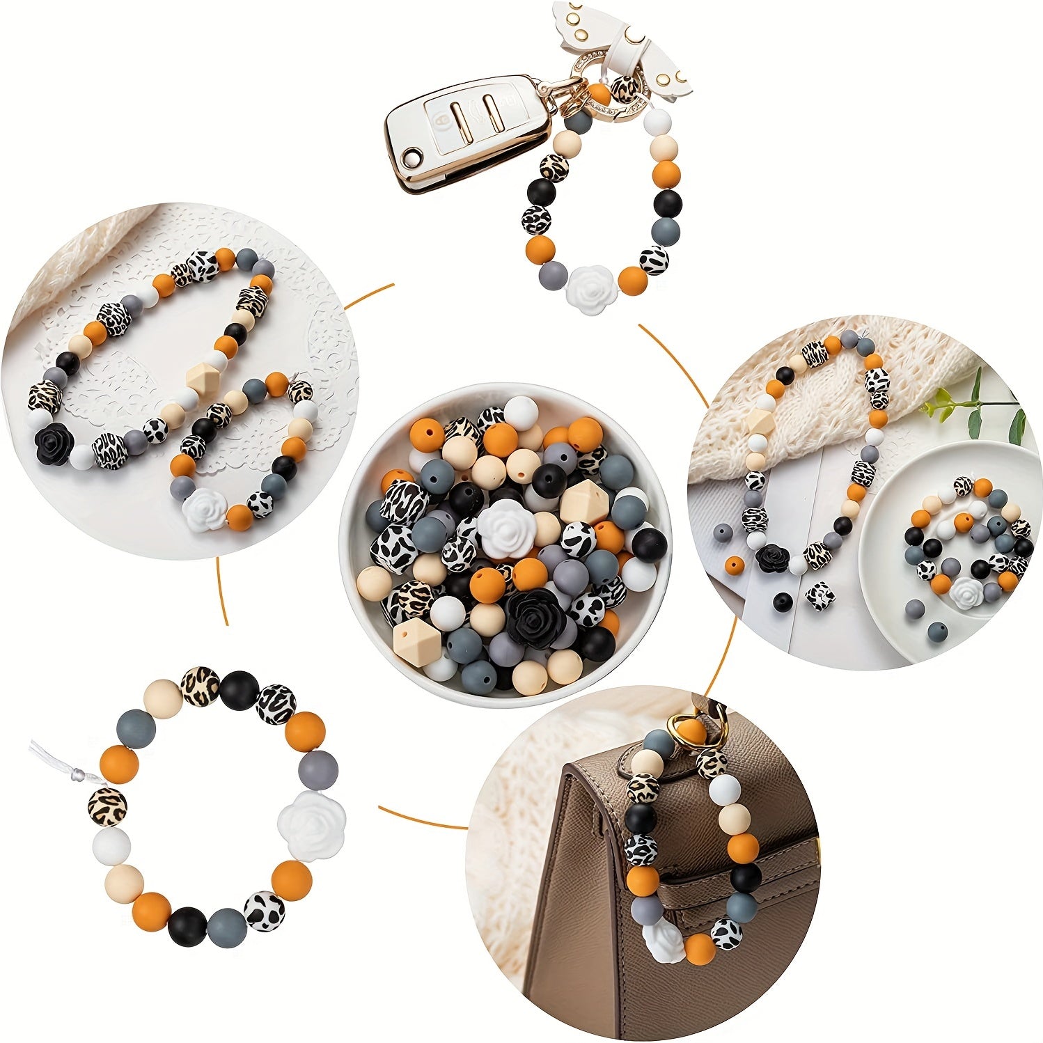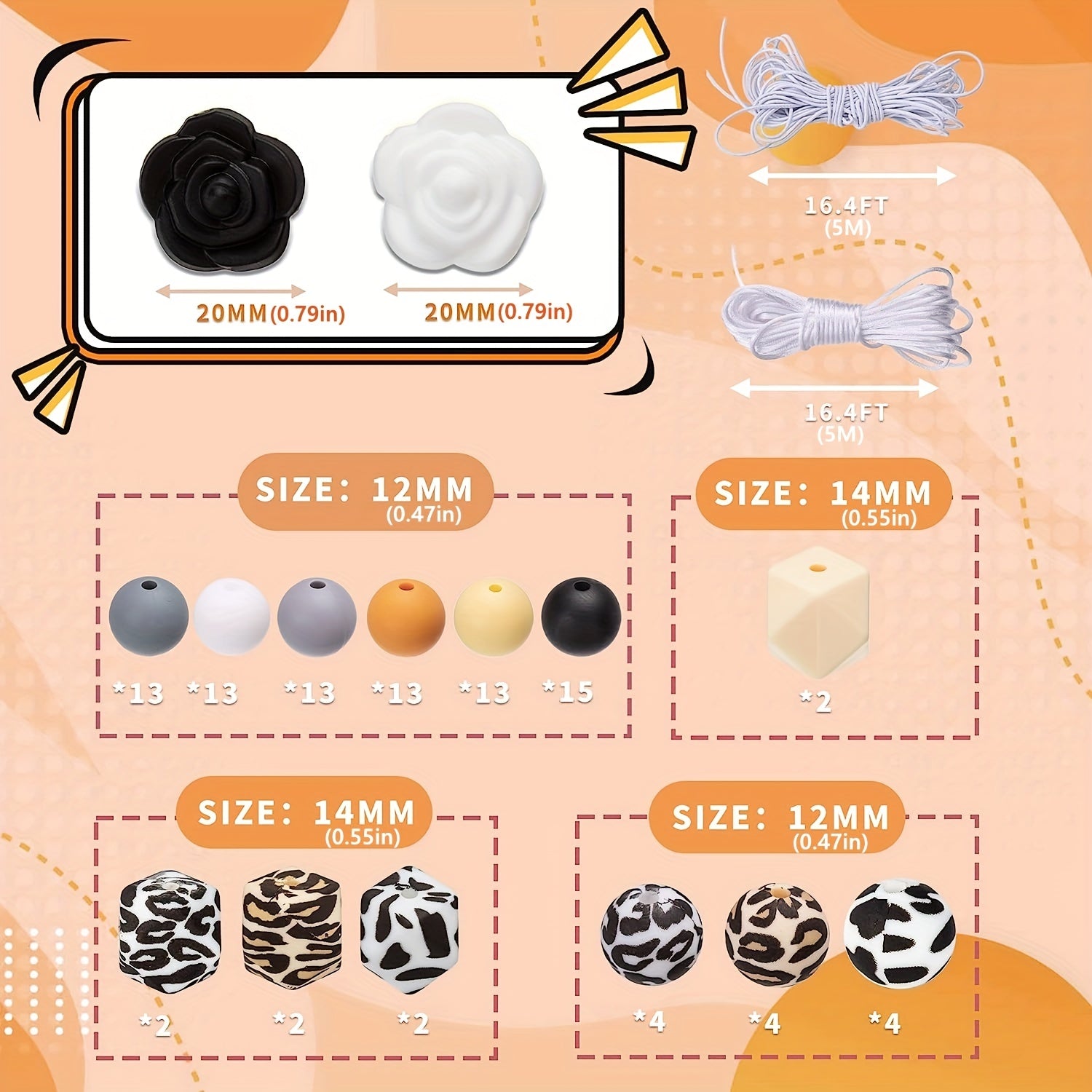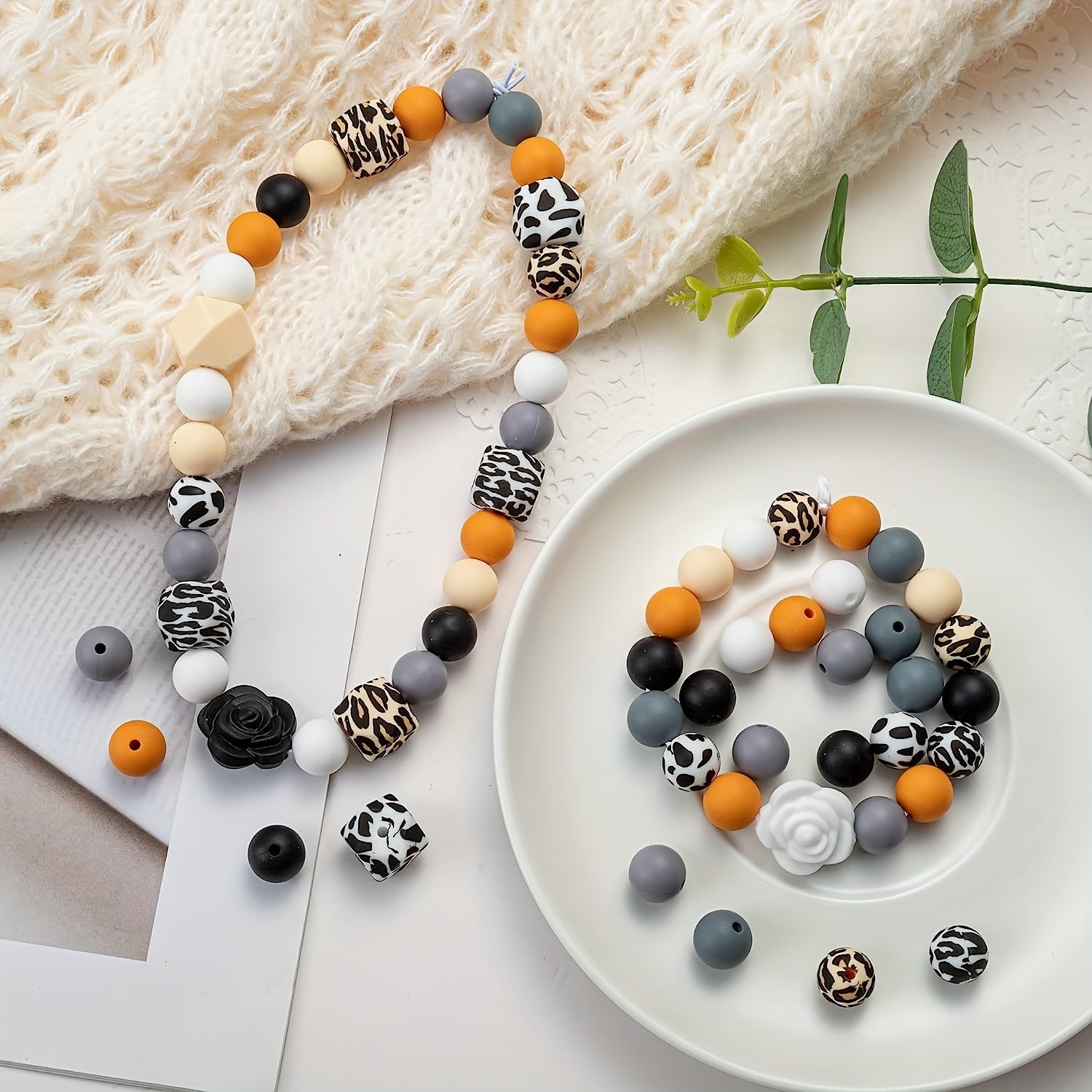 Create stylish jewelry with this set of 102 mixed leopard print silicone round beads, rose flower charms, and square beads. Ideal for earrings, bracelets, necklaces, and other accessories.