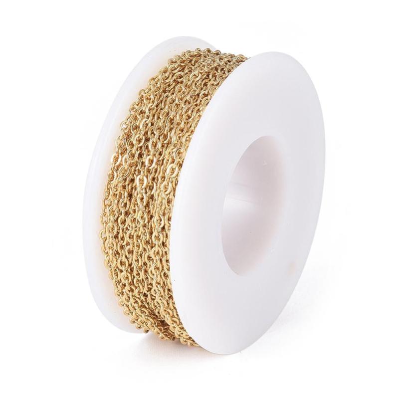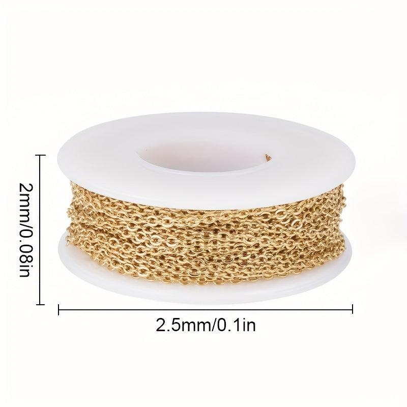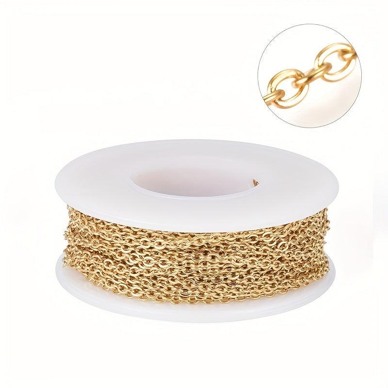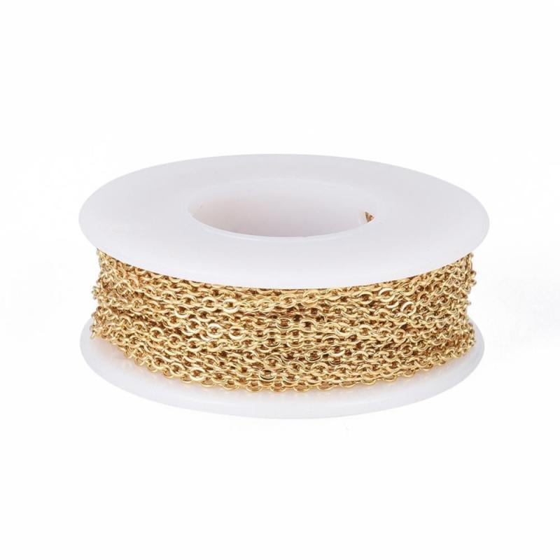 This stainless steel cable chain is perfect for making jewelry or crafts. It is 10 meters long and features a flat cable link design.