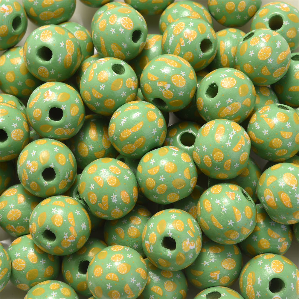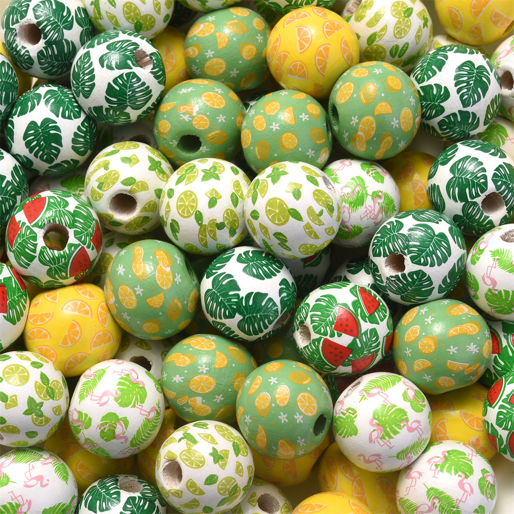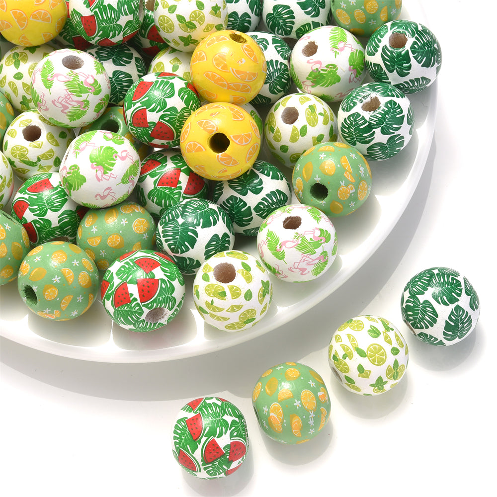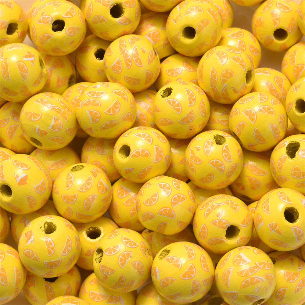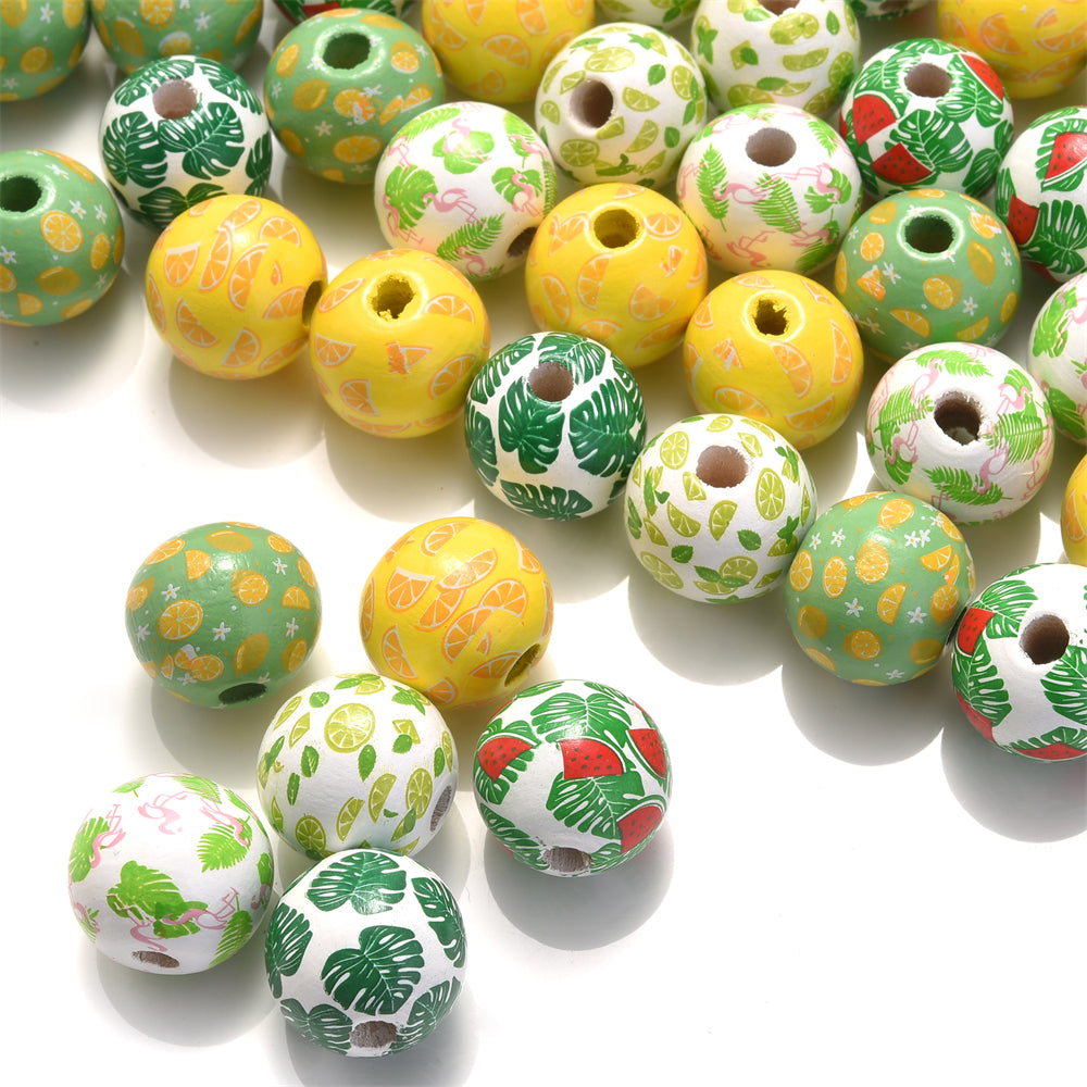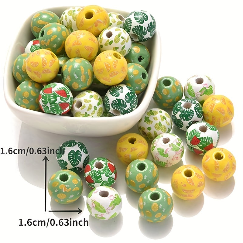 These 16mm wooden beads feature a fruit pattern and are perfect for jewelry making. Use them as spacer beads in your DIY projects.
