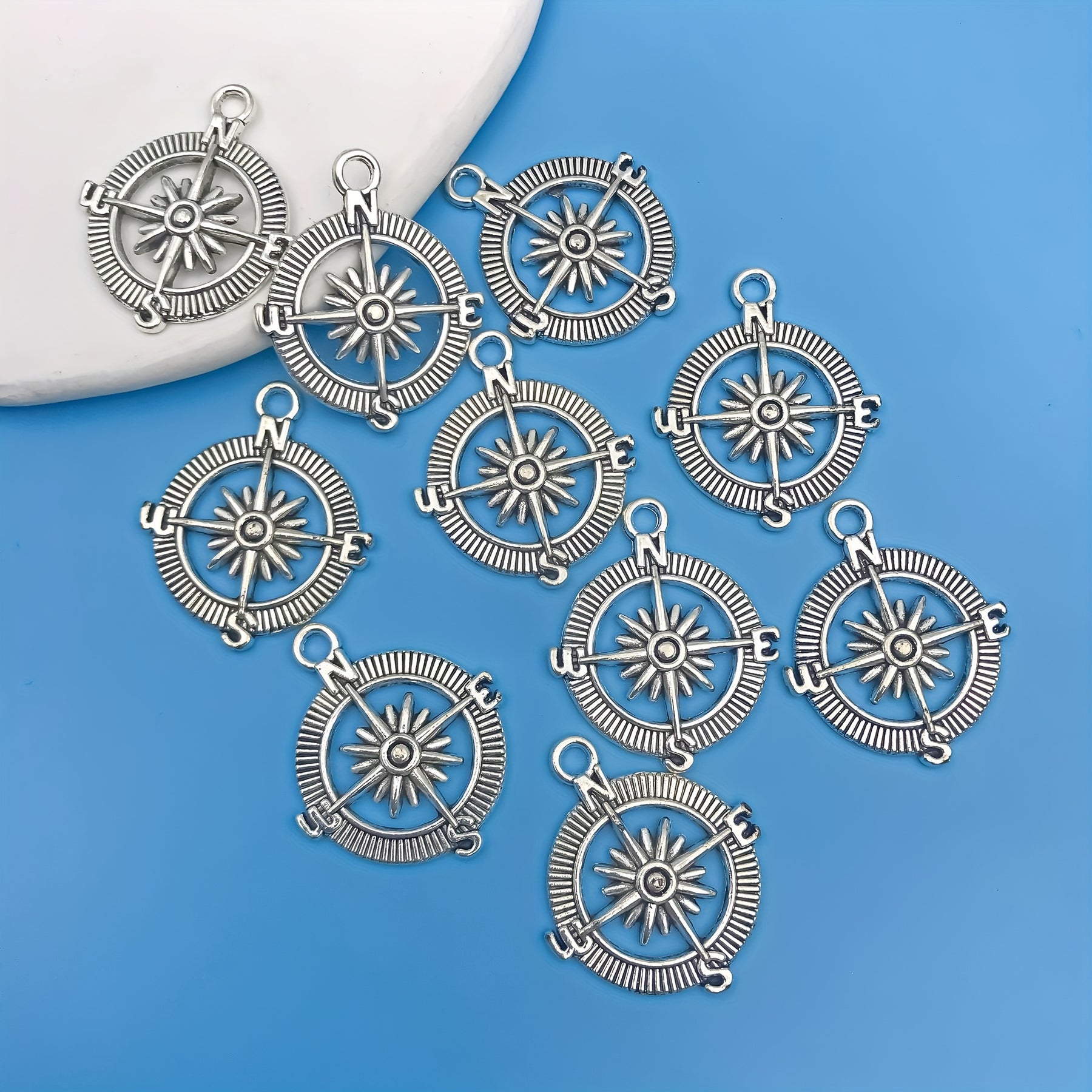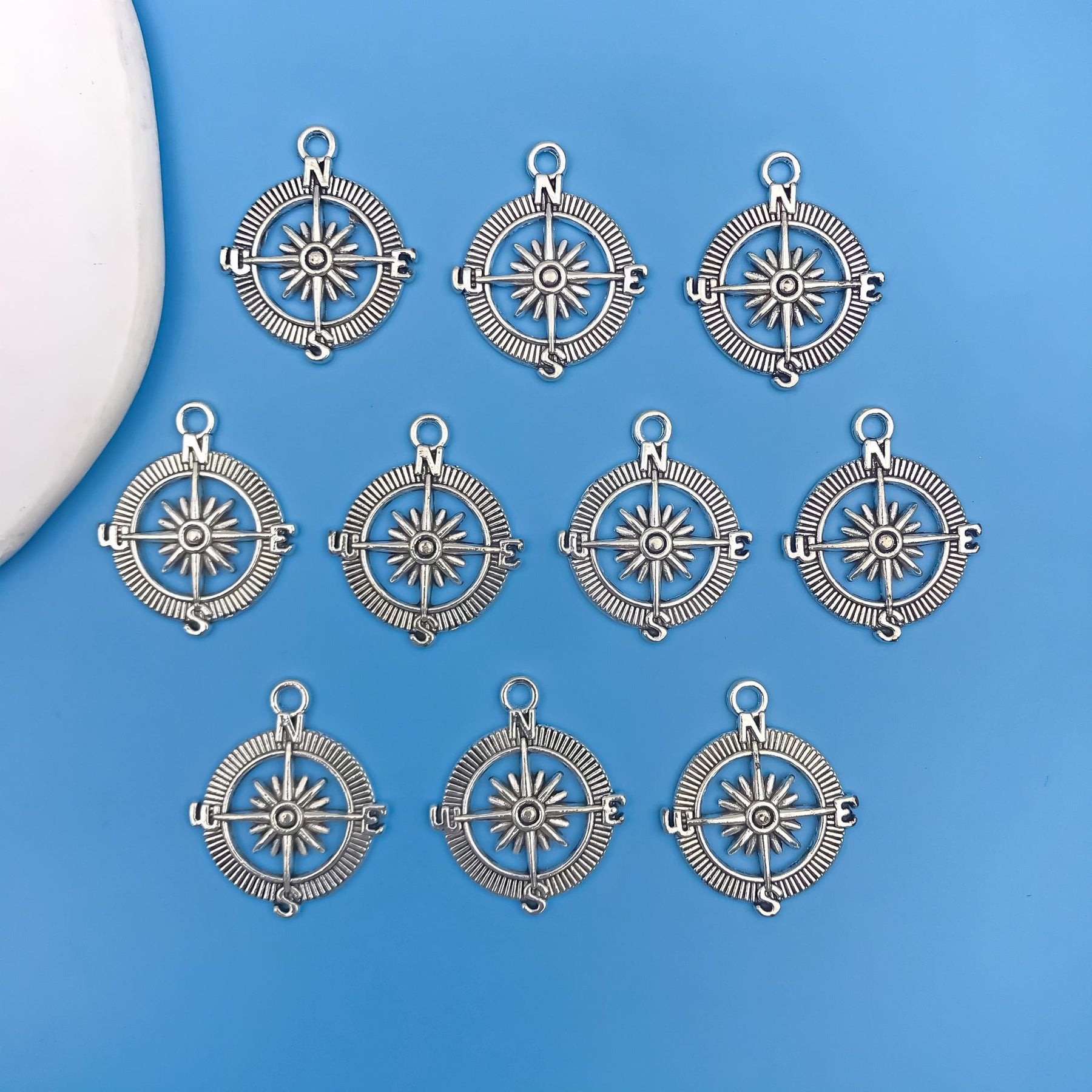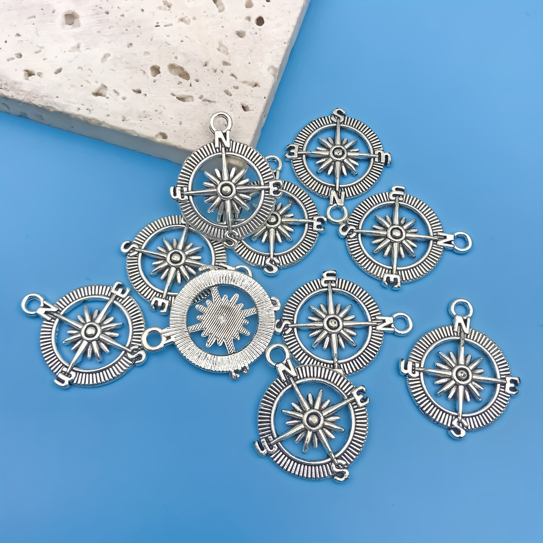 Get creative with these 10pcs of zinc alloy antique silver compass shape charms pendants. Perfect for adding a unique touch to your necklace, bracelet, earrings, and other jewelry making projects.