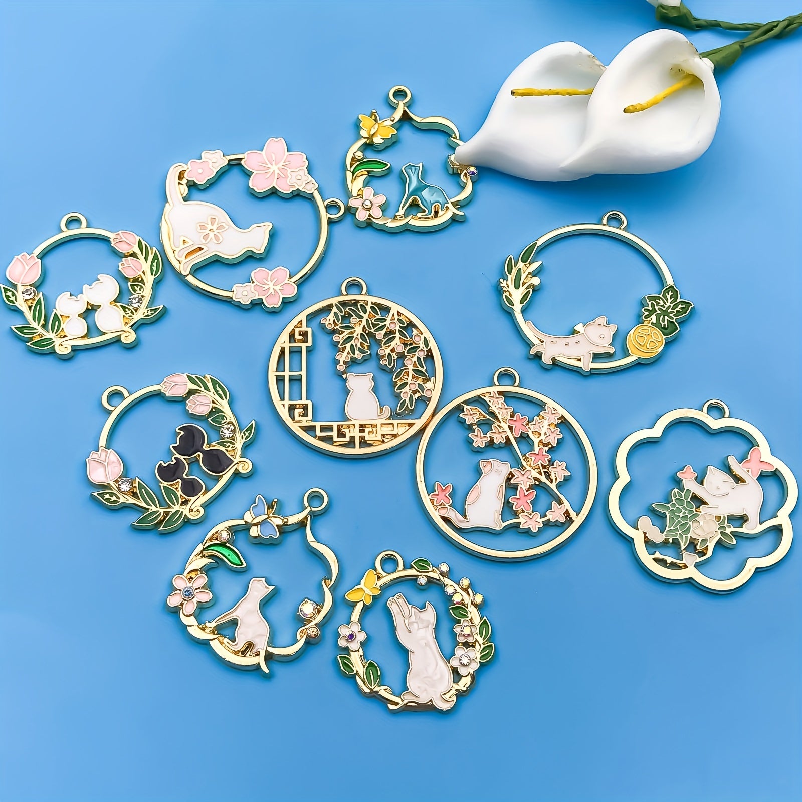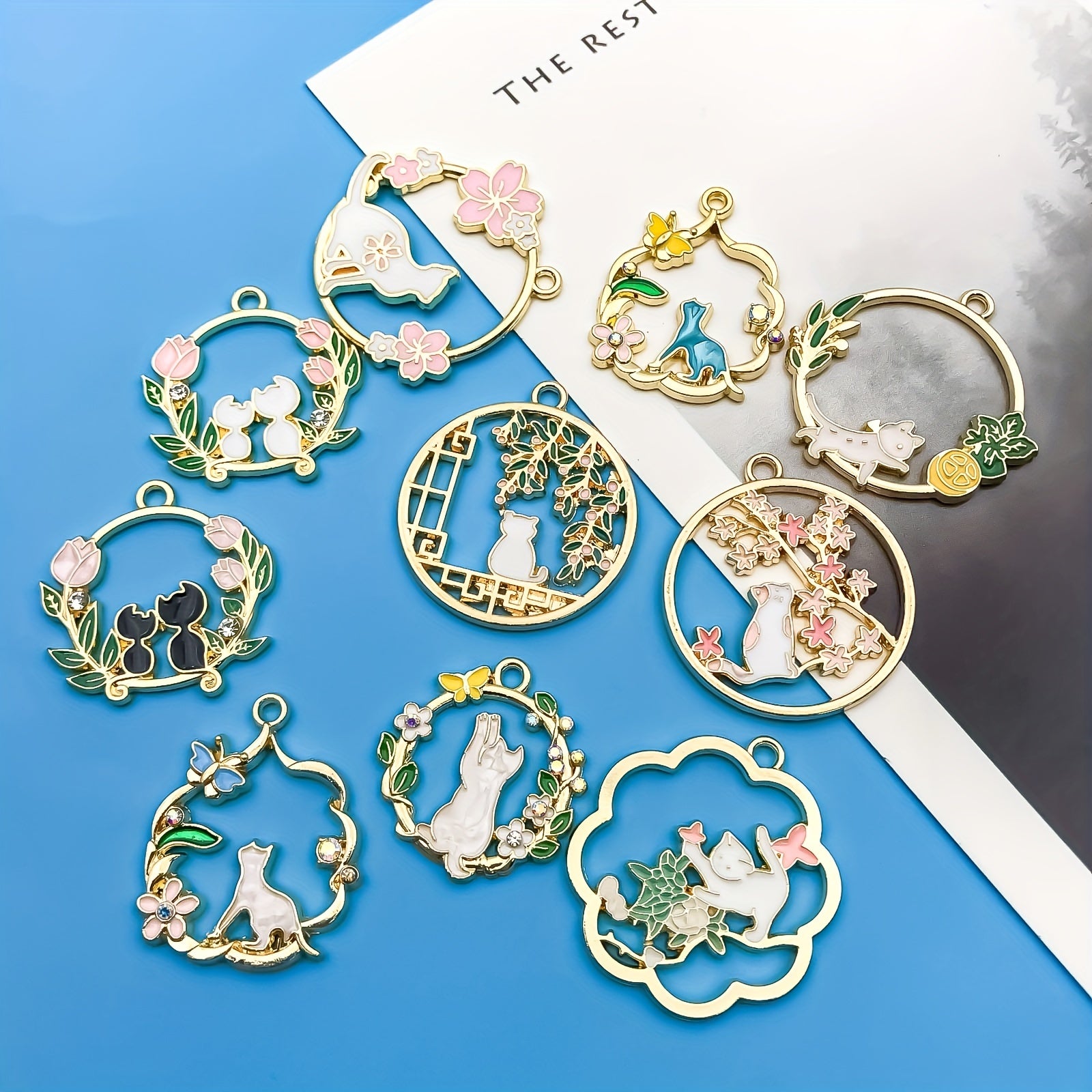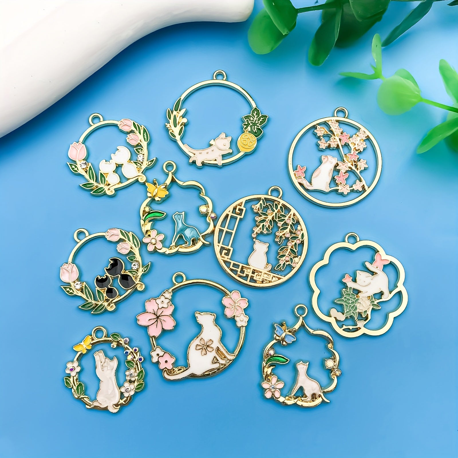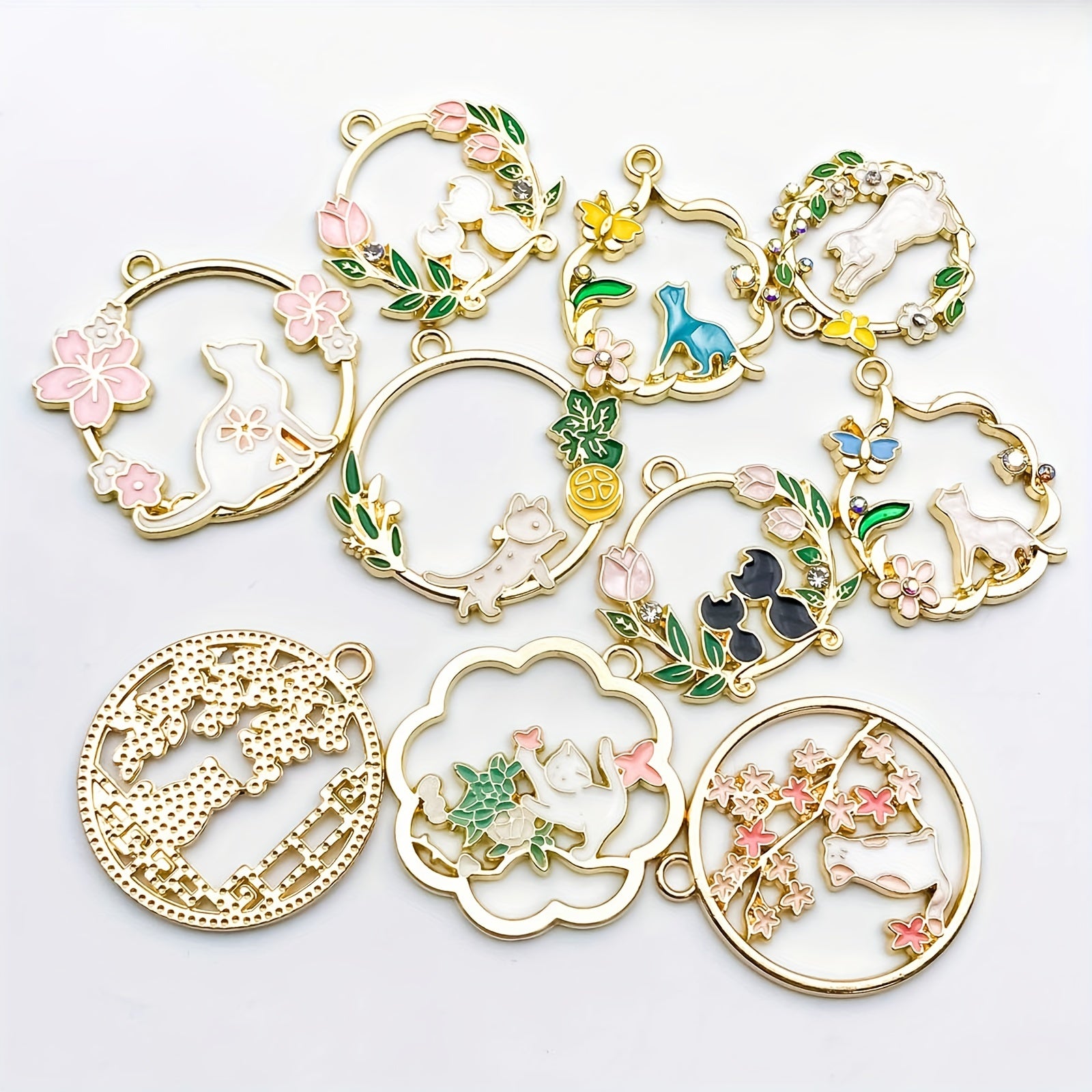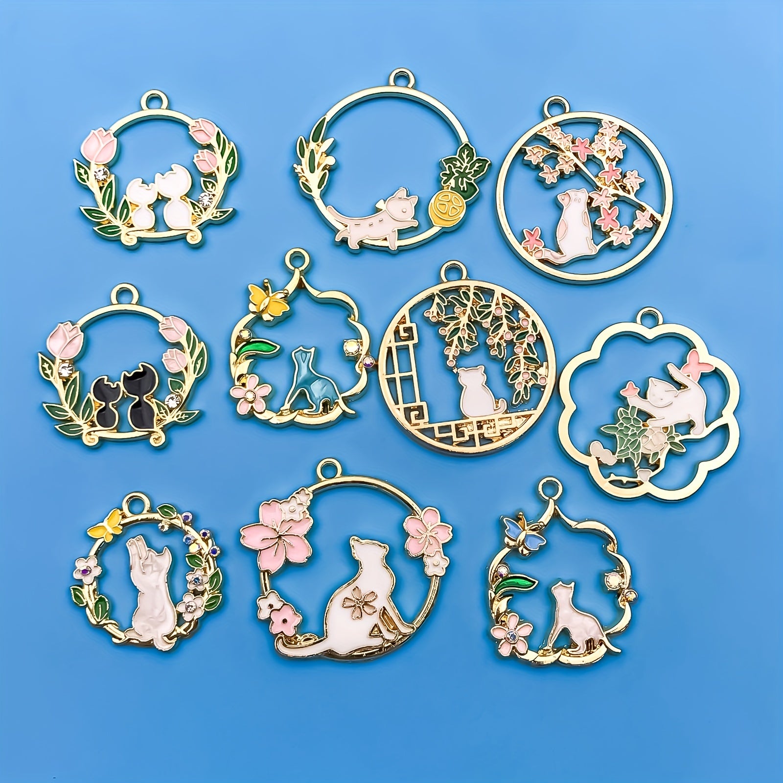 Add a touch of whimsy to your accessories with this set of 10 colorful enamel cat pattern hollow circle pendants. Perfect for creating earrings, bracelets, necklaces, and more.