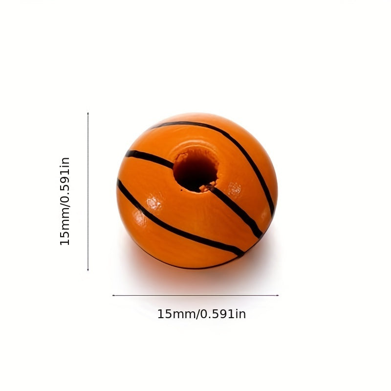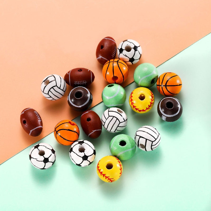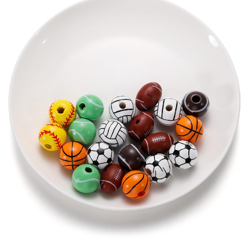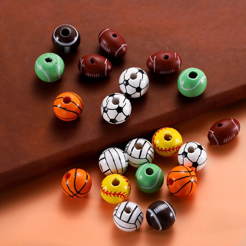 This pack includes 10 round wooden beads in assorted colors, perfect for craft projects. The beads are made of solid wood and feature a basketball and football design on the base.