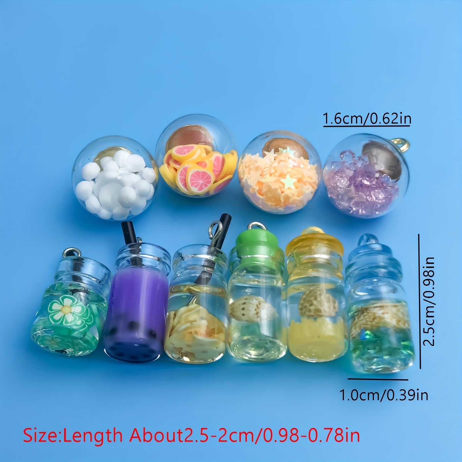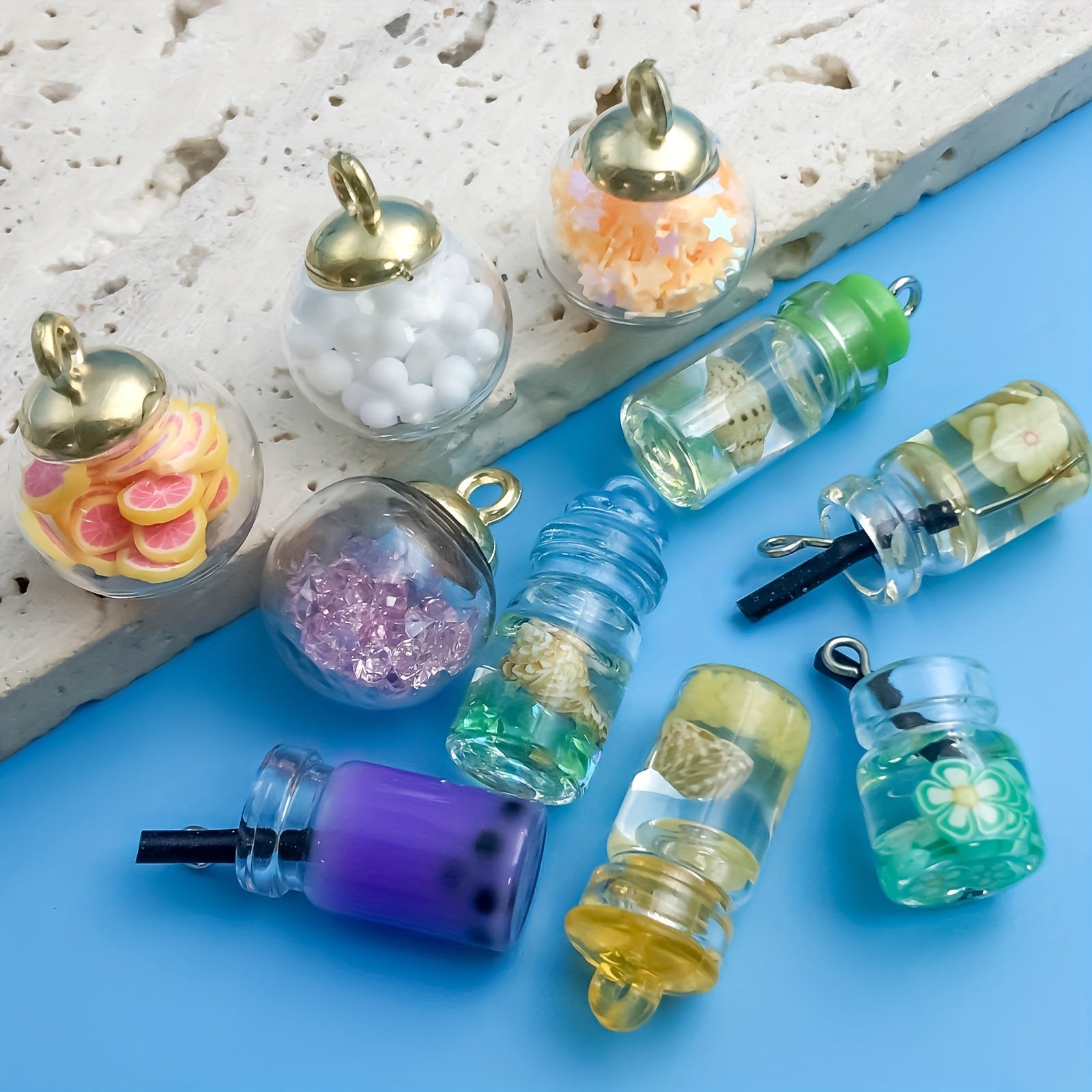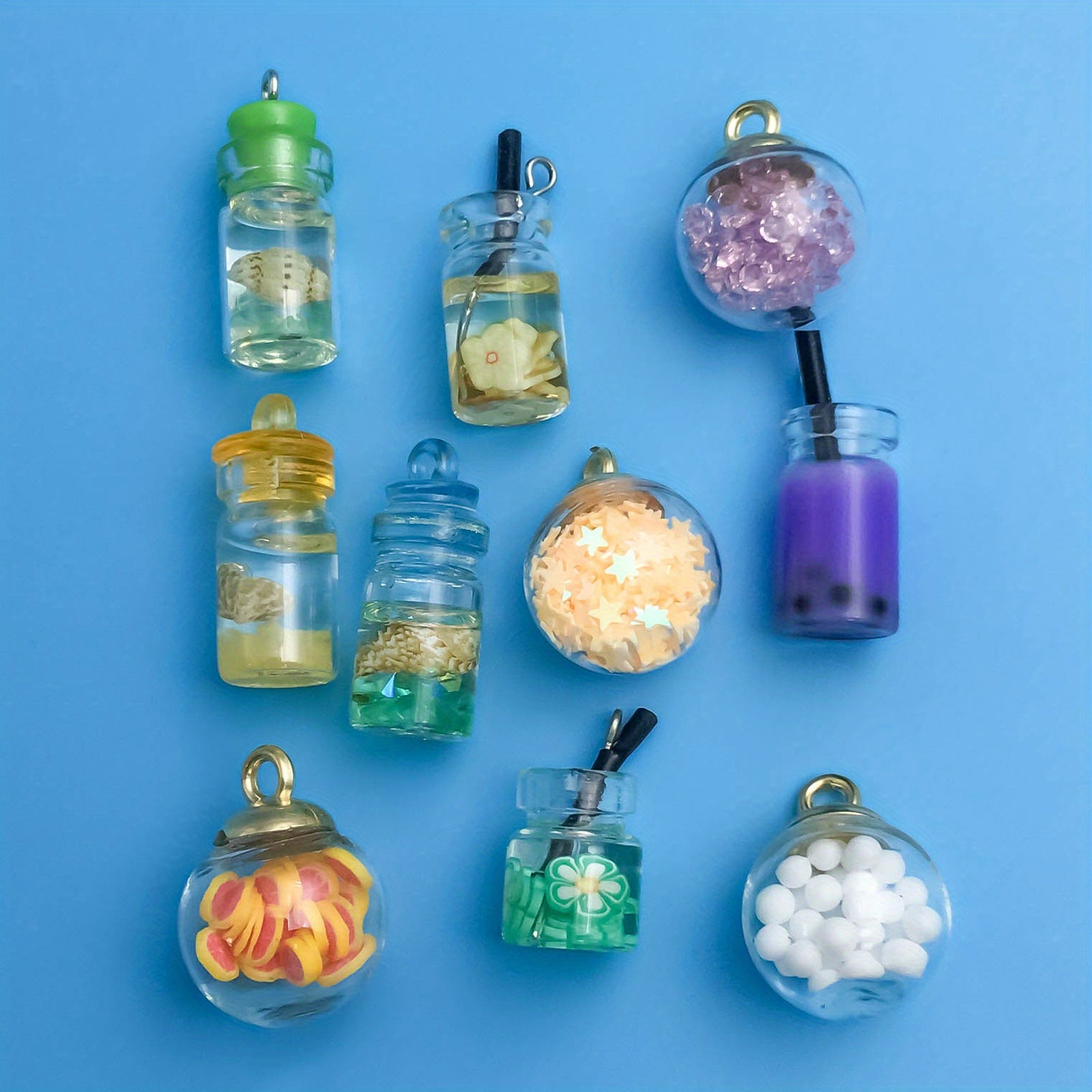 Enhance your jewelry-making projects with this 10-piece set of transparent glass ball charms. Each charm features a wishing bottle design, perfect for creating personalized necklaces, bracelets, and more.