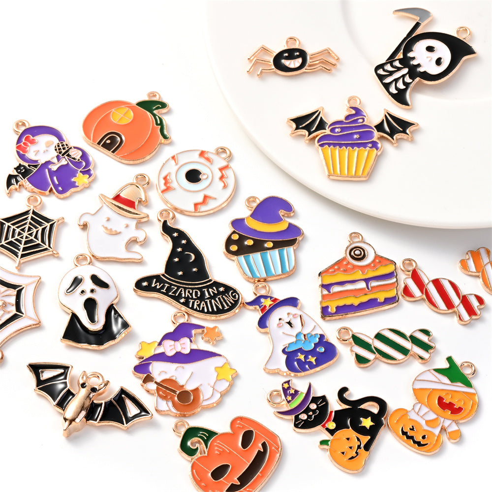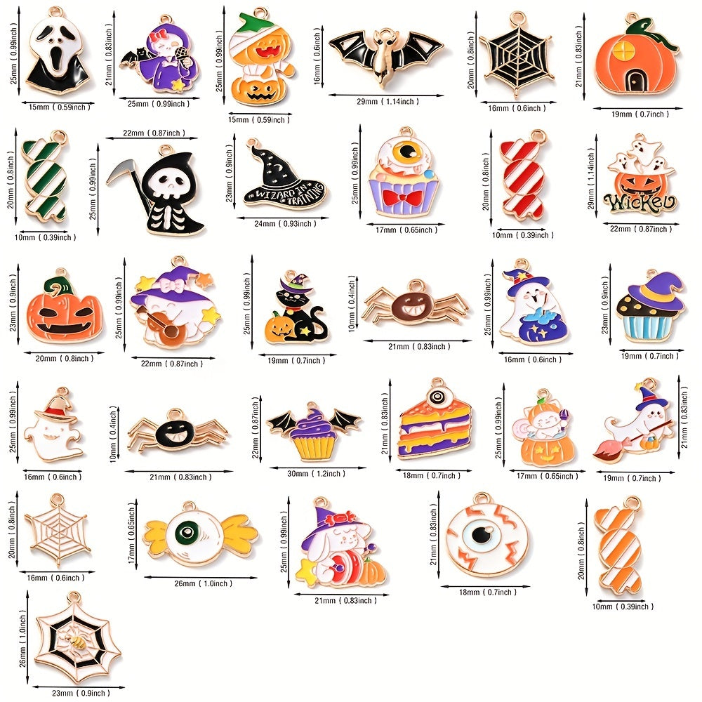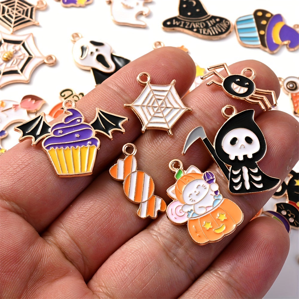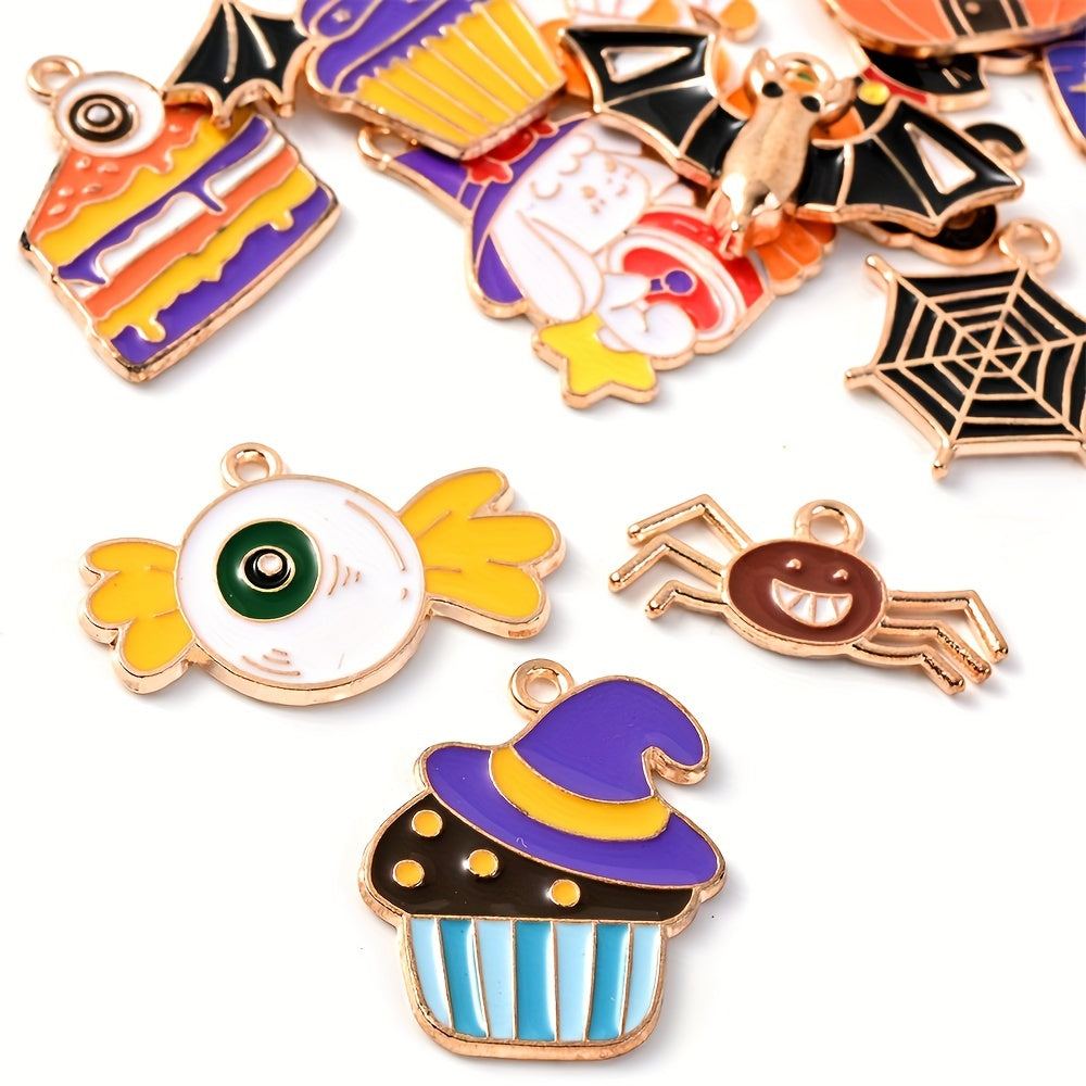 Add a spooky touch to your Halloween crafts with this set of 10 assorted alloy charms featuring enamel pumpkin, candy, ghost, and spider designs. Perfect for jewelry making, scrapbooking, and other creative projects.