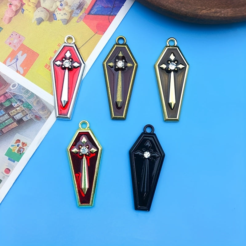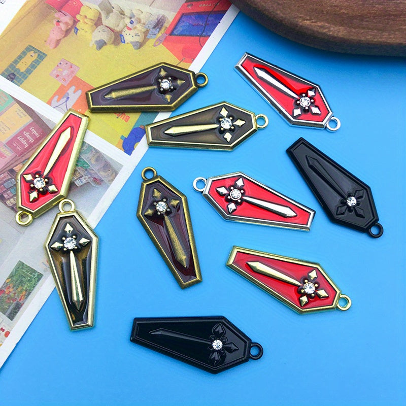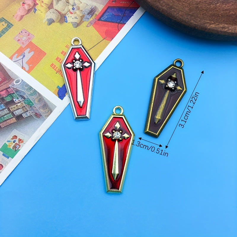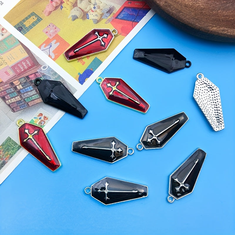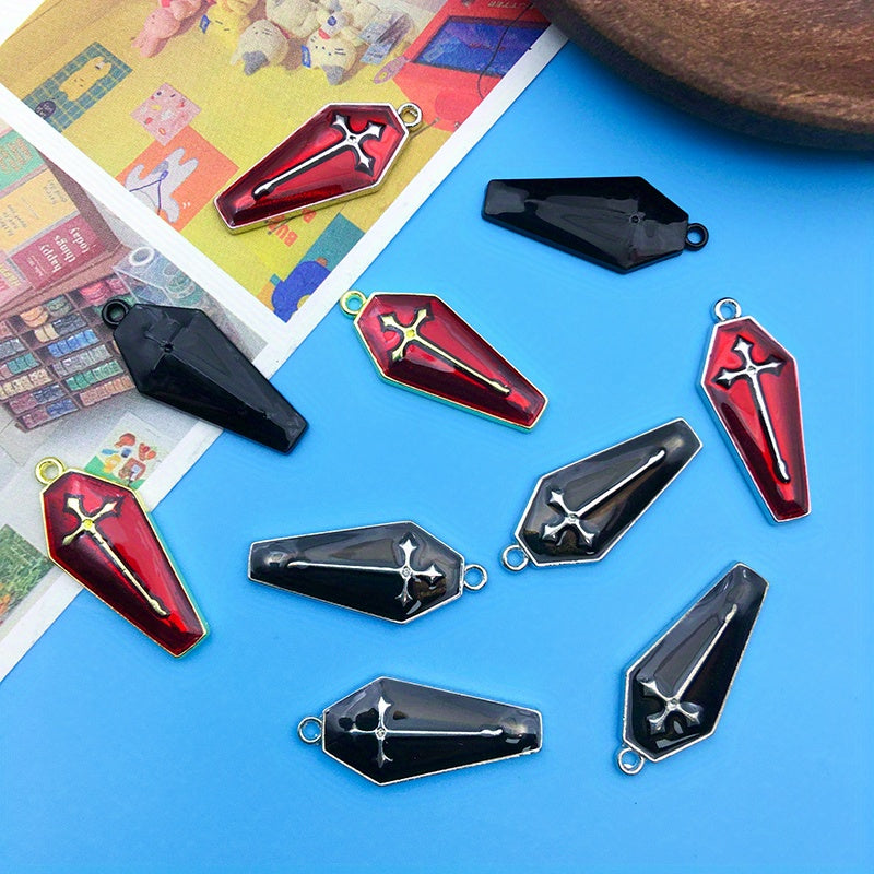 Enhance your Halloween-themed jewelry crafts with these 10pcs enamel red cross coffin alloy pendants. Ideal for bracelets, necklaces, and other DIY jewelry projects.