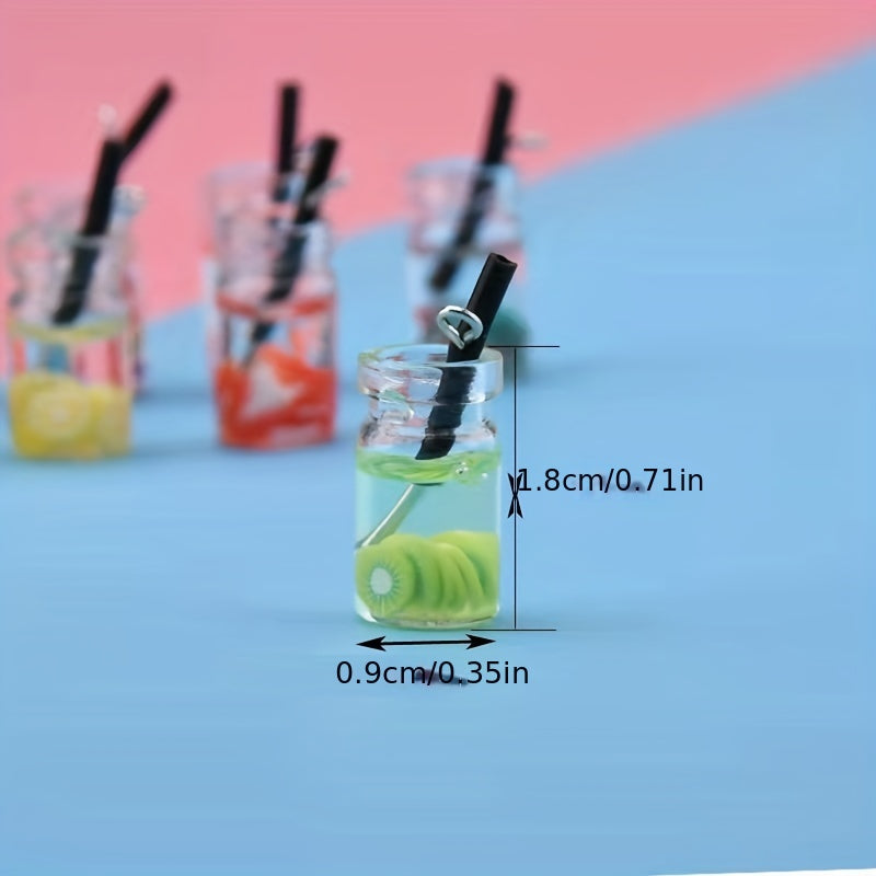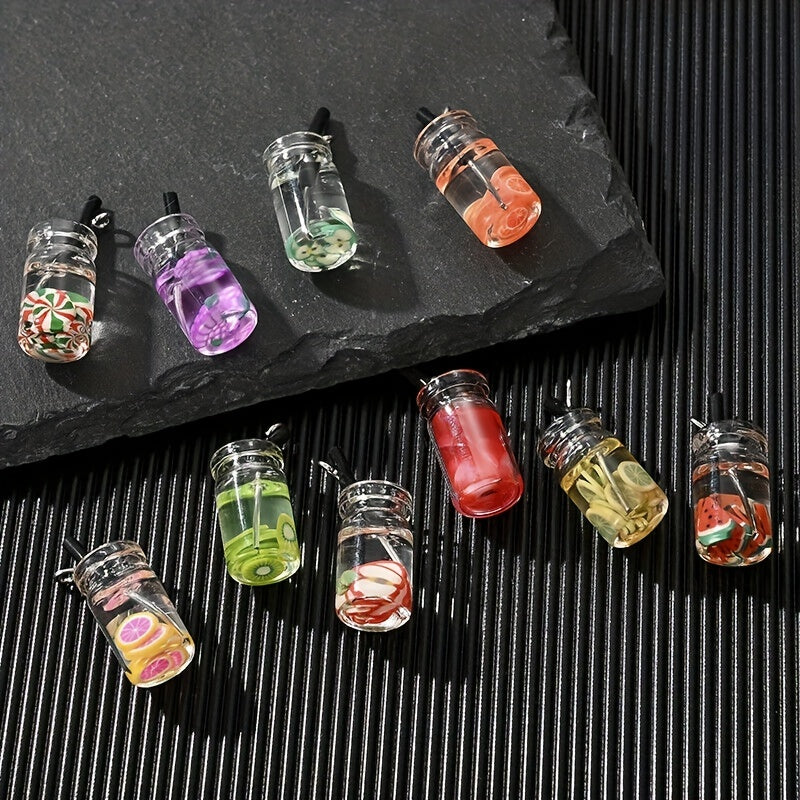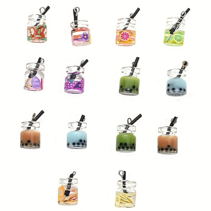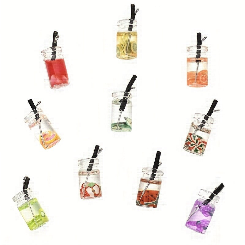 Get a mix pack of 10 charming milk tea and fruit tea resin mini bottle pendants for your DIY projects.