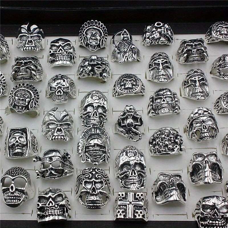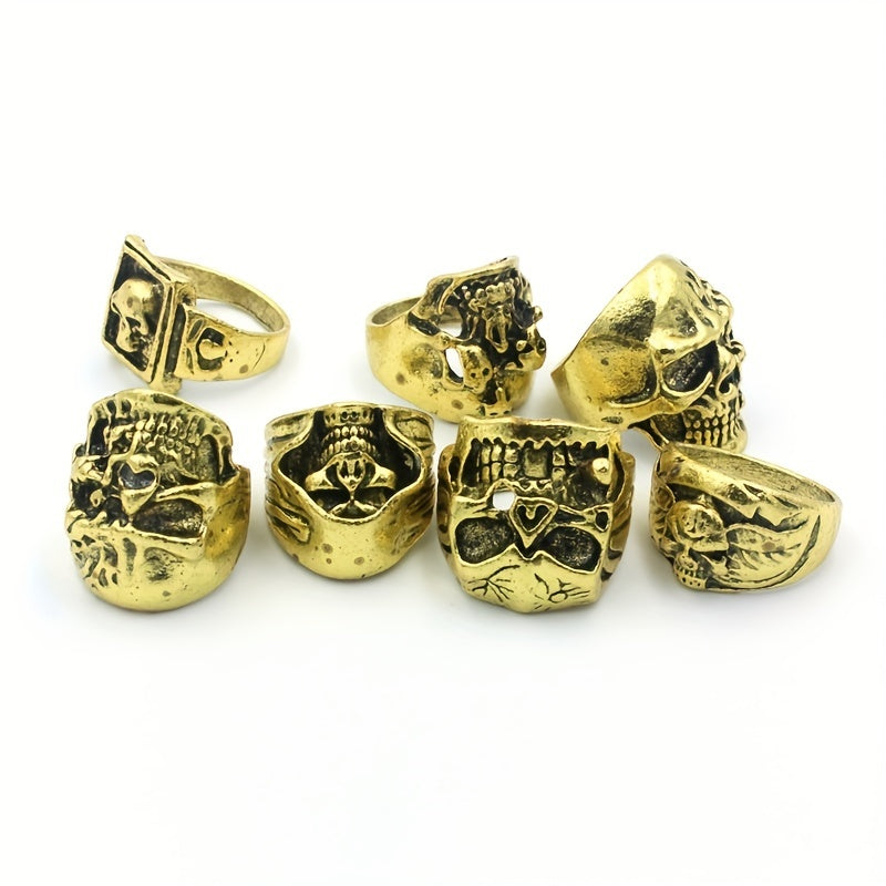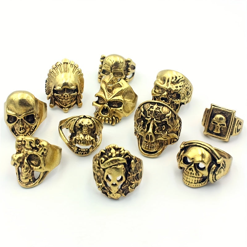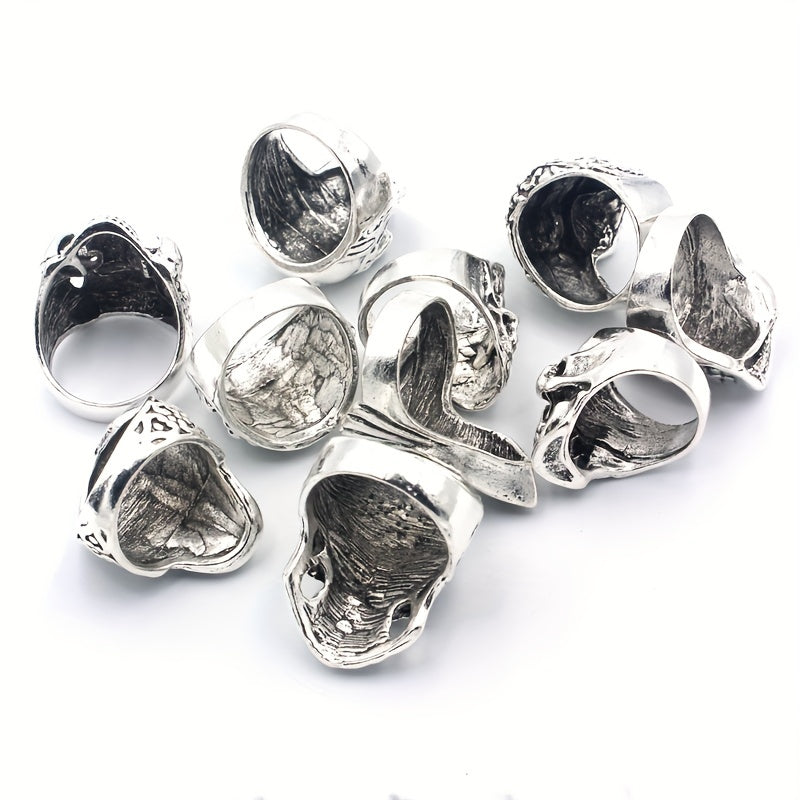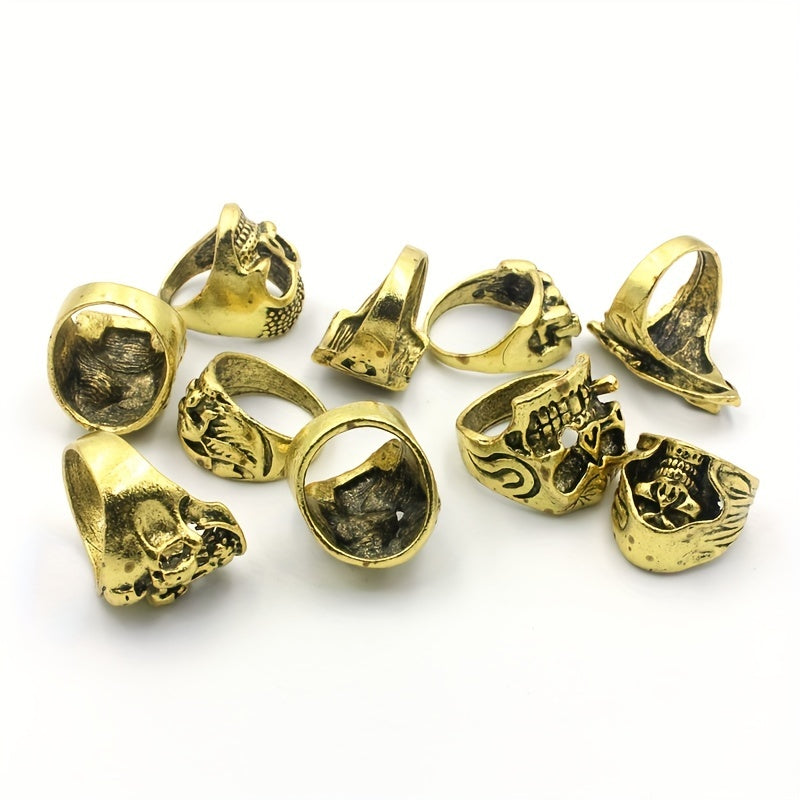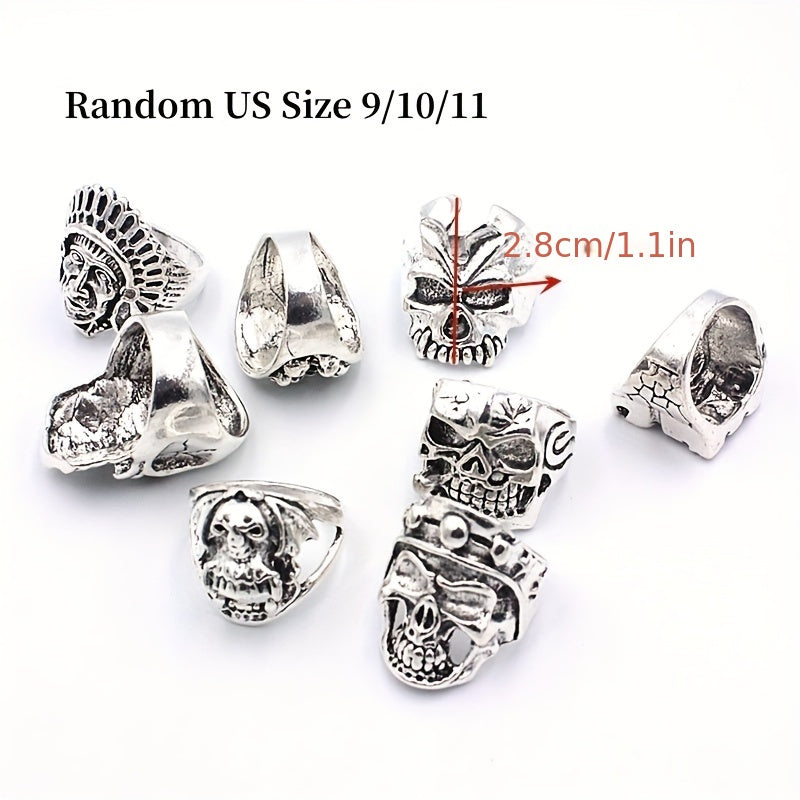 Get a set of 10 mixed skull head rings perfect for a punk, hip hop, or gothic style. Random sizes included for a unique and edgy look.