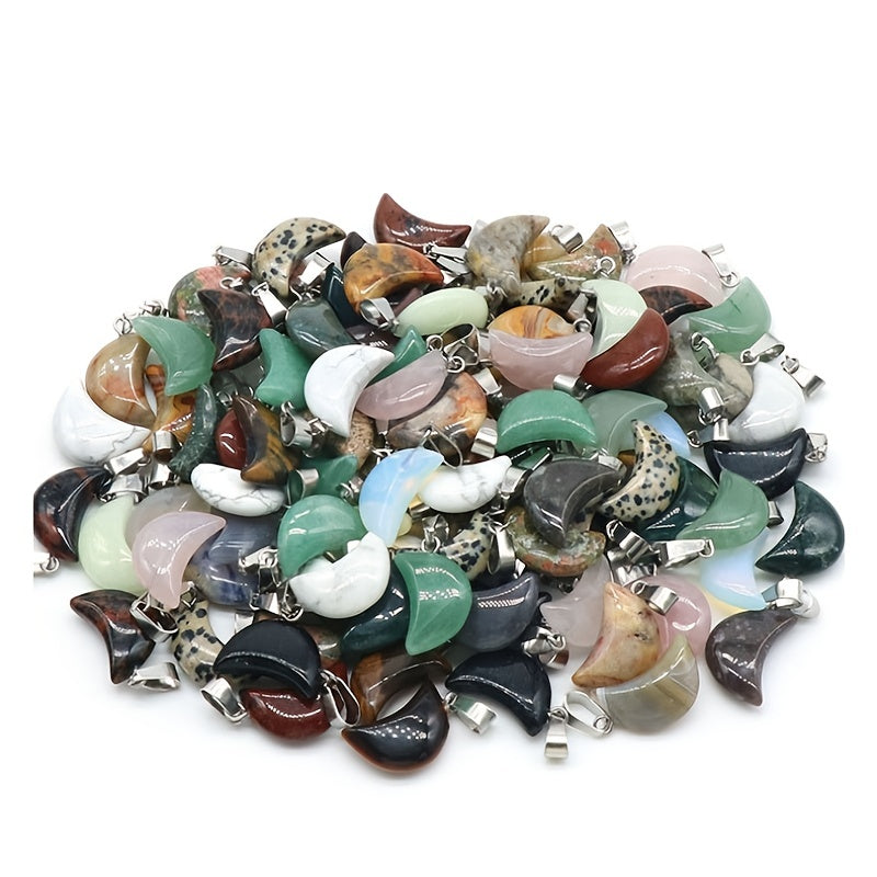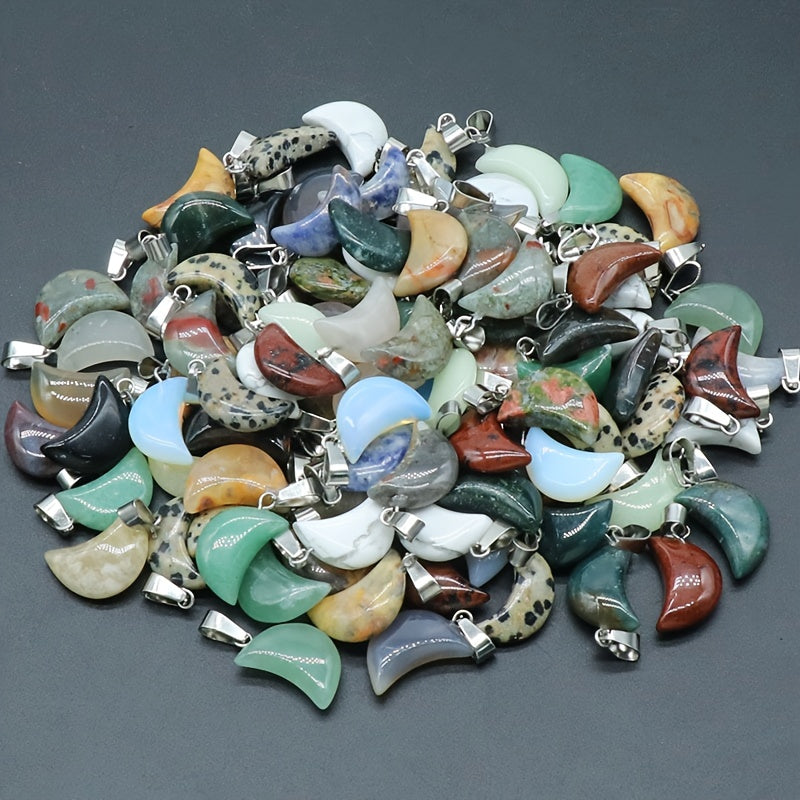 This set includes 10 small moon pendants made of natural crystal agate stones in assorted colors. Each pendant is unique and perfect for jewelry making or crafting projects.