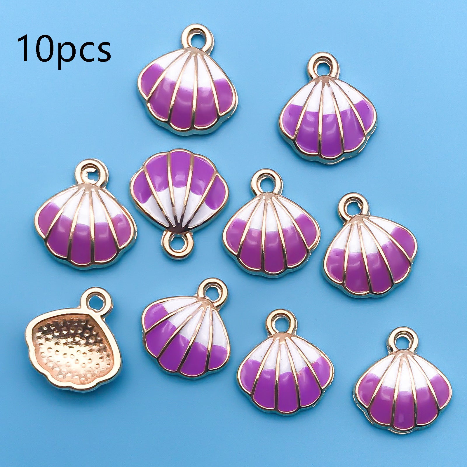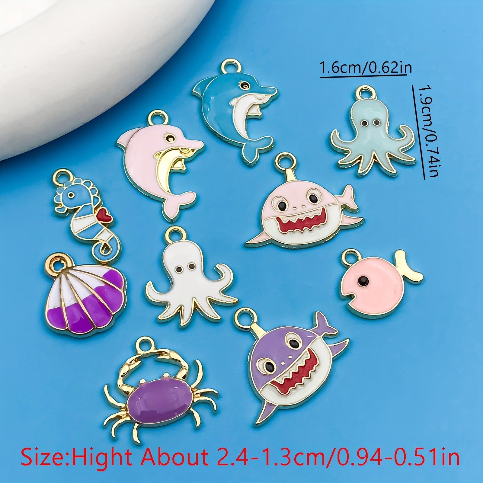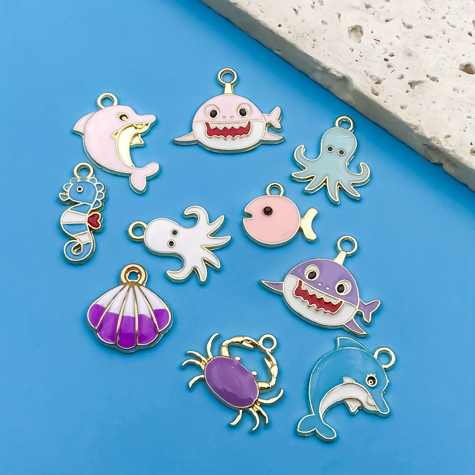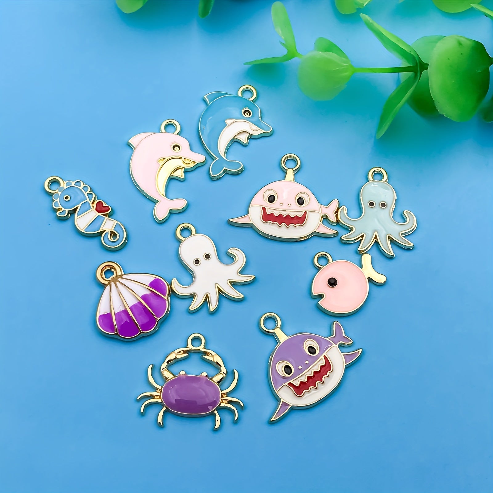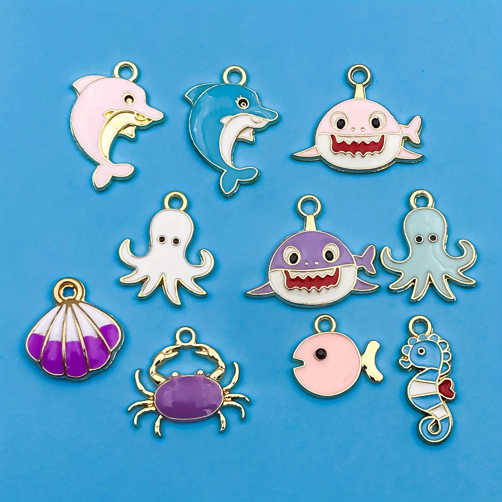 This set includes 10 zinc alloy enamel pendants featuring marine life designs such as dolphin, shark, seashell, and seahorse. Perfect for creating unique jewelry pieces.