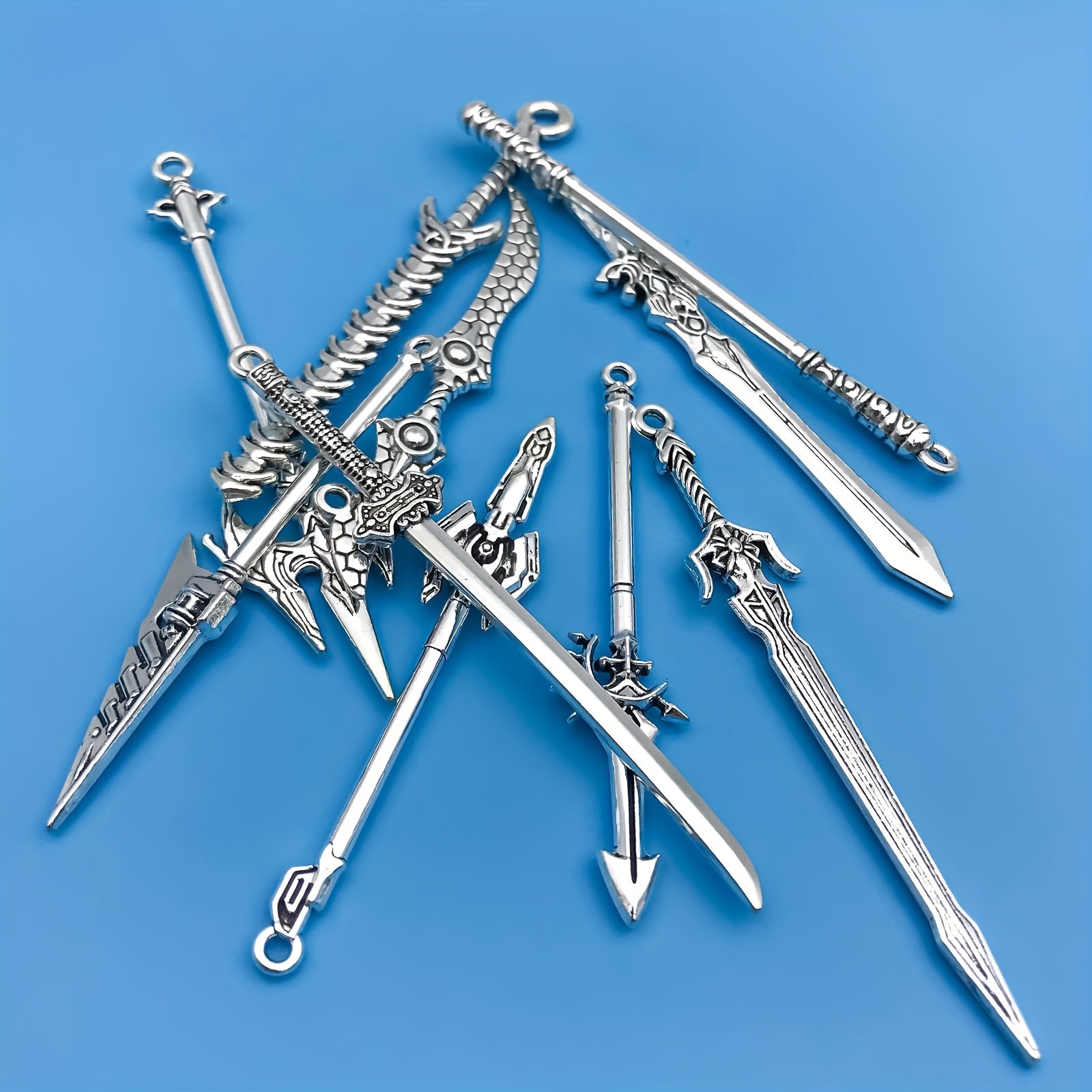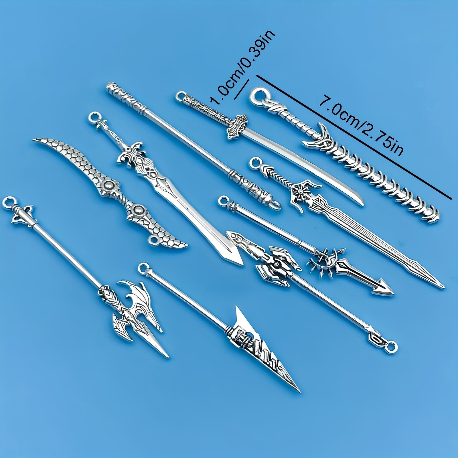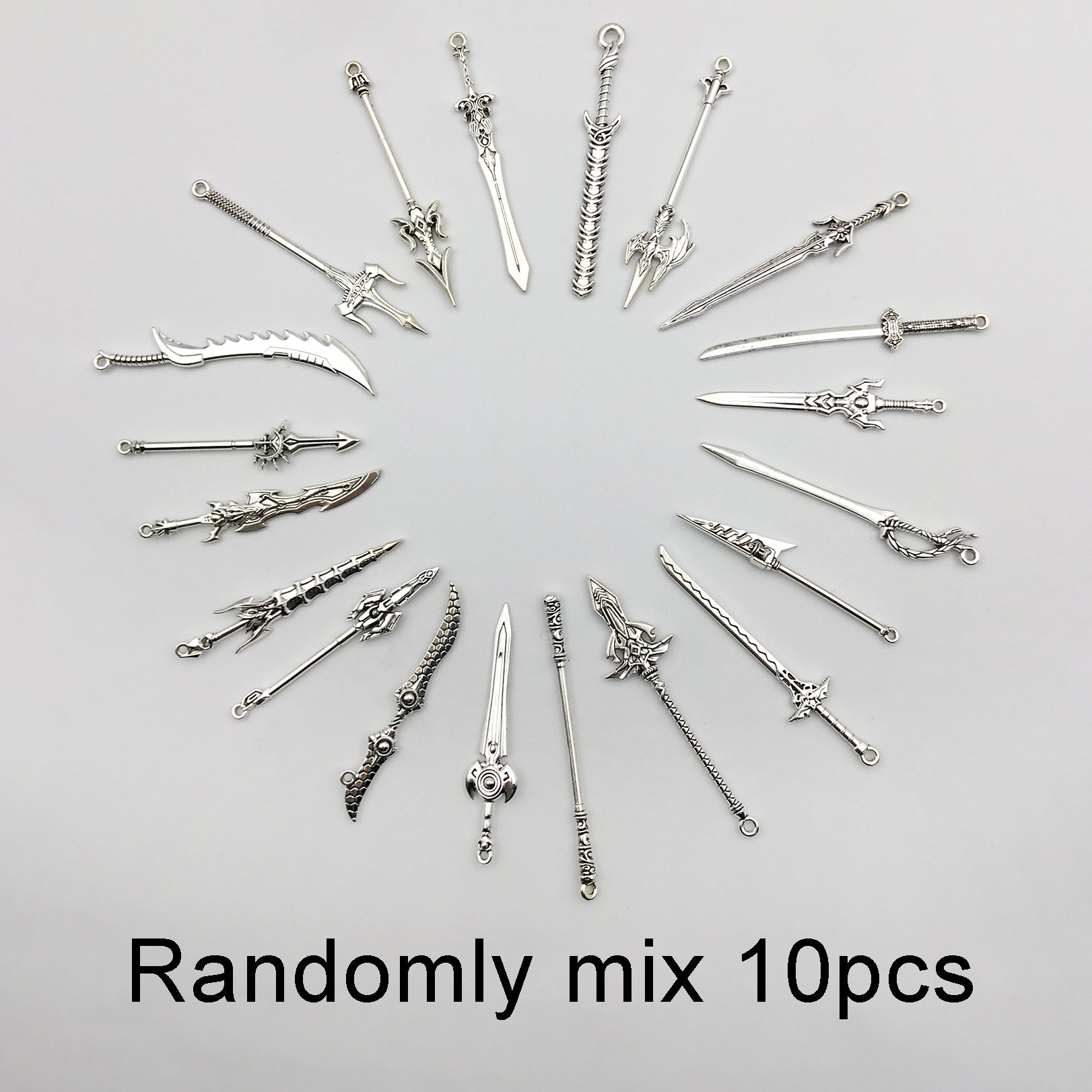 This set includes 10 randomly mixed zinc alloy antique silver charms in the shape of knight swords and guns, perfect for creating unique jewelry pieces.