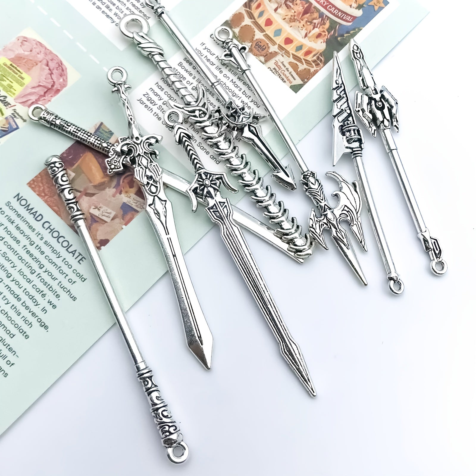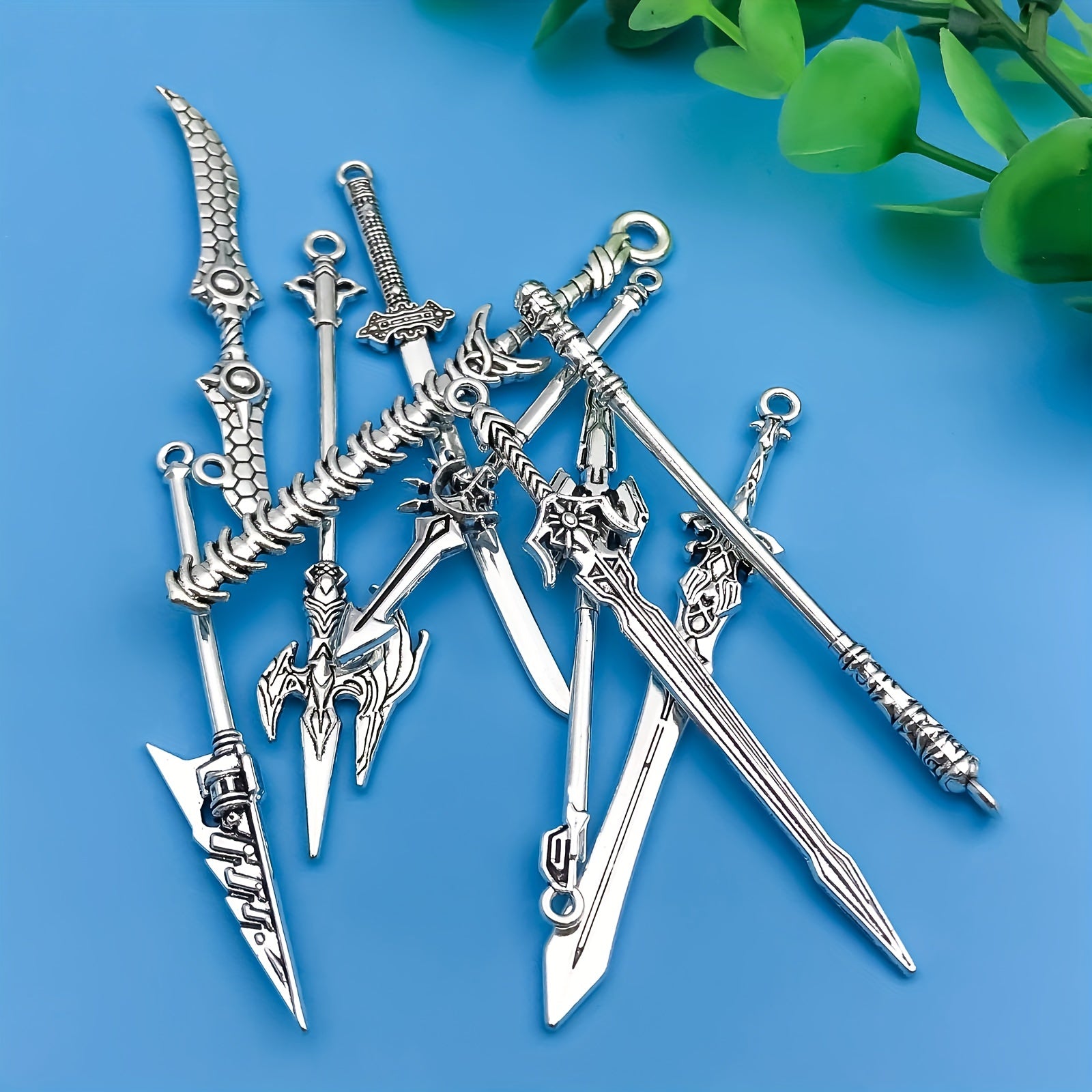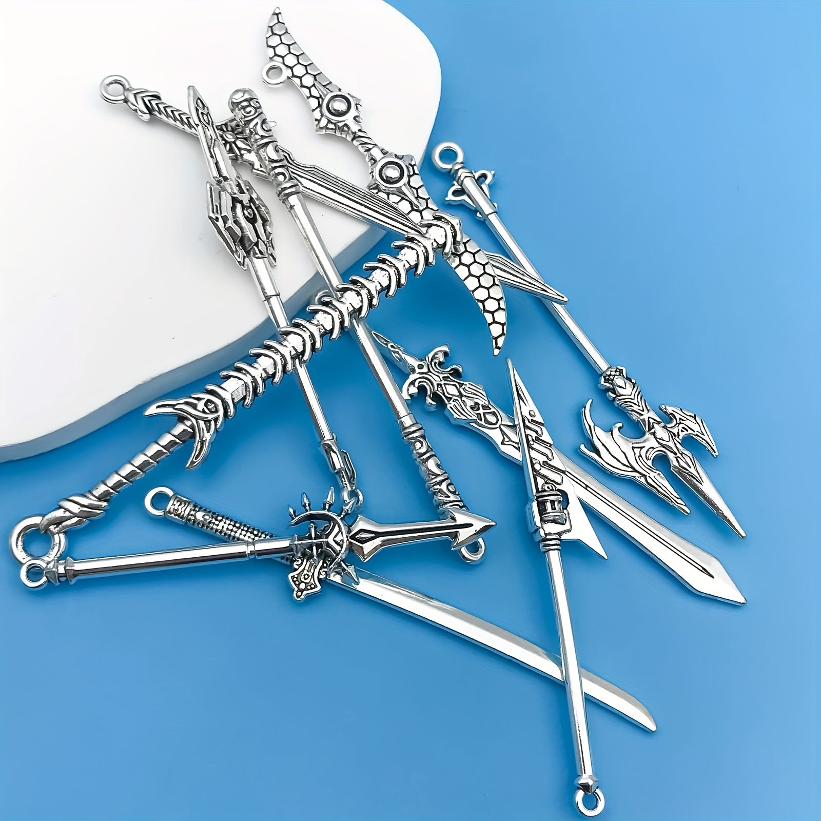 This set includes 10 randomly mixed zinc alloy antique silver charms in the shape of knight swords and guns, perfect for creating unique jewelry pieces.