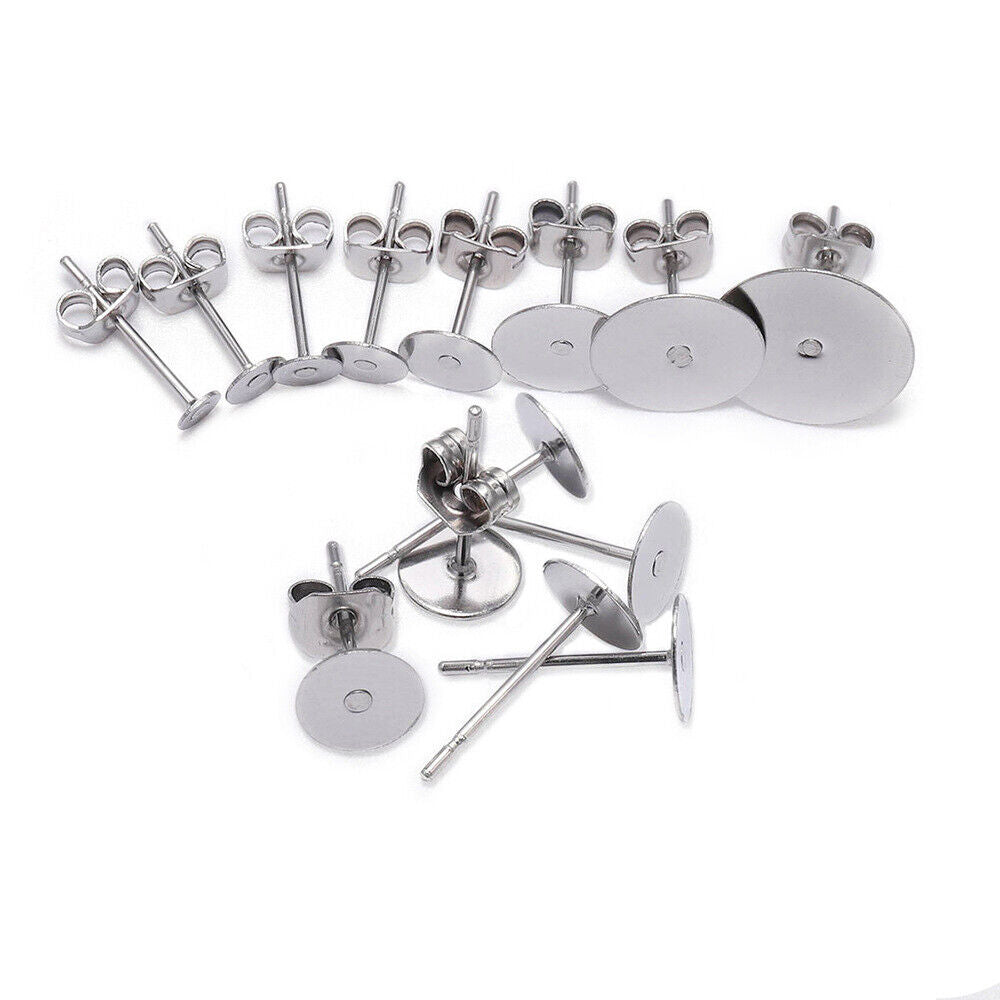 This pack includes 10 stainless steel earring needles with flat heads and butterfly plugs in golden or silvery color. Ideal for making earrings.