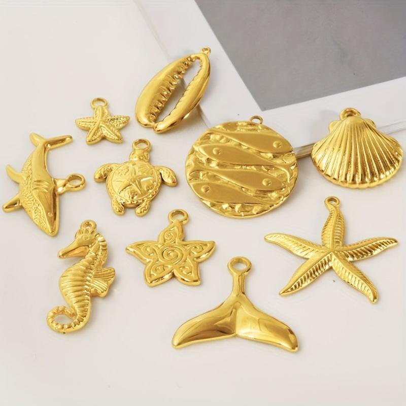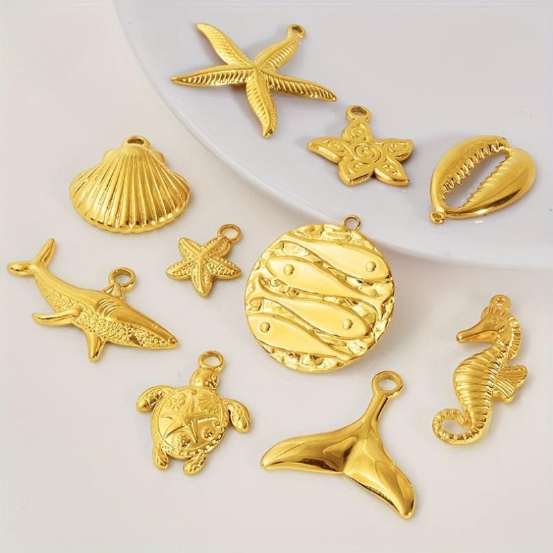 This set includes conch shell, starfish, turtle, fish, seahorse, and whale tail pendants made of stainless steel.