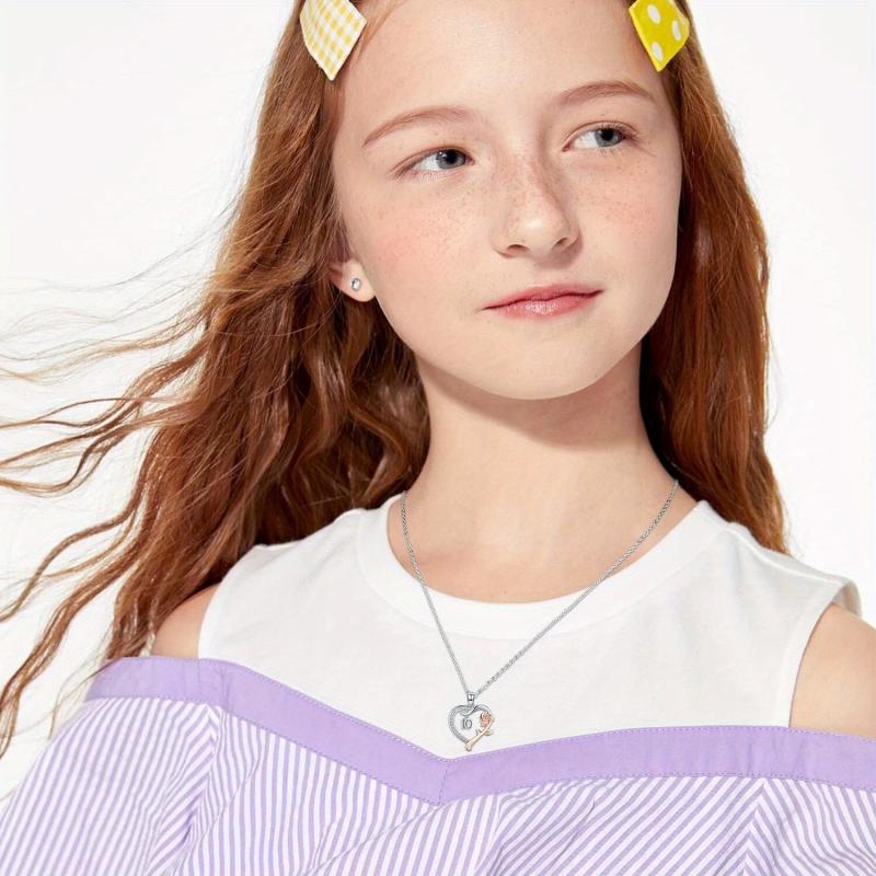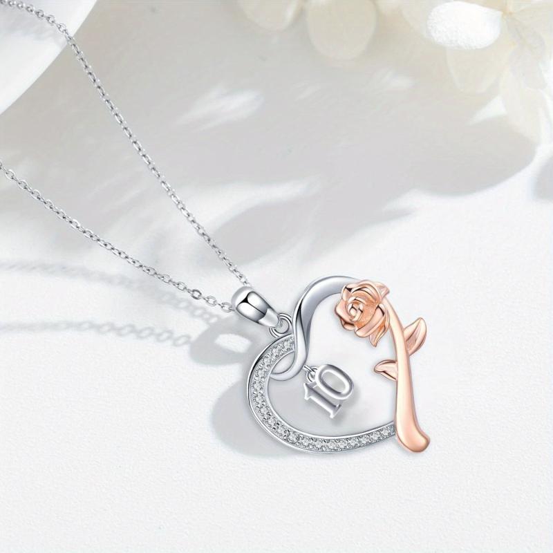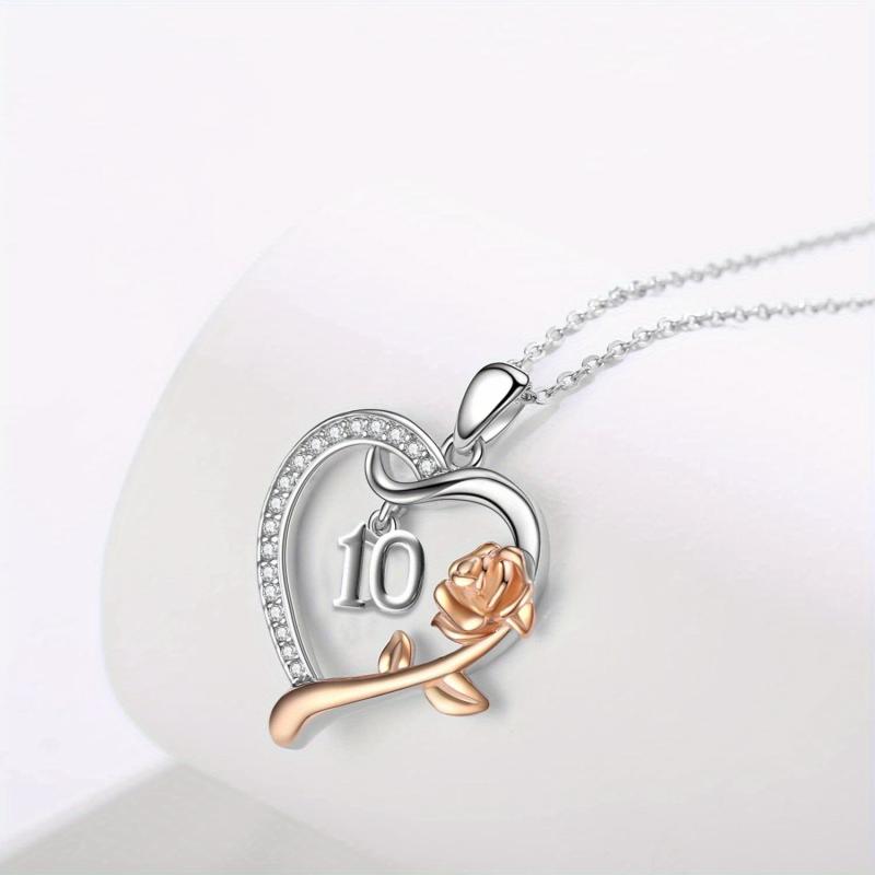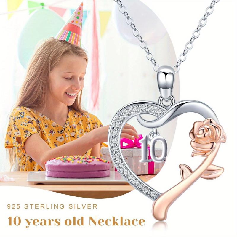 Celebrate a special 10th birthday with this beautiful rose flower heart necklace. Made of high-quality 925 sterling silver, this necklace features a number 10 charm and can be personalised with an initial. A perfect gift for a 10th birthday anniversary.